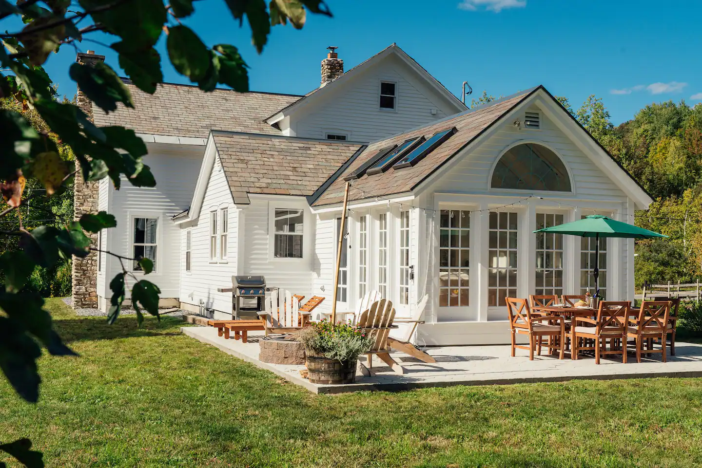 Situated just under a mile from Merck Forest & Farmland Center, a 3,200-acre estate with hiking trails and camping, White Doe Farm are a four-bedroom, three-bathroom farmhouse with an open-plan kitchen, living room with fireplace, front porch, back patio, and sunroom. You’ll find the house meticulously equipped with everything you could ever need, from bedding, towels, and slippers to cookware, toiletries, and firewood.