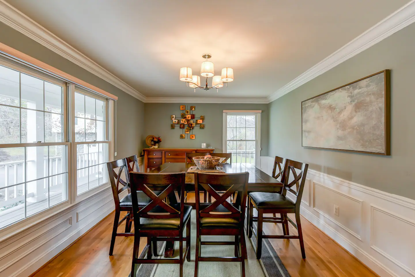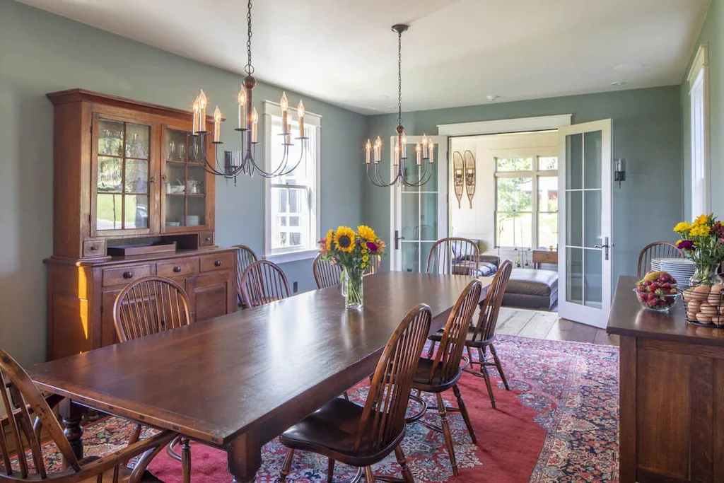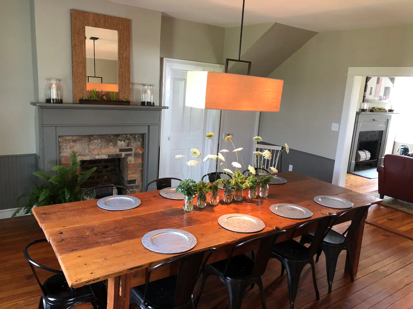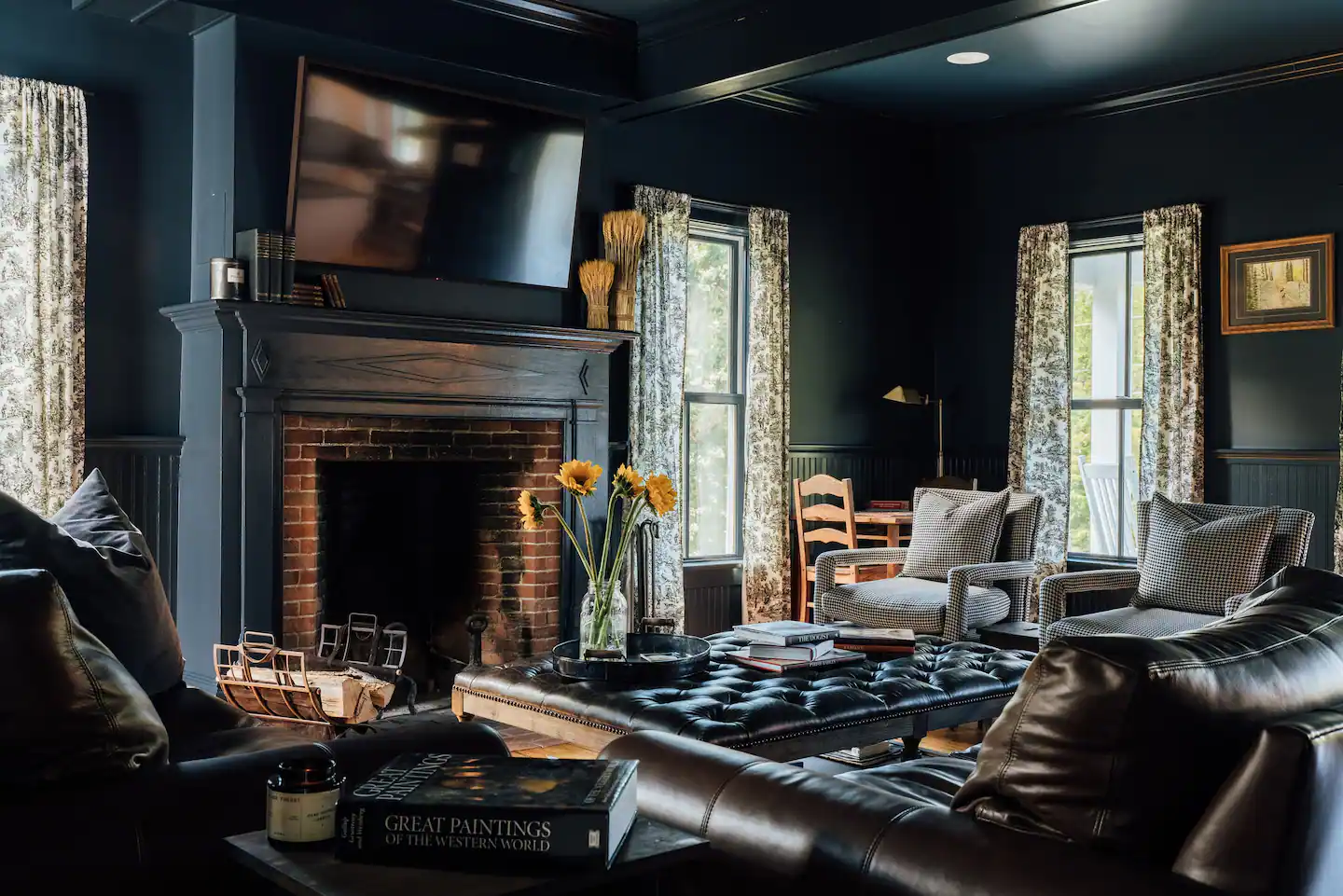After cooking a hearty breakfast using freshly-sourced ingredients from local purveyors, cozy up in the kitchen’s breakfast nook, where you’ll find a working wood-burning stove. Enjoy sitting in our dramatic Burgundy dining room just off the kitchen for formal lunches and dinners. Take post-dinner drinks into the spacious navy sitting room, outfitted with plenty of cozy touches, like wide leather couches, plush blankets, and an oversized ottoman directly in front of the fireplace. A 55-inch smart TV has Netflix, Hulu, DirectTV, and all the other channels you could wish for. WiFi is, of course, provided throughout the entire house.