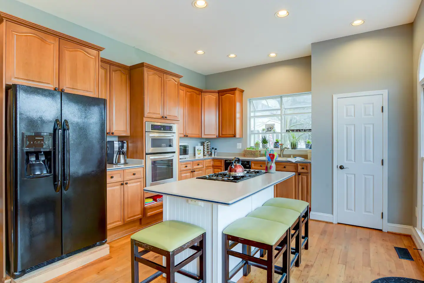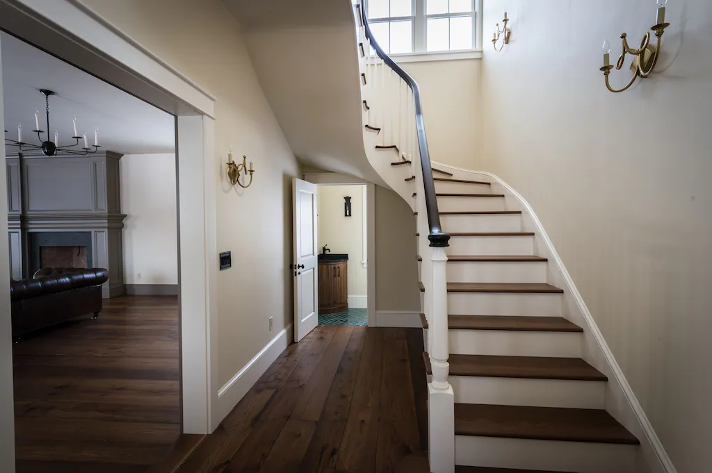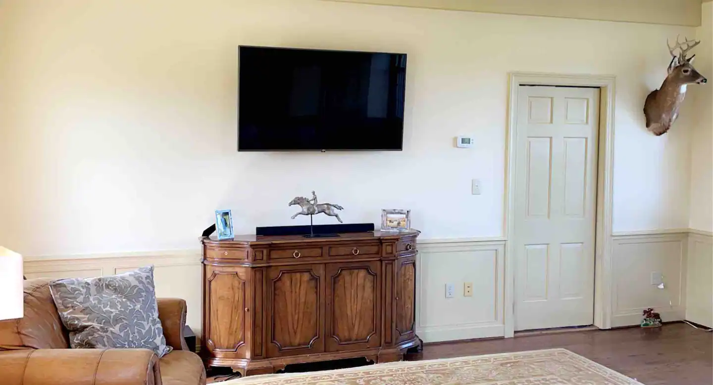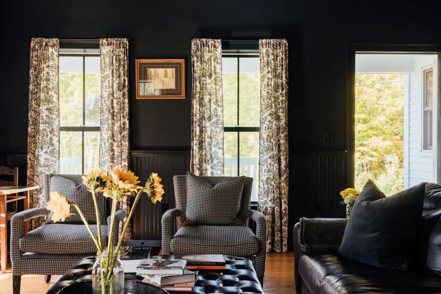 After cooking a hearty breakfast using freshly-sourced ingredients from local purveyors, cozy up in the kitchen’s breakfast nook, where you’ll find a working wood-burning stove. Enjoy sitting in our dramatic Burgundy dining room just off the kitchen for formal lunches and dinners. Take post-dinner drinks into the spacious navy sitting room, outfitted with plenty of cozy touches, like wide leather couches, plush blankets, and an oversized ottoman directly in front of the fireplace. A 55-inch smart TV has Netflix, Hulu, DirectTV, and all the other channels you could wish for. WiFi is, of course, provided throughout the entire house.