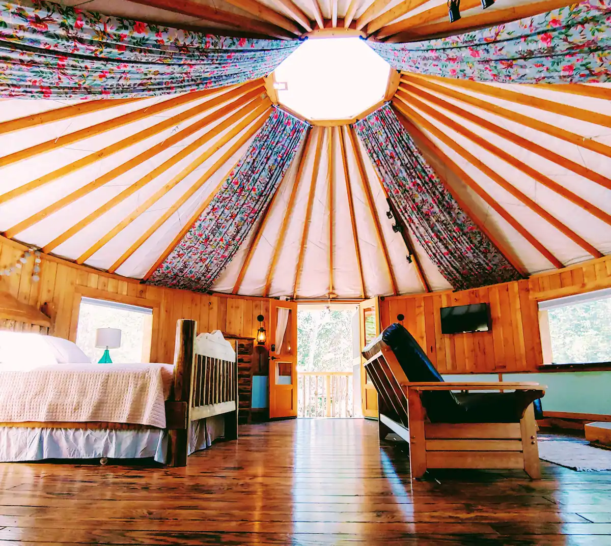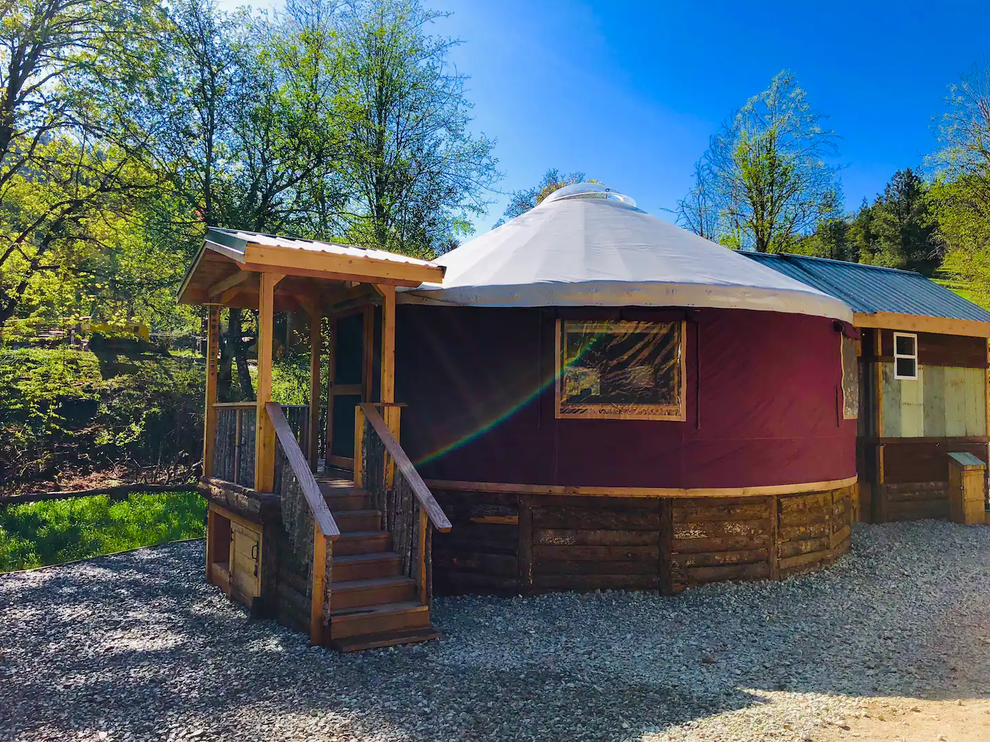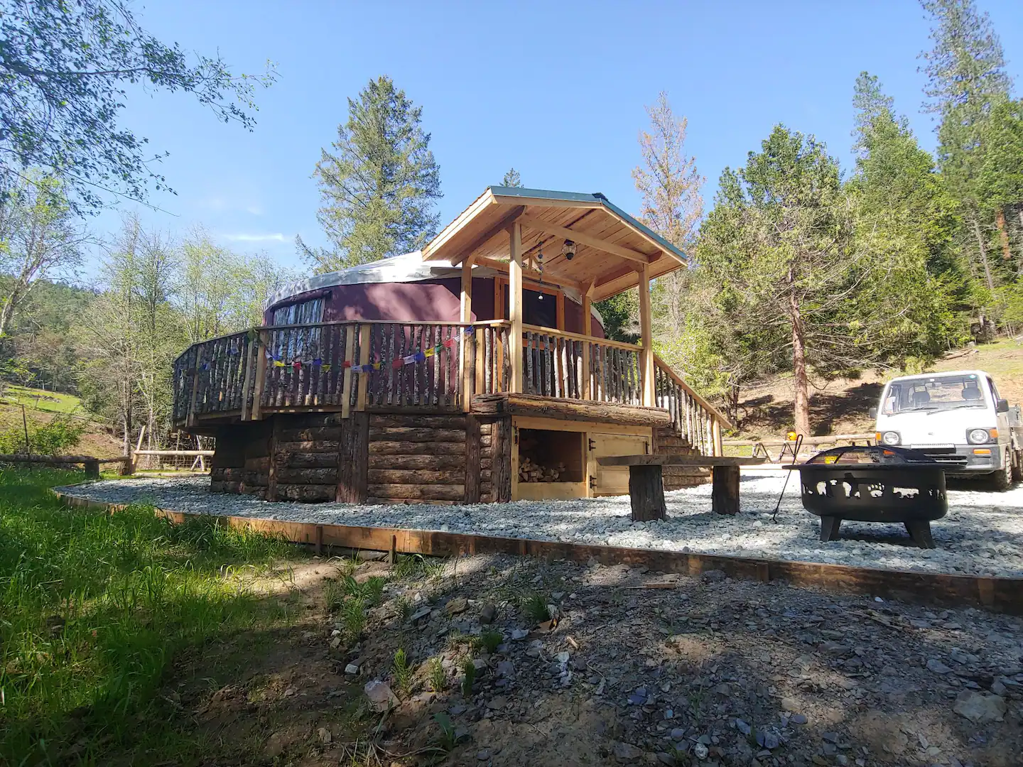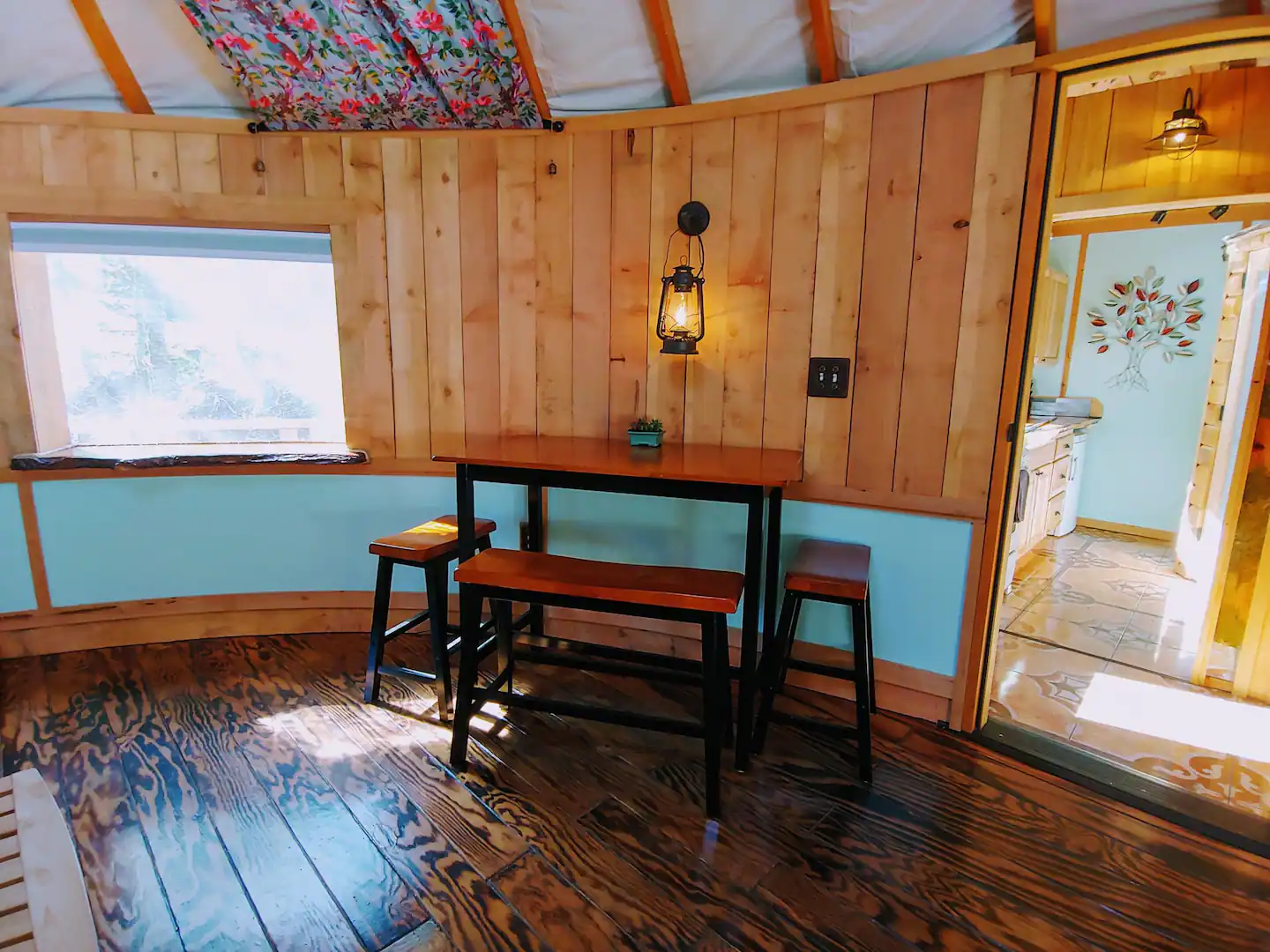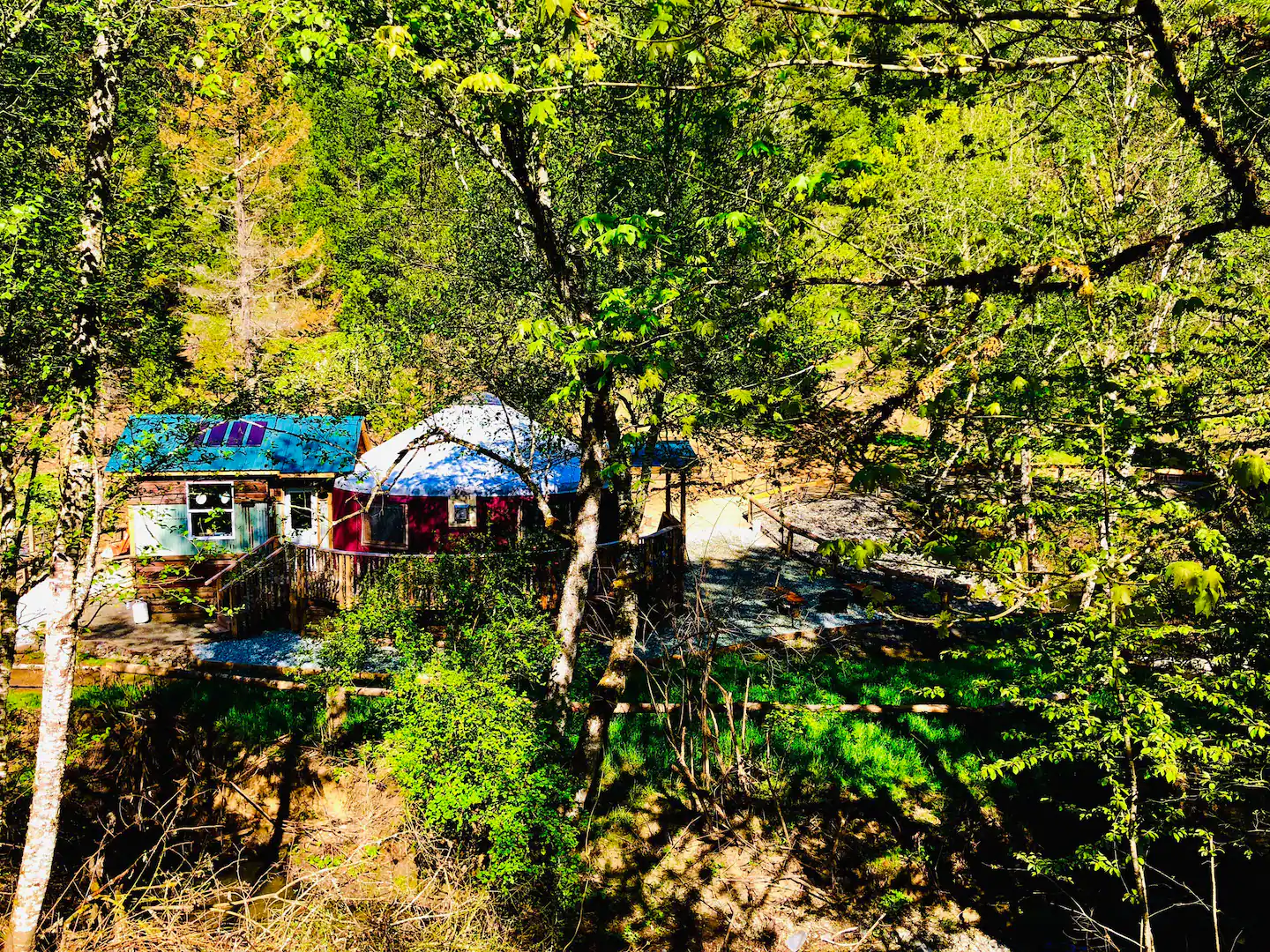 24′ Yurt & attached Tiny house is opulent! Indoor bathroom & kitchen, Glamping at its finest! We provide all the essentials for a restful stay in the forests with a running creek outside your door. Including farm-fresh organic eggs & sausages (from our Farm!), pastry, yogurt, fruit, juice, hot cereal, coffee & more. We have High-speed WIFI, phone & TV, A fire pit and a sitting area.