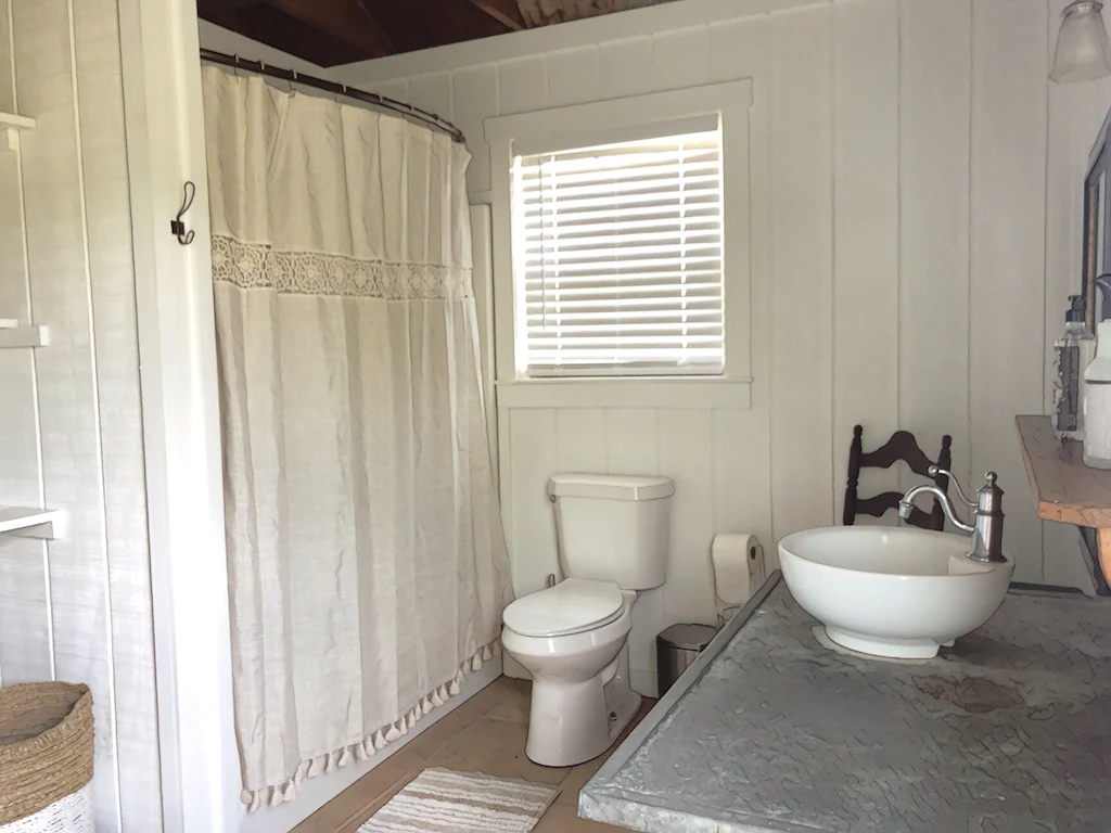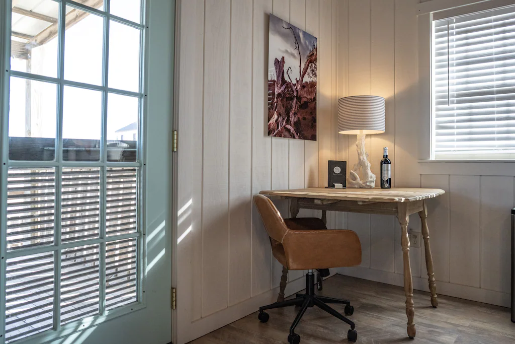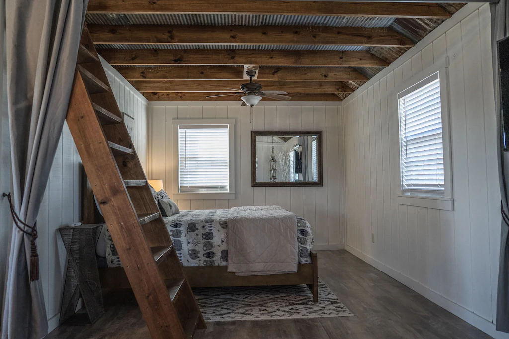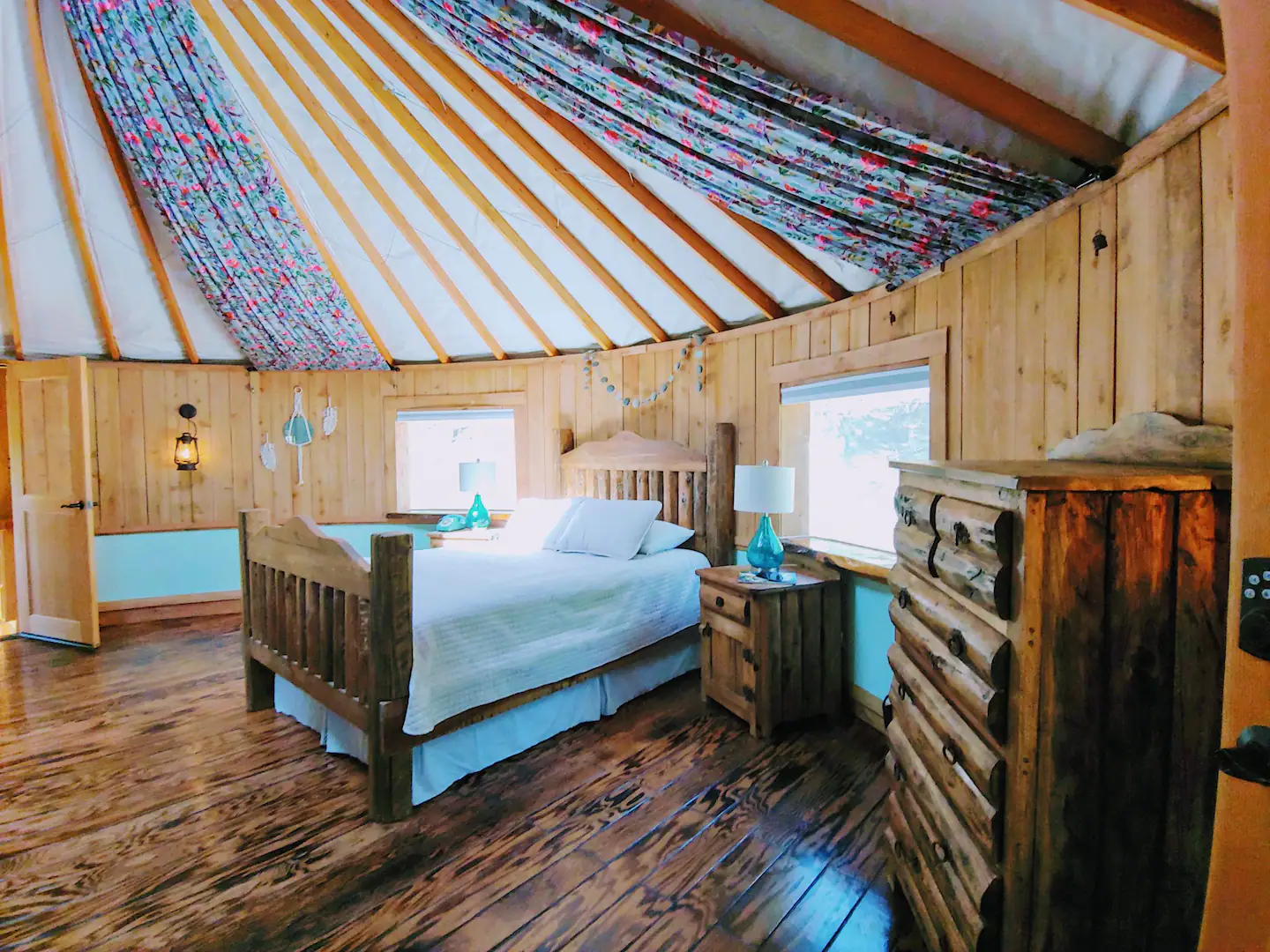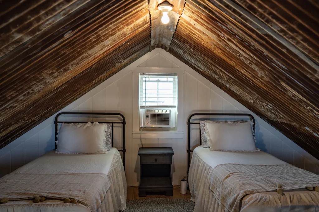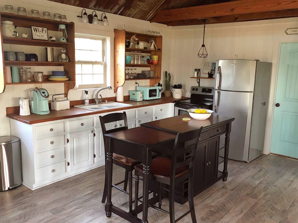 This chic rental property in Texas is perfect for couples who’d enjoy a wine country getaway or for small families who’d appreciate unplugging and relaxing in a peaceful yard of a homey farmhouse. This lovely home features a hot tub to unwind in, a BBQ pit, and a spacious porch where the family can watch glorious sunsets with farm animals. If you don’t want to totally unplug from technology, this farmhouse also has Wi-Fi for work or remote learning for the kids.