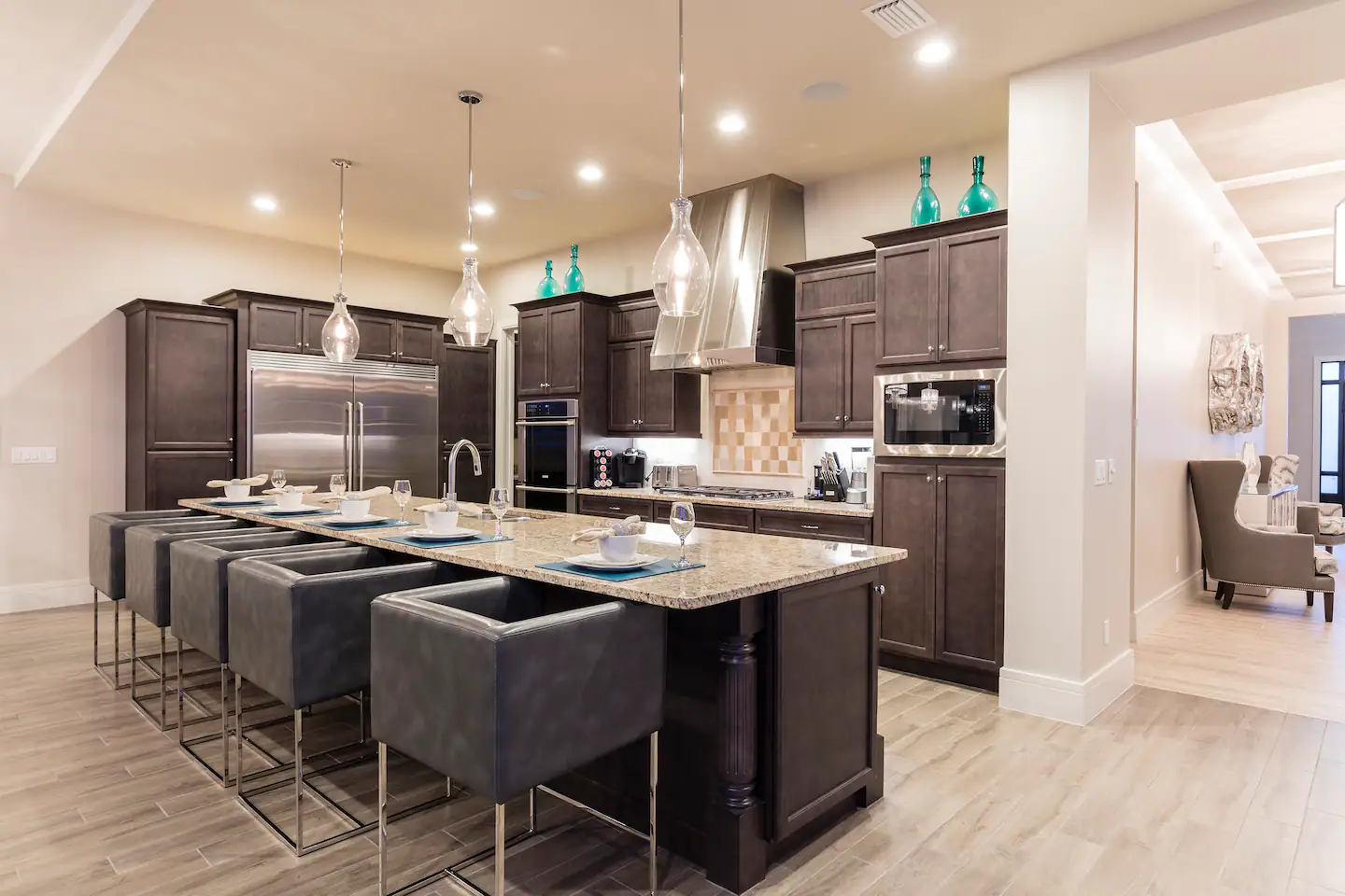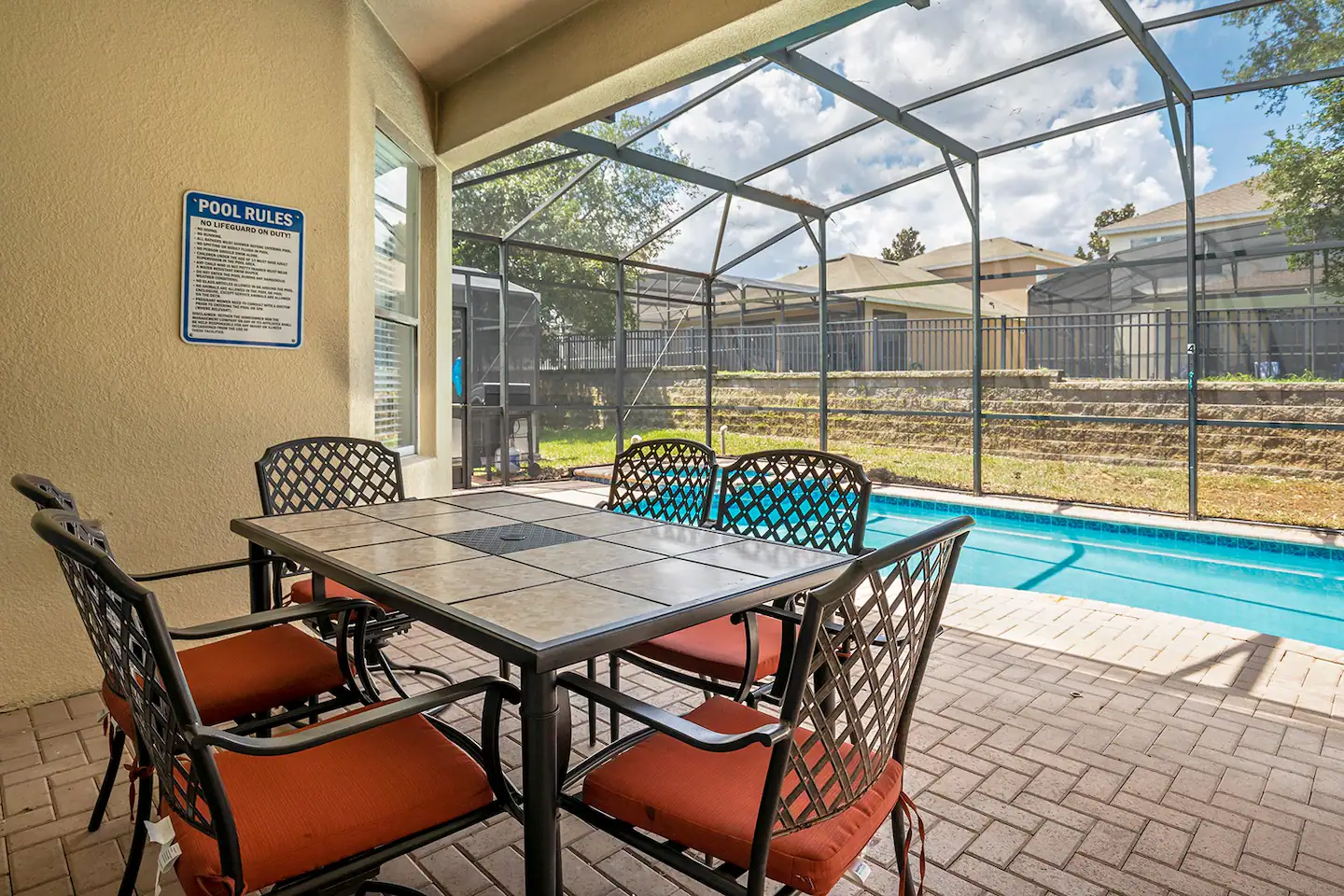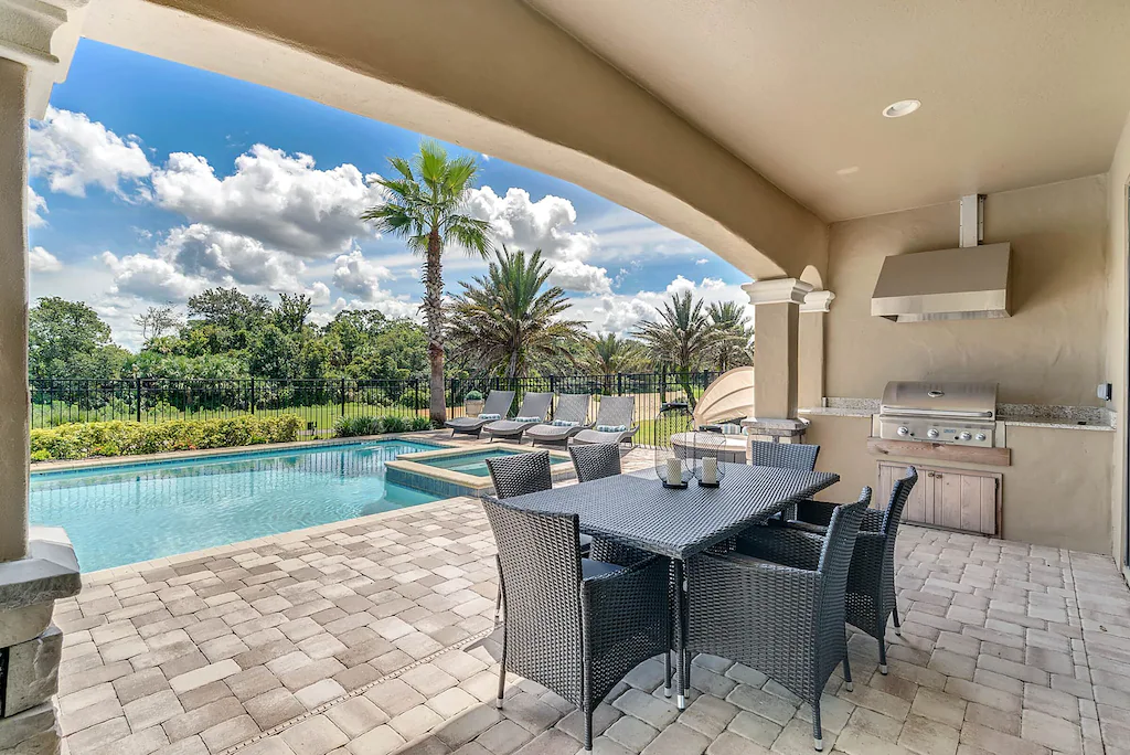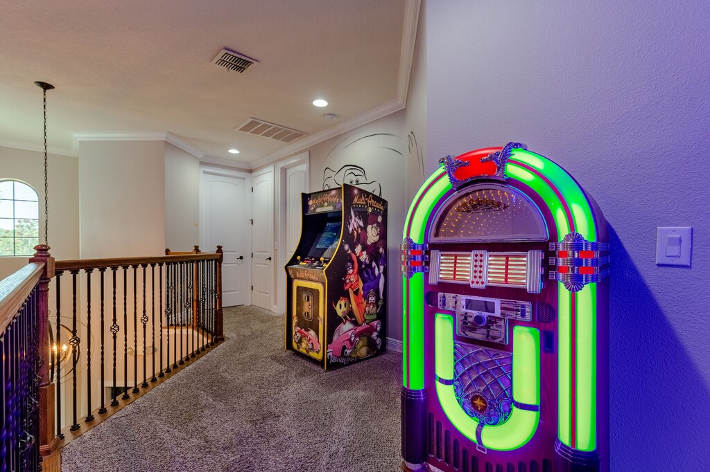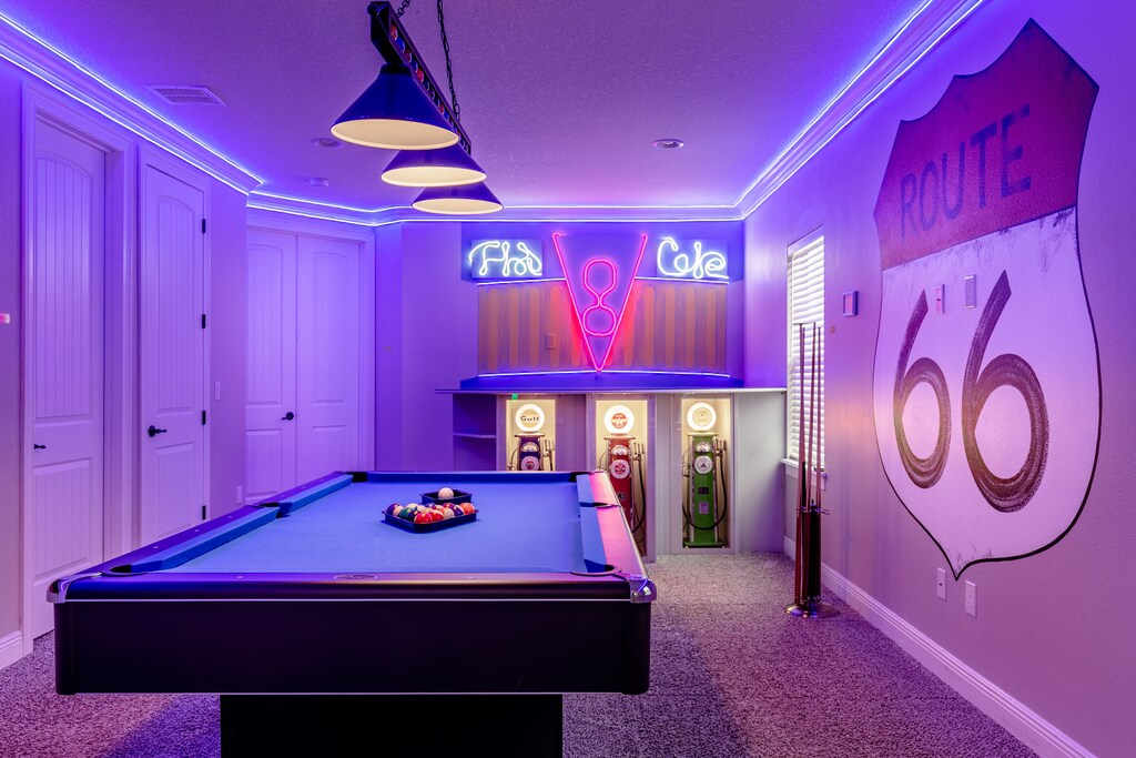 As you enter this villa, you will be greeted by the natural light and large open-concept layout. The living area is perfect for the entire family to relax and unwind while enjoying the 65-inch SMART TV with comfy and ample sofa seating. The villa has a fully equipped kitchen with granite countertops, stainless steel appliances, and everything you need to prepare delicious meals or quick snacks. The kitchen also features a breakfast bar with seating for 4. Adjacent to the living area, the dining area features a beautiful dining table with seating for up to 10 guests. There is a half bathroom and laundry room located on the first floor.Head through the large sliding doors to soak up all the Florida sun in the private pool and spillover spa. The pool area features 4 sun loungers, a sofa, relaxing chairs, and a fenced-in pool with a self-closing door. You can also dine al fresco with a meal straight off the built-in BBQ grill and outdoor dining table with seating for 6. If you want more relaxation, head towards the first floor’s custom theater/game room. The custom theater/game room features theater seats for 7, perfect for hosting a movie night. It also has a Star Wars Trilogy Arcade game to keep everyone entertained. There is more entertainment on the second floor for all to enjoy. As you head upstairs enter the diner-themed game room filled with neon lights. You can play a friendly pool competition in the chrome pool table or just sit back and relax with a 60-inch TV, two 43-inch TV, bar, and bar seating. There is also a multi-arcade platinum version with over 1,000 games to entertain you all day.