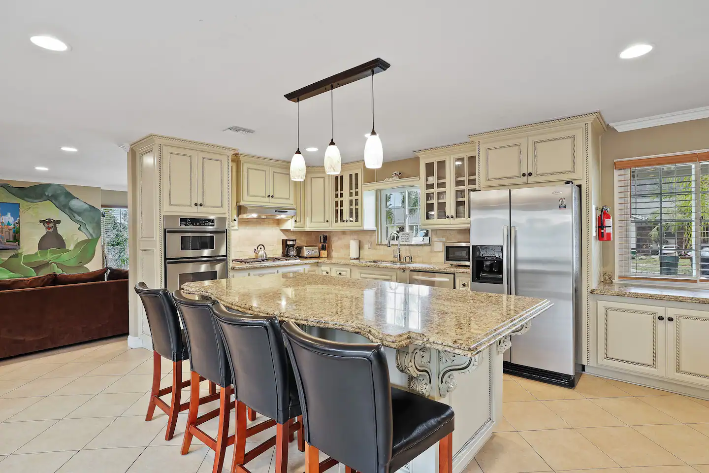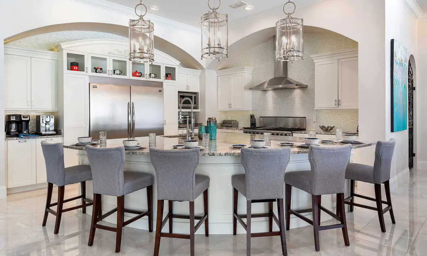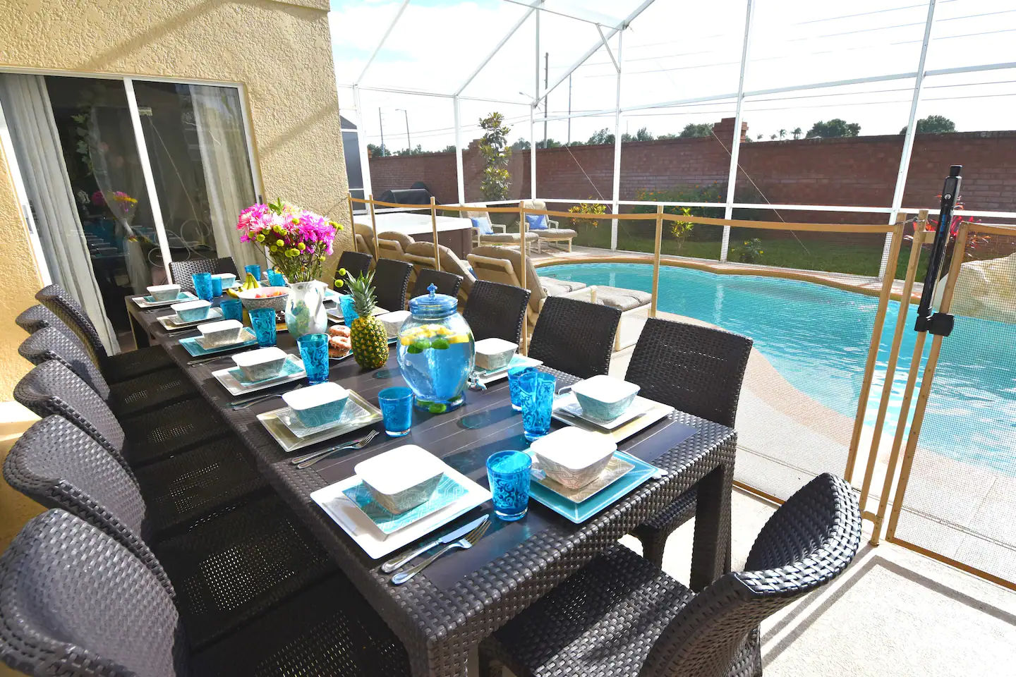As you enter this villa, you will be greeted by the natural light and large open-concept layout. The living area is perfect for the entire family to relax and unwind while enjoying the 65-inch SMART TV with comfy and ample sofa seating. The villa has a fully equipped kitchen with granite countertops, stainless steel appliances, and everything you need to prepare delicious meals or quick snacks. The kitchen also features a breakfast bar with seating for 4. Adjacent to the living area, the dining area features a beautiful dining table with seating for up to 10 guests. There is a half bathroom and laundry room located on the first floor.Head through the large sliding doors to soak up all the Florida sun in the private pool and spillover spa. The pool area features 4 sun loungers, a sofa, relaxing chairs, and a fenced-in pool with a self-closing door. You can also dine al fresco with a meal straight off the built-in BBQ grill and outdoor dining table with seating for 6. If you want more relaxation, head towards the first floor’s custom theater/game room. The custom theater/game room features theater seats for 7, perfect for hosting a movie night. It also has a Star Wars Trilogy Arcade game to keep everyone entertained. There is more entertainment on the second floor for all to enjoy. As you head upstairs enter the diner-themed game room filled with neon lights. You can play a friendly pool competition in the chrome pool table or just sit back and relax with a 60-inch TV, two 43-inch TV, bar, and bar seating. There is also a multi-arcade platinum version with over 1,000 games to entertain you all day.