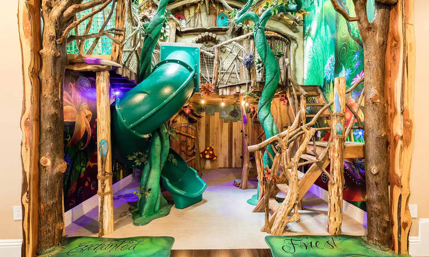 An enchanted forest-themed two-level playroom with a children’s second-story slide, conveniently located off of the loft area for parental supervision of little ones;