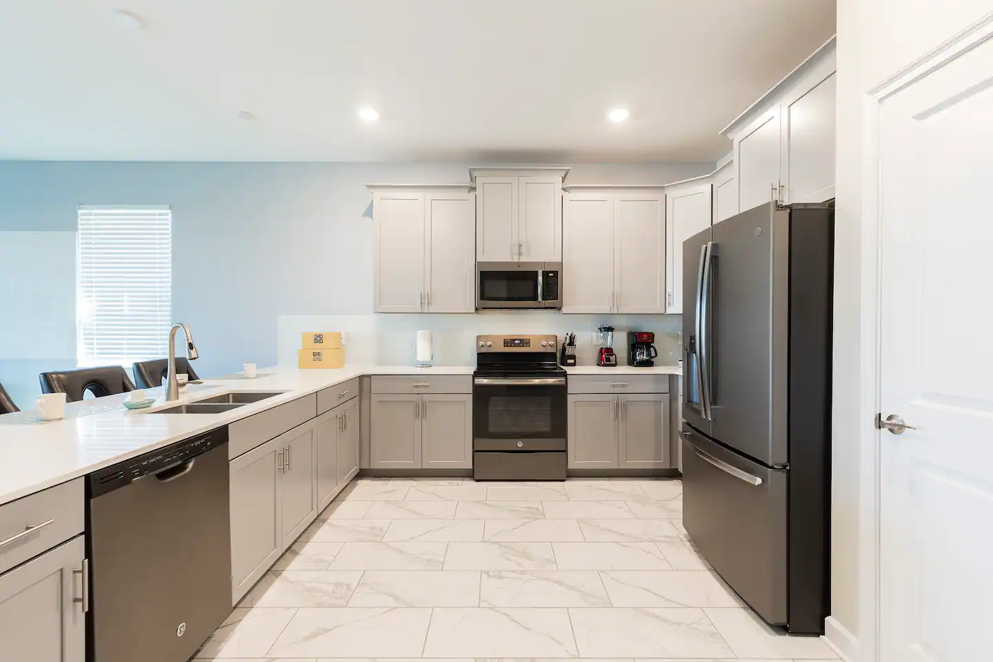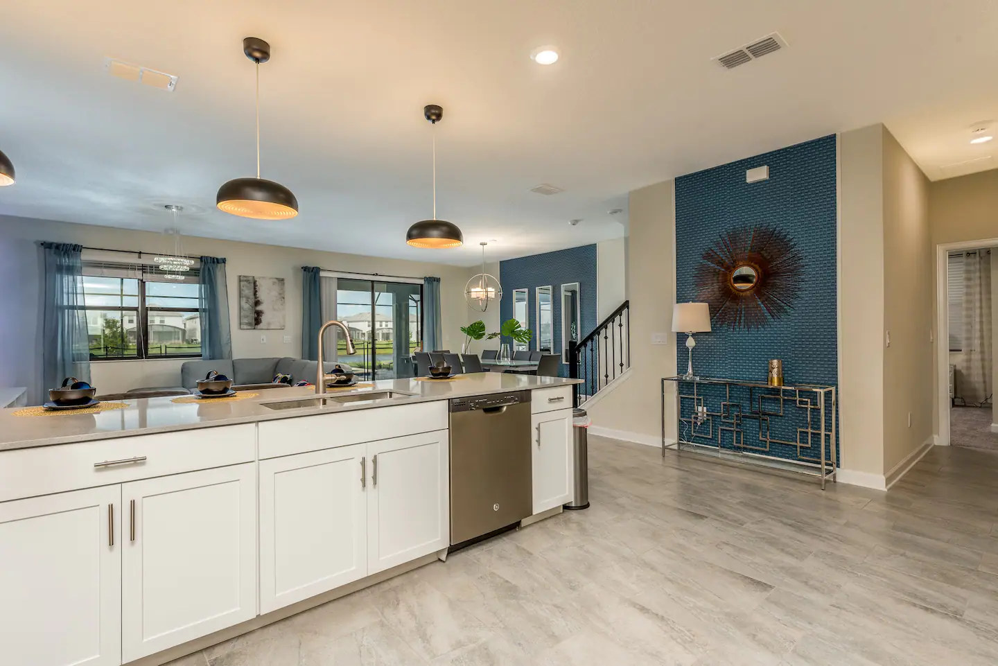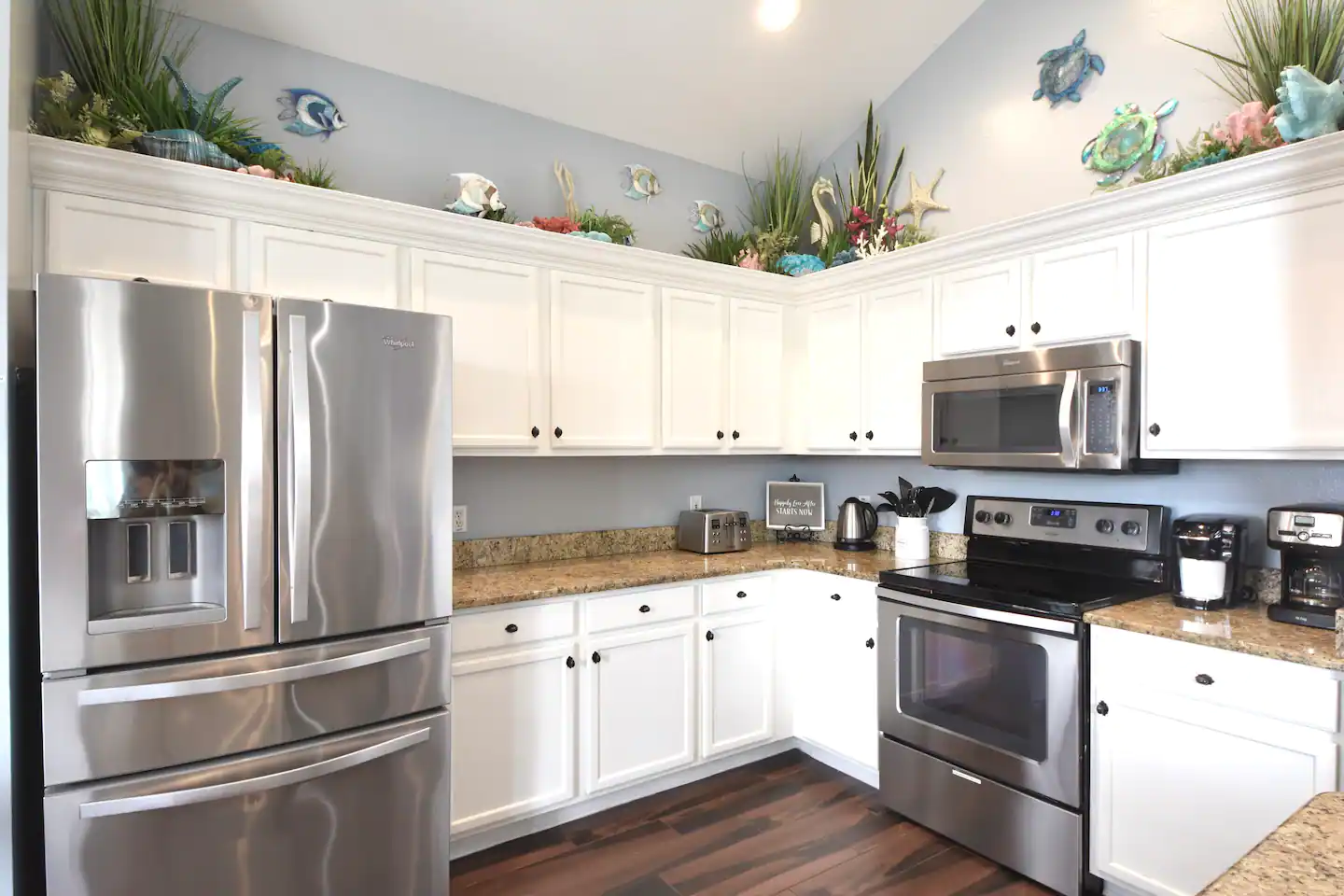 Relax and unwind in the spacious pool area, surrounded by nature and wildlife, or gather on the covered lanai with comfortable furniture for your entire group. The home has been recently updated with new furniture, paint, kitchen cabinets, and all the amenities you could ask for. You’ll find a Harry Potter-themed game room with a 75″ smart TV! Plus, for extra fun, a golf cart is available to explore the resort’s fantastic amenities. We’ve poured our hearts into making this your dream vacation home, and we can’t wait to share it with you!