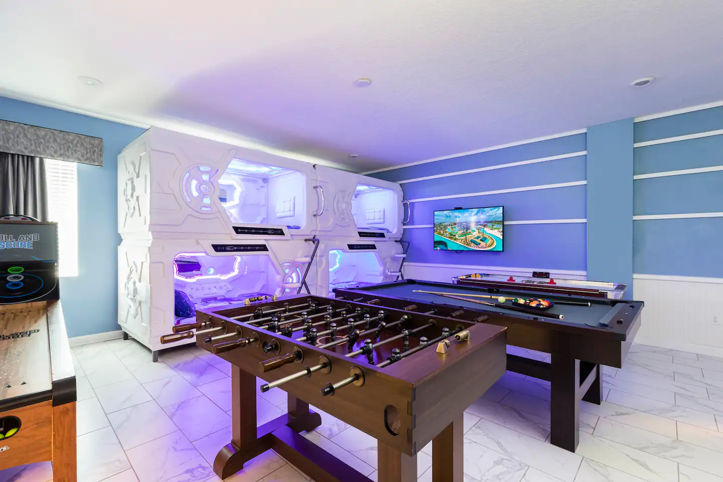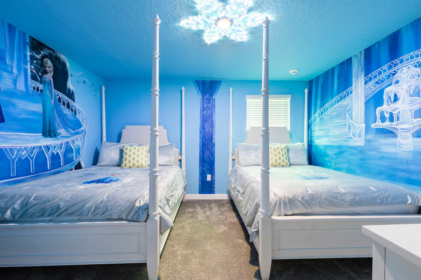 This Luxury Villa in Storey Lake has the best location in Central Florida’s resort-style communities. It has 8 luxury bedrooms, each equipped with Smart HD TVs. It not only has a large Space themed Game Room with unique Space Bunk Beds that sleep 4 and gaming tables including Pool Table, Air Hockey, and Foosball but also have a Luxury Home Theater with 120″ Screen and 10 Reclining Leather Seats on 3 Tiers!The best part is the Star Wars Themed Bedroom with a unique Custom “Millennium Falcon” Bed and the “Frozen” Themed Bedroom with 2 queen princess beds.