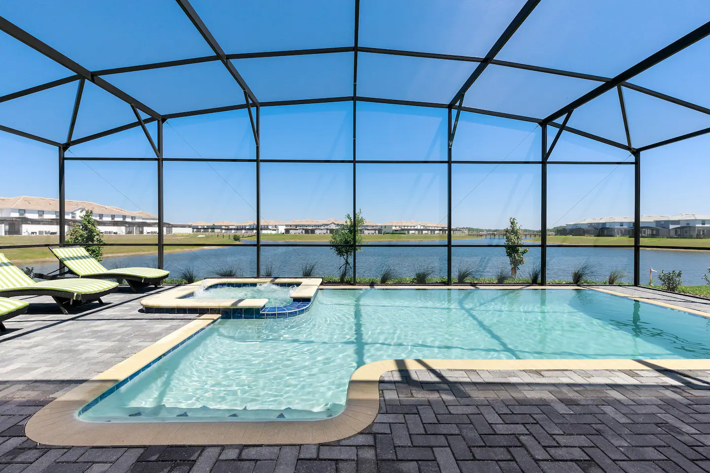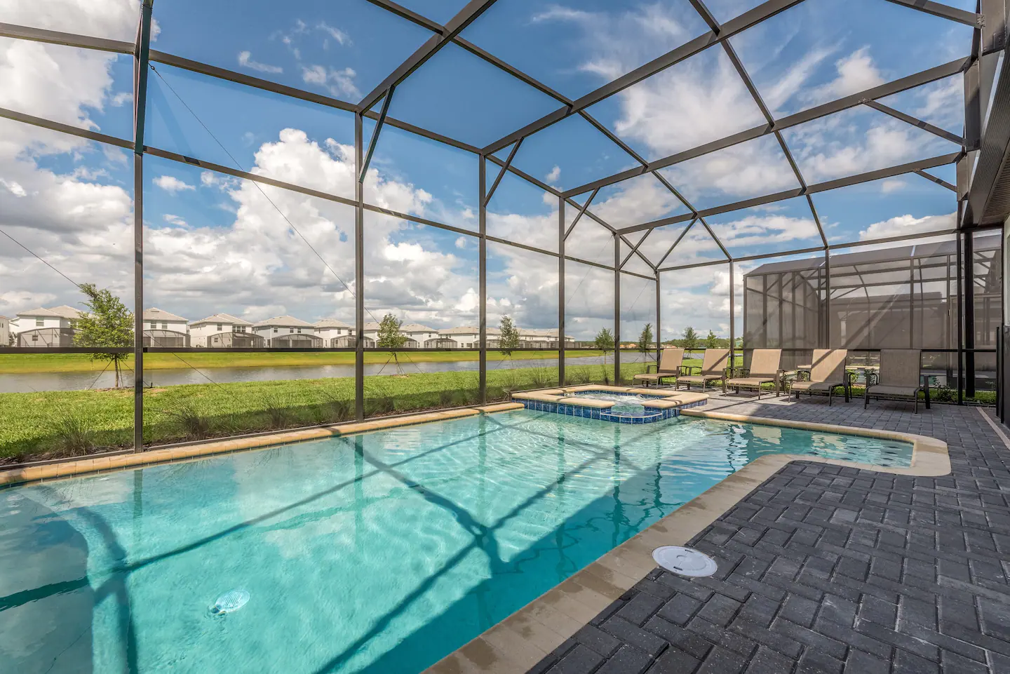 Private Pool/Spa* area has a Patio Table Seating for 8, an Outdoor Sectional Sofa, and 4 Pool Loungers with the View of Storey Lake.