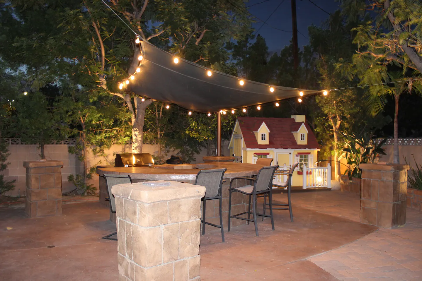 This spacious home provides ample room for everyone to spend time together or to enjoy in smaller groups. There is a fully equipped kitchen with a large island. We have everything you need to make a five-course meal, or you may choose to cook outdoors with our natural gas grill and bar. Gather around and have a hot cup of coffee from the Keurig (K-cups provided) at the kitchen island, the large dining table, the patio dining table, or the outside bar around the grill and outdoor mini fridge.Enjoy your own personal oasis/backyard. You can spend hours in the rock pool with its waterfalls and slide (pool toys and floaties provided).