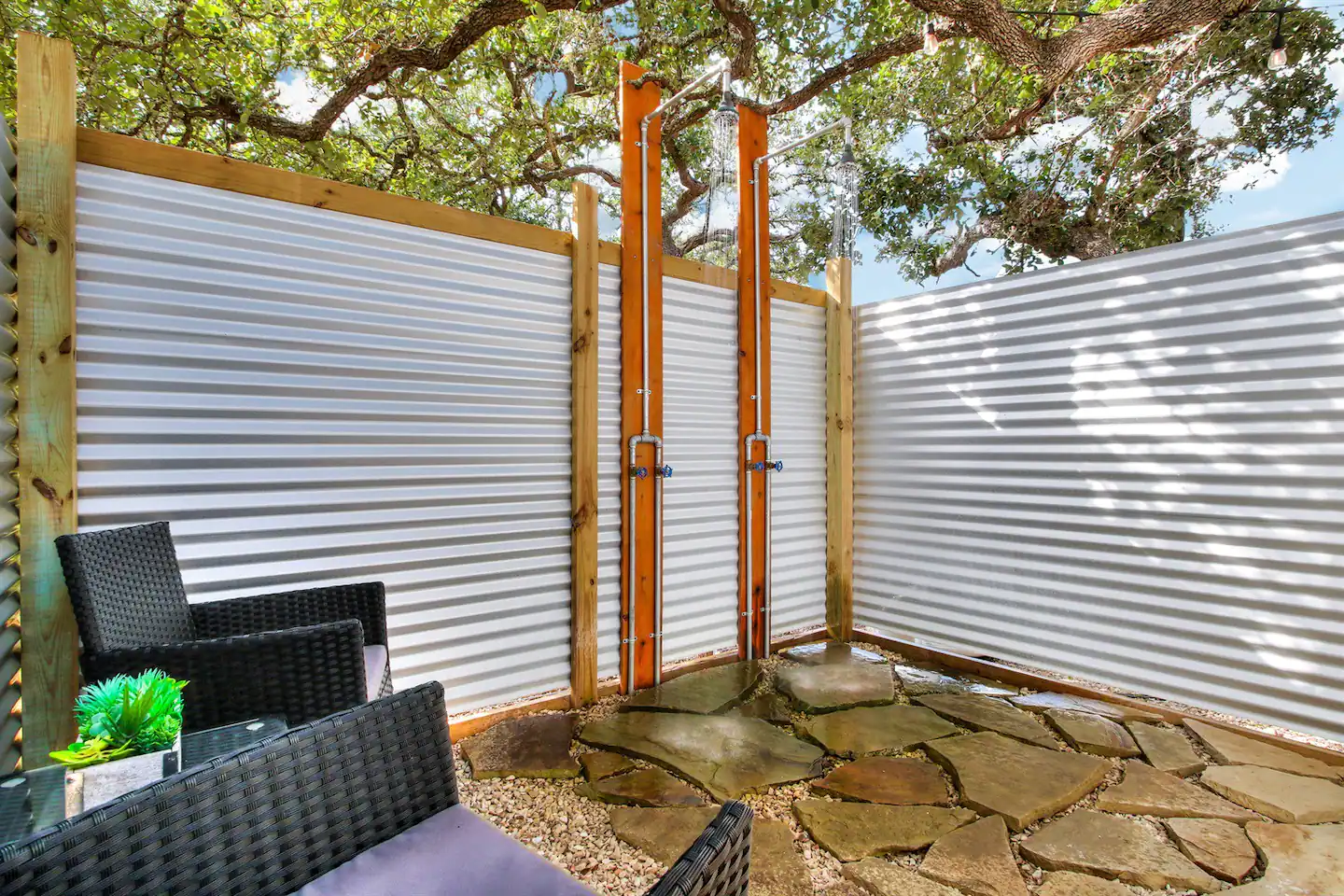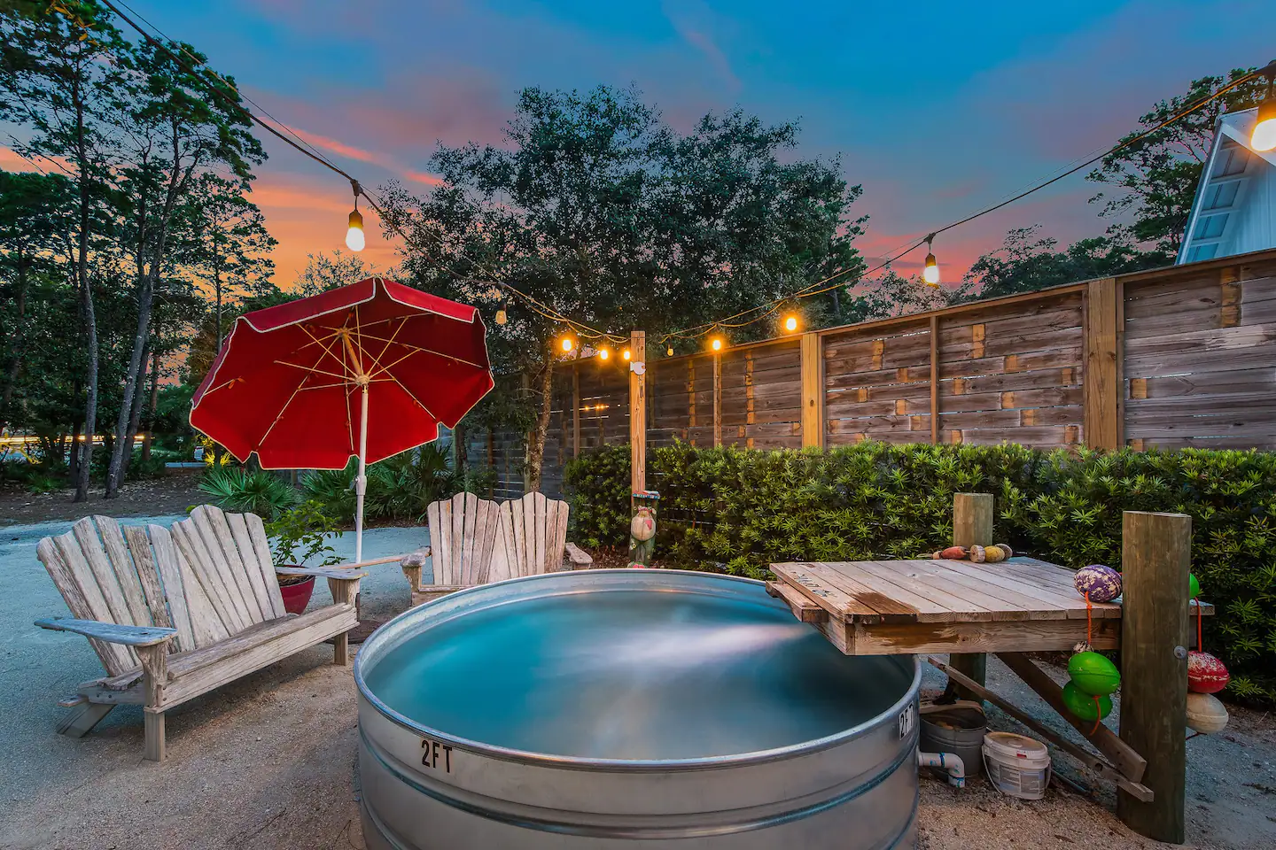 Outside you will find a darling outdoor living space with string lights, a plunge pool, a BBQ grill, an outdoor shower, and a washer/dryer.
