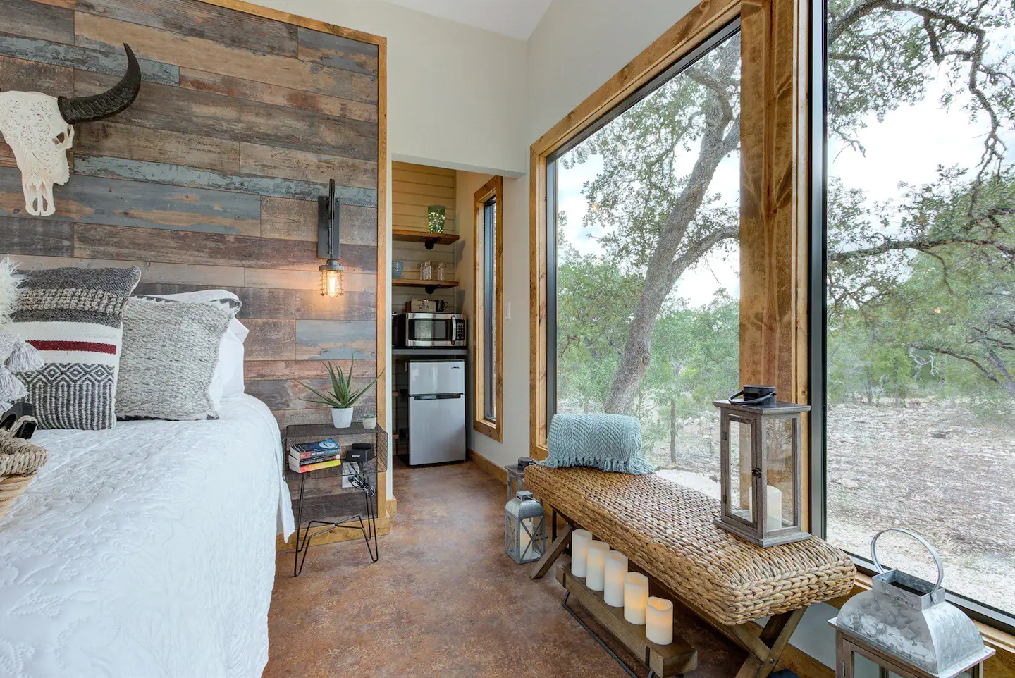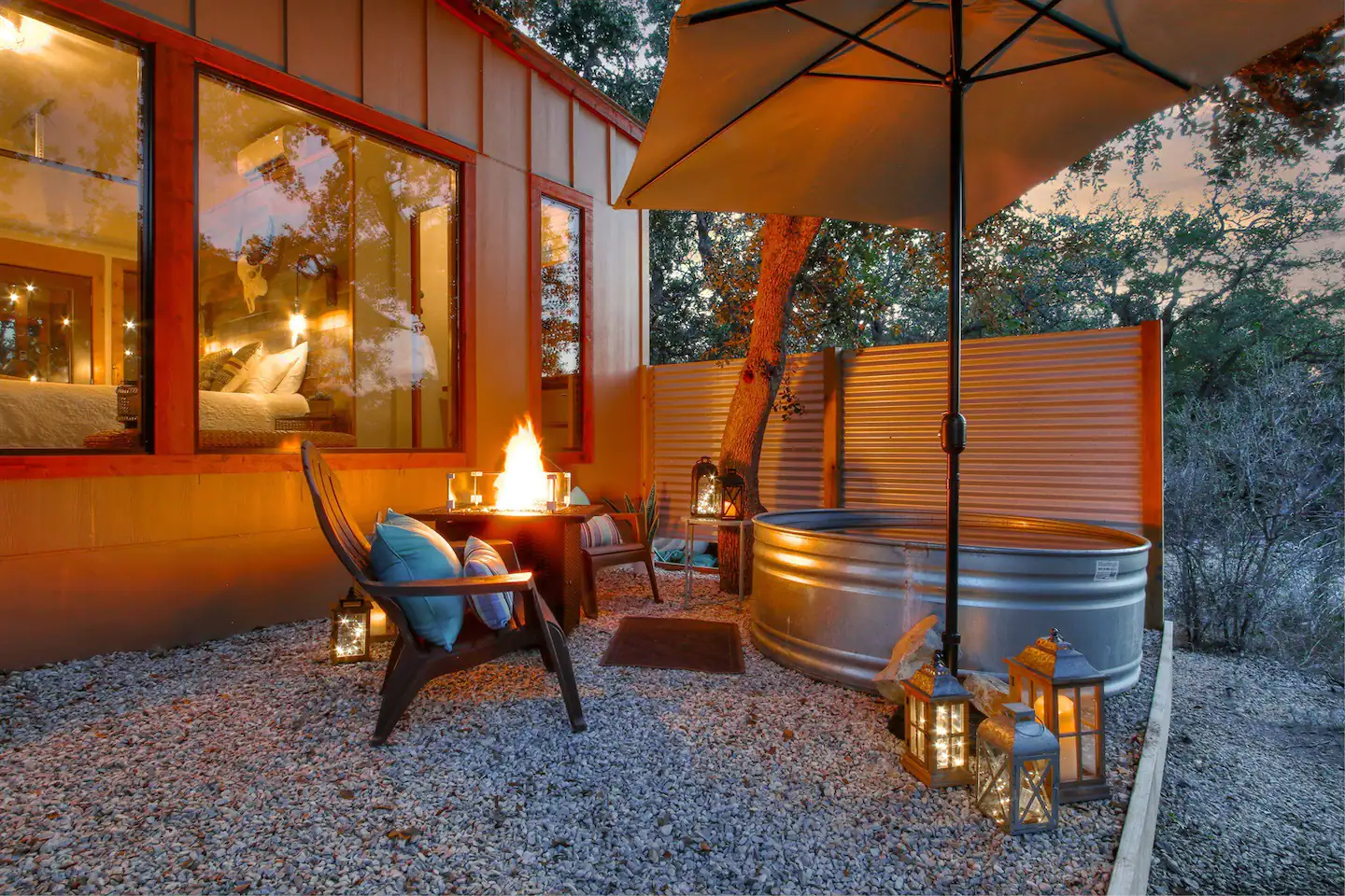 Have you ever dreamed of laying on a luxurious bed underneath the stars, with nothing but the sounds of nature serenading you to sleep? Then this tiny home in Texas will make your dreamy dreams come true! This one-of-a-kind rental property allows you to sleep outside on a luxurious queen-size bed in privacy, with the peace and quiet that this 72-acre property offers. But if you’re more of an indoor couple, you can still enjoy this home with its rustic interior, huge glass windows, and functional kitchen. It also offers a private hot tub, fire pit, and access to hiking areas.