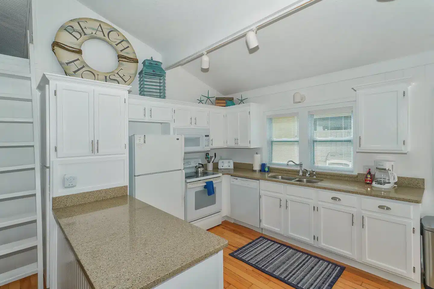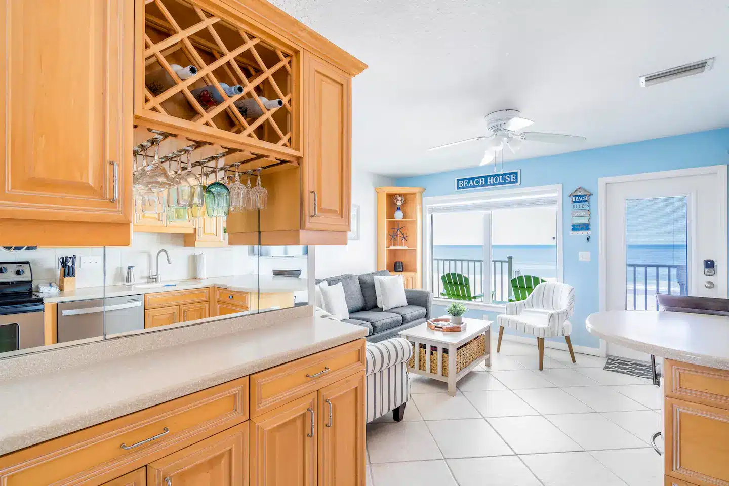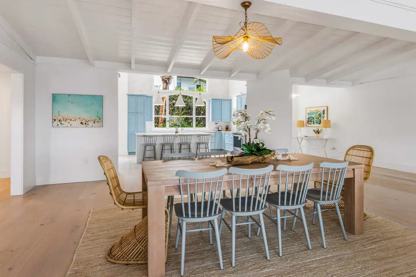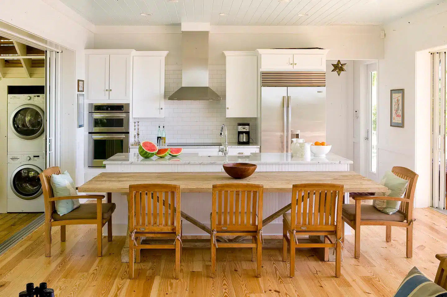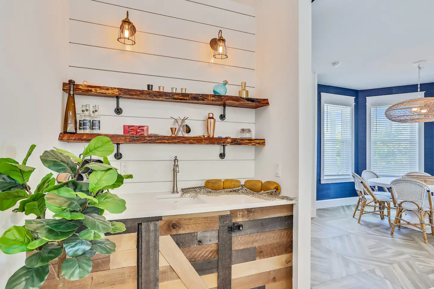 Indoors, you’re greeted with chic rustic nautical decor and an open space that’s all about vibing together. From the living room’s dry bar setup to a kitchen begging for a cook-off (Wolf oven included), it’s dialed in for chill nights and social spice.