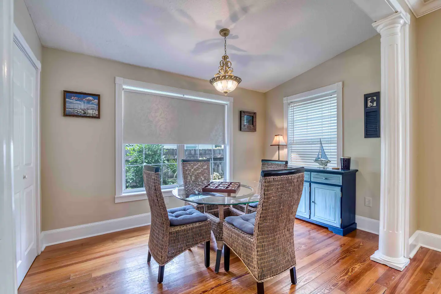 Beautifully restored antique heart of pine floors & original staircase. Spacious rooms 10’ ceilings. Original fireplace now converted to electric for safety. 5 Bedrooms: 3 up (share Jack n Jill bath)and 2 down (share Jack n skill bath)are all upstairs and downstairs on one side of the house. Additional full bath off kitchen. Game alcove (board games, cards, kids games) & reading nook. 4 TVs plus DVD. Gorgeous front porch-rock or nap on the hammock. NEW! heated, saltwater pool, bikes, beach chairs, cooler and umbrella! Loads of amenities-travel soaps and shampoos, coffee & tea bar, dishwasher & laundry pods, paper products, so much more!