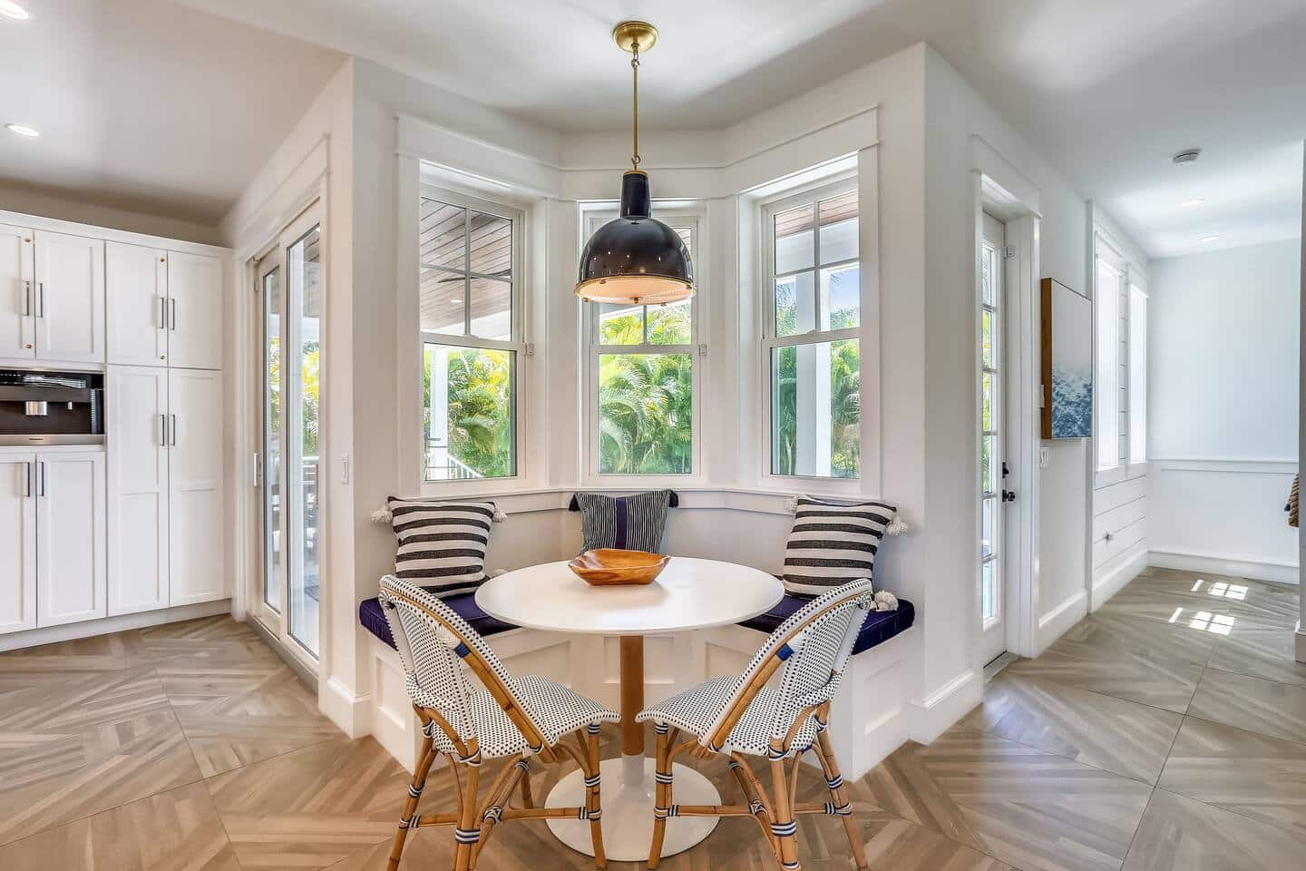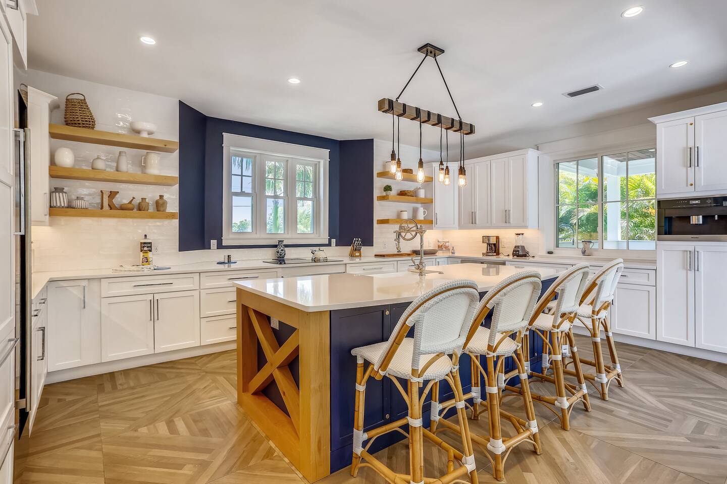 The nautical farmhouse theme carries throughout the home’s open layout. There is a dry bar in the living room for refreshments, plenty of seating, and amenities designed for a large family or group of friends. The spacious functional kitchen has stainless steel appliances, including a Wolf oven and induction stovetop, a huge wine fridge, a farm sink, countertop island seating, a breakfast nook, and a dining room table.