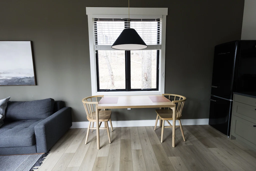 The cabin has a bedroom with a king bed and room darkening blinds, full bathroom with shower, and an open concept living room, dining room and kitchen space. Large windows in the living room and bedroom look out onto a private deck, hot tub, fire pit, and of course, the tranquil woods of Wilder. A 3 seater sofa pulls out into a queen bed in the living room to accommodate 2 more guests.