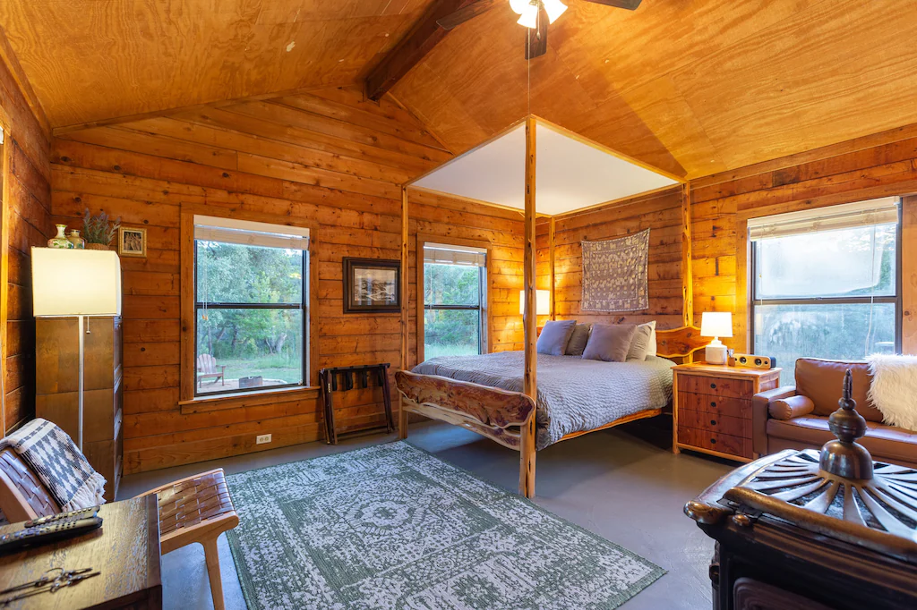 Three Graces Cabin is a true retreat from the hustle and bustle of city life, yet only five minutes from the wonderful shopping and dining of downtown Wimberley. This romantic one bedroom log cabin is nestled along the banks of Smith Creek on a secluded section of 10 gorgeous Hill Country acres that are shared with the owners.