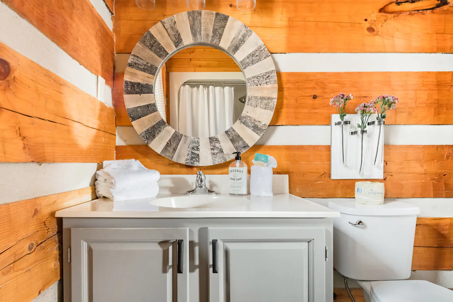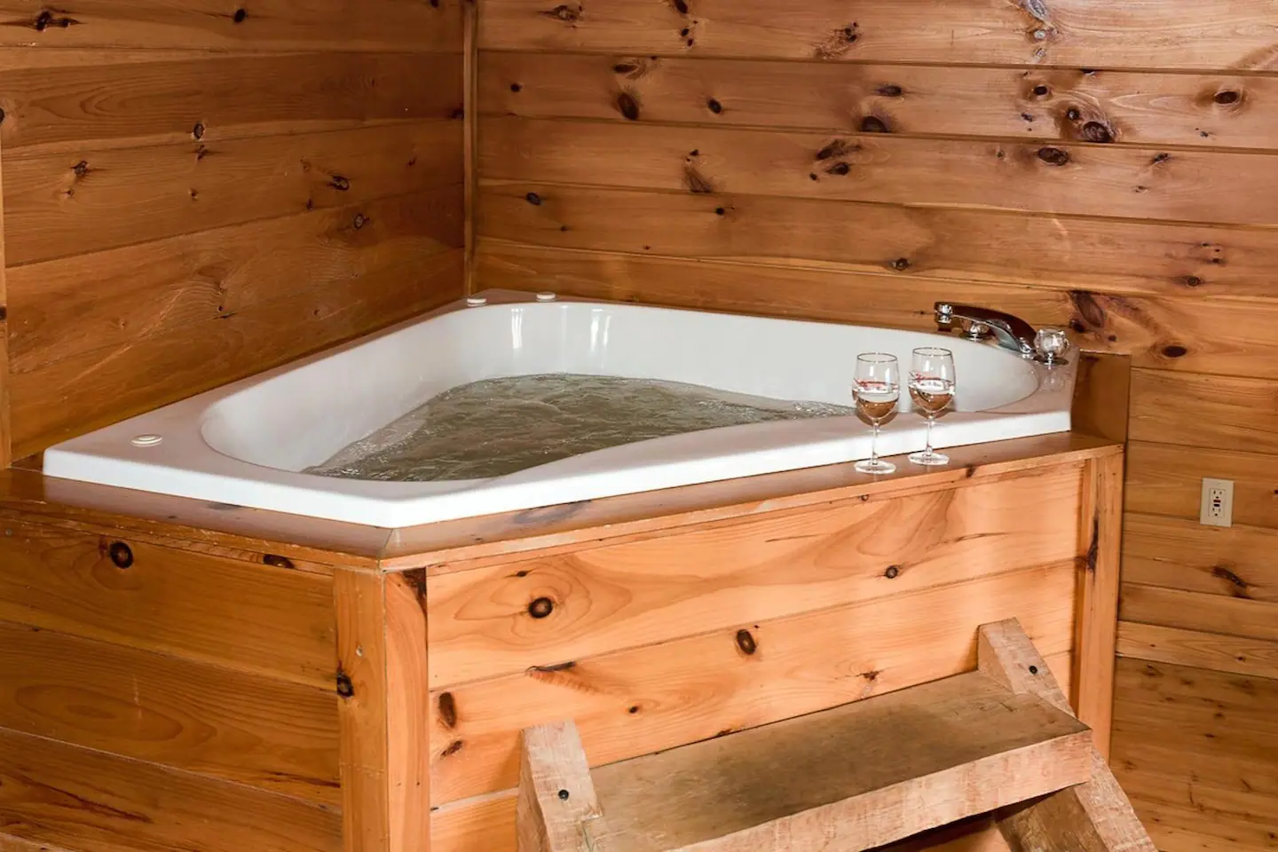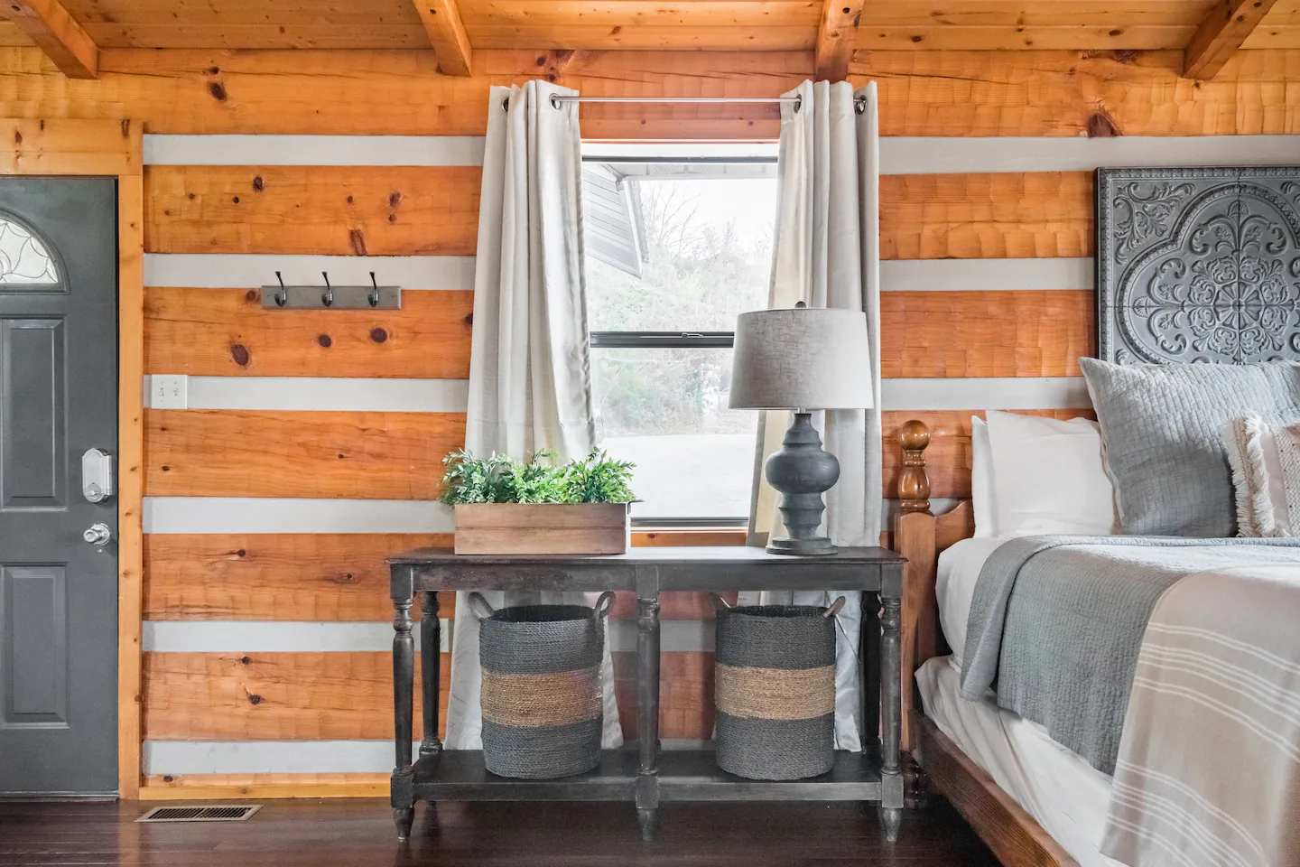 You can unplug and unwind in this lovely log cabin that has a relaxing hot tub, a vintage-style wood-burning stove, and a quaint fire pit for some intimate Smore’s!