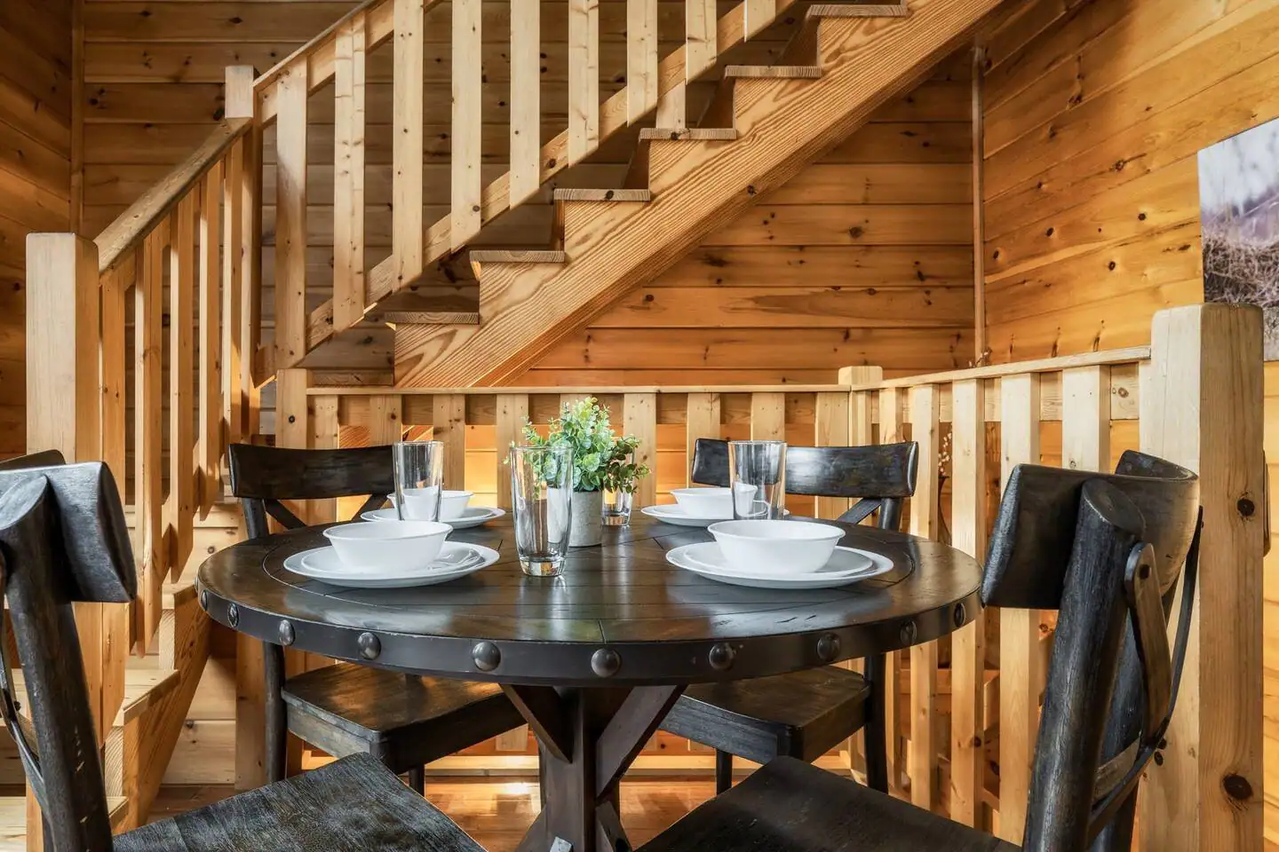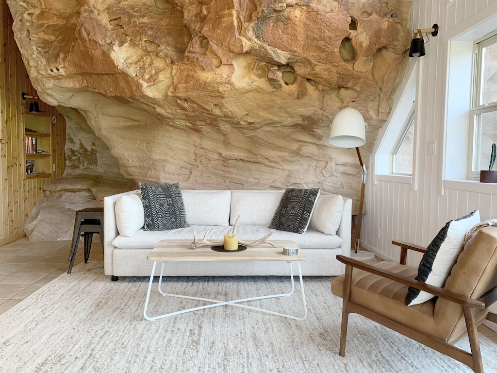 If traditional cabins are not your cup of tea, you’re in for a treat with this rental property. This cabin is built into the rock of a real canyon. How cool is that? Aside from this unique and rocking feature (no punt intended), this property will wow you with its contemporary design, and its light wood, huge windows, and modern furnishings that highlight the cabin’s focal piece.