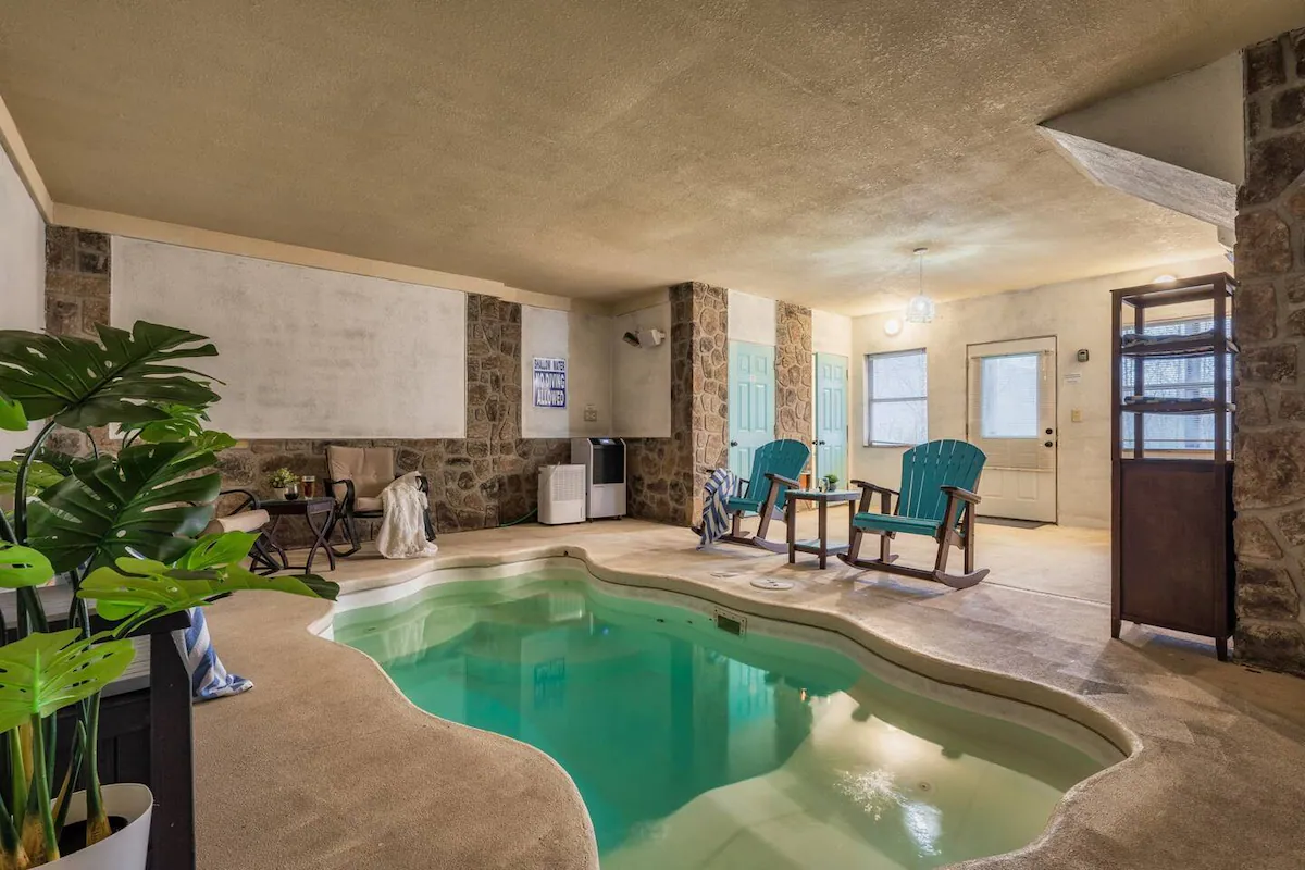 Come stay and relax in an updated cabin with your own Private Indoor Heated Pool! This 3 story cabin sleeps 6 people comfortably. Perfect for a romantic getaway or family vacation. Entertain yourself and your guest by swimming, playing pool, gaming on the multicade, and watching movies on the 3 large TVs! Cook and eat in the Updated Fully stocked kitchen and private deck with a brand new bbq grill.