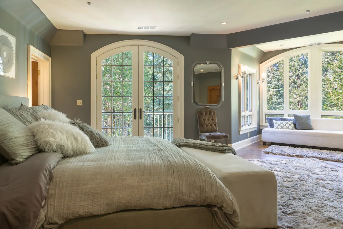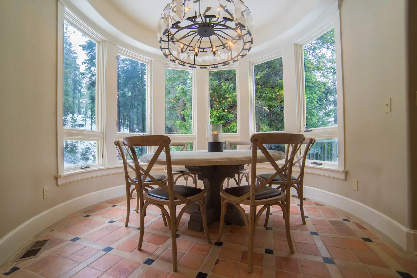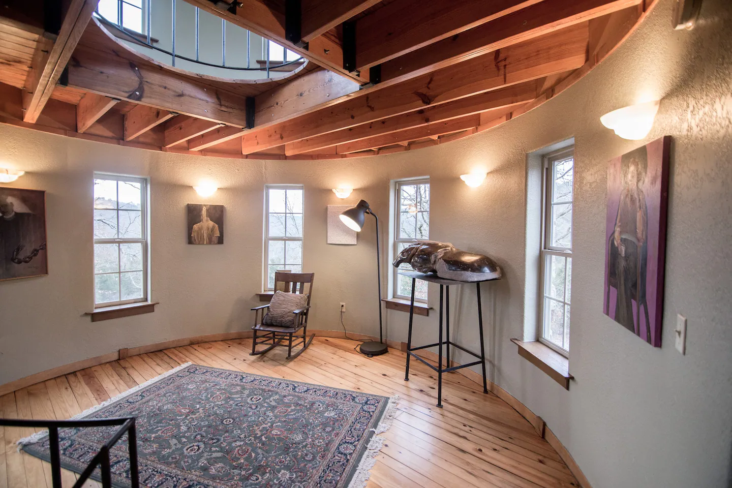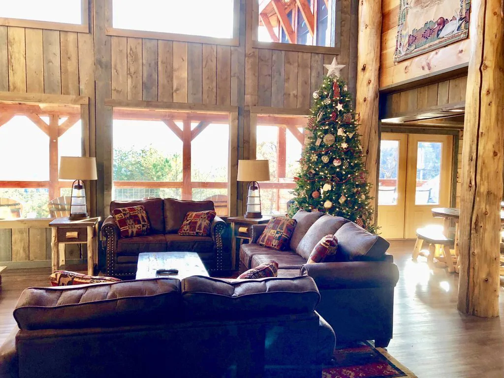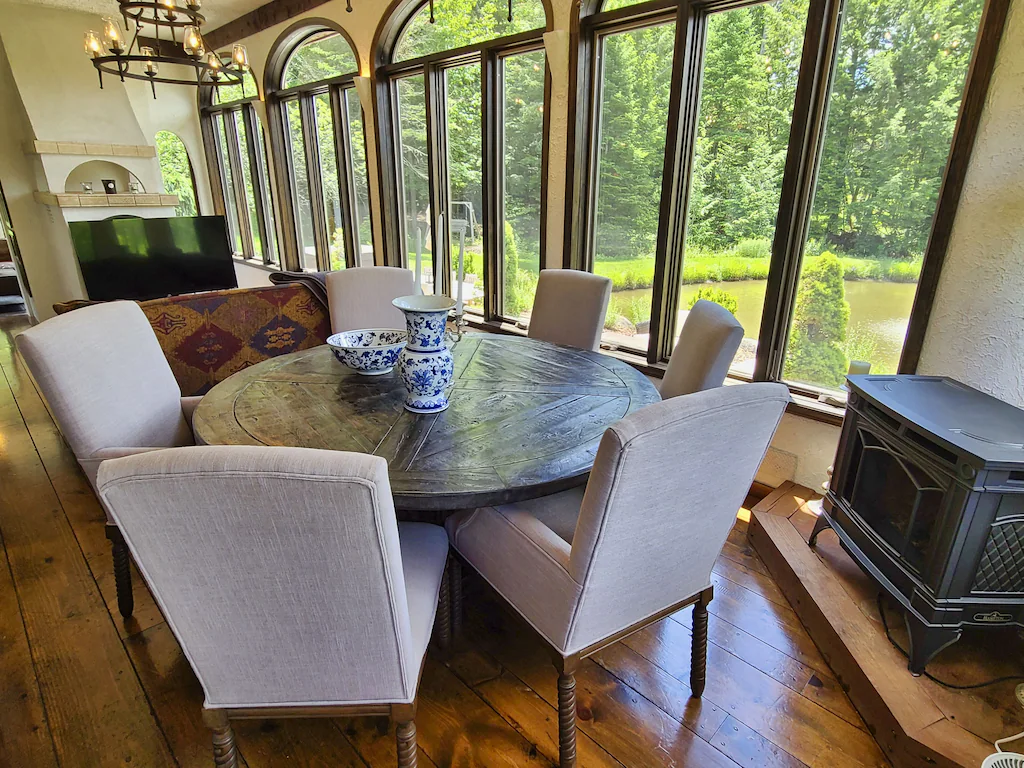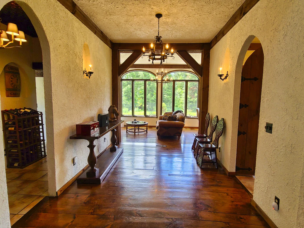 This magnificent castle vacation rental offers a four-story turret, elegant wood details, and an Instagrammable spiral staircase! This modern-day castle also features an amazing art gallery with pieces you and your family and friends will definitely love! This spacious property also comes with private access to all 52 acres of woods for you to explore and discover.