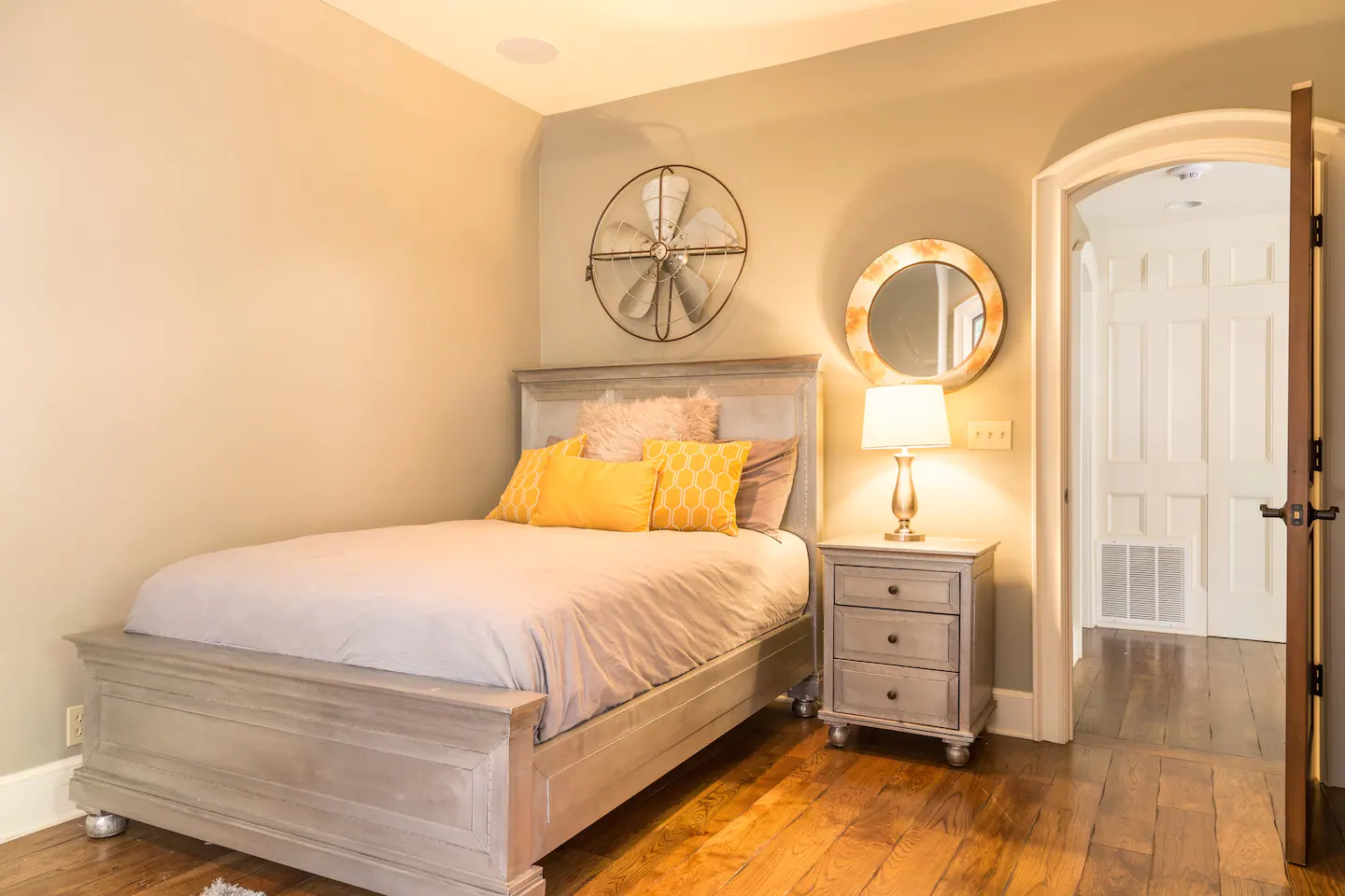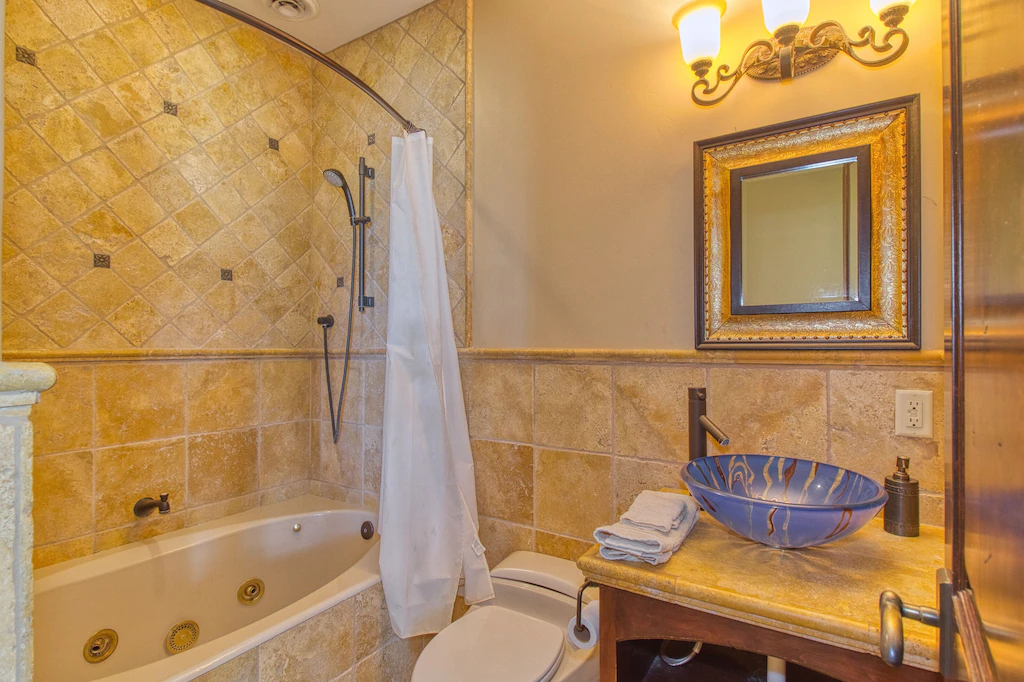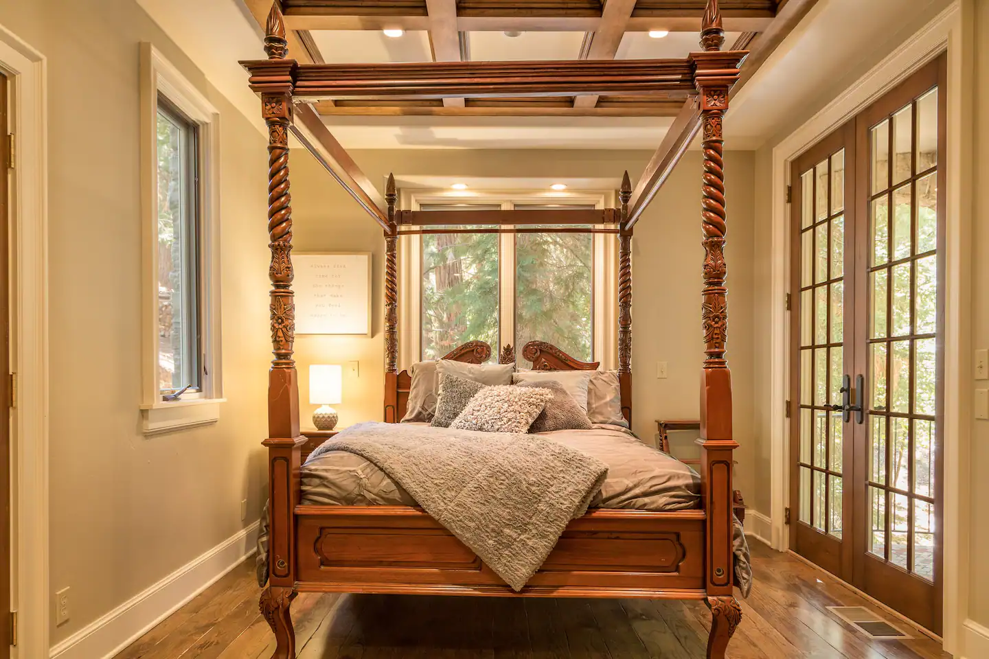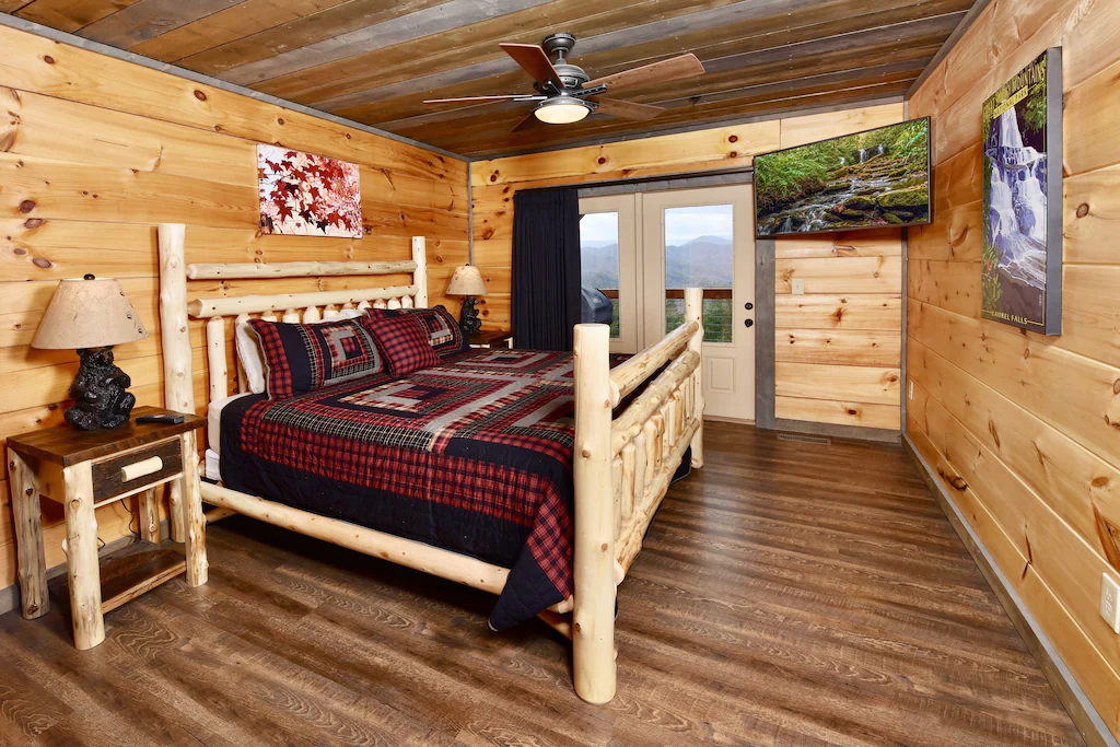 The downstairs master bedroom has its own private full bathroom, a queen bed, and french doors, which access the sprawling back porch.