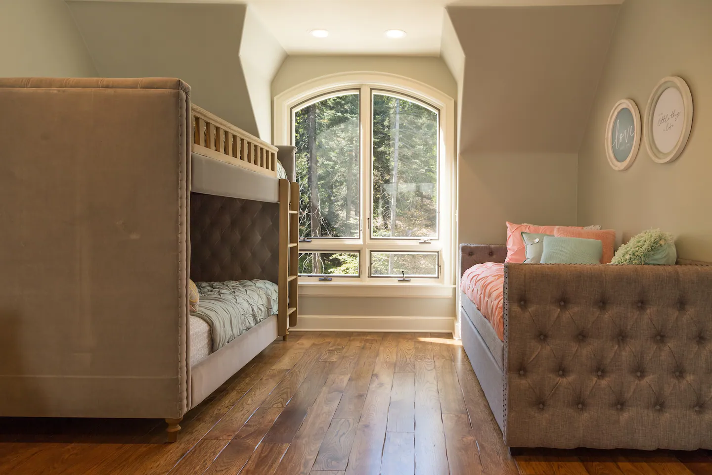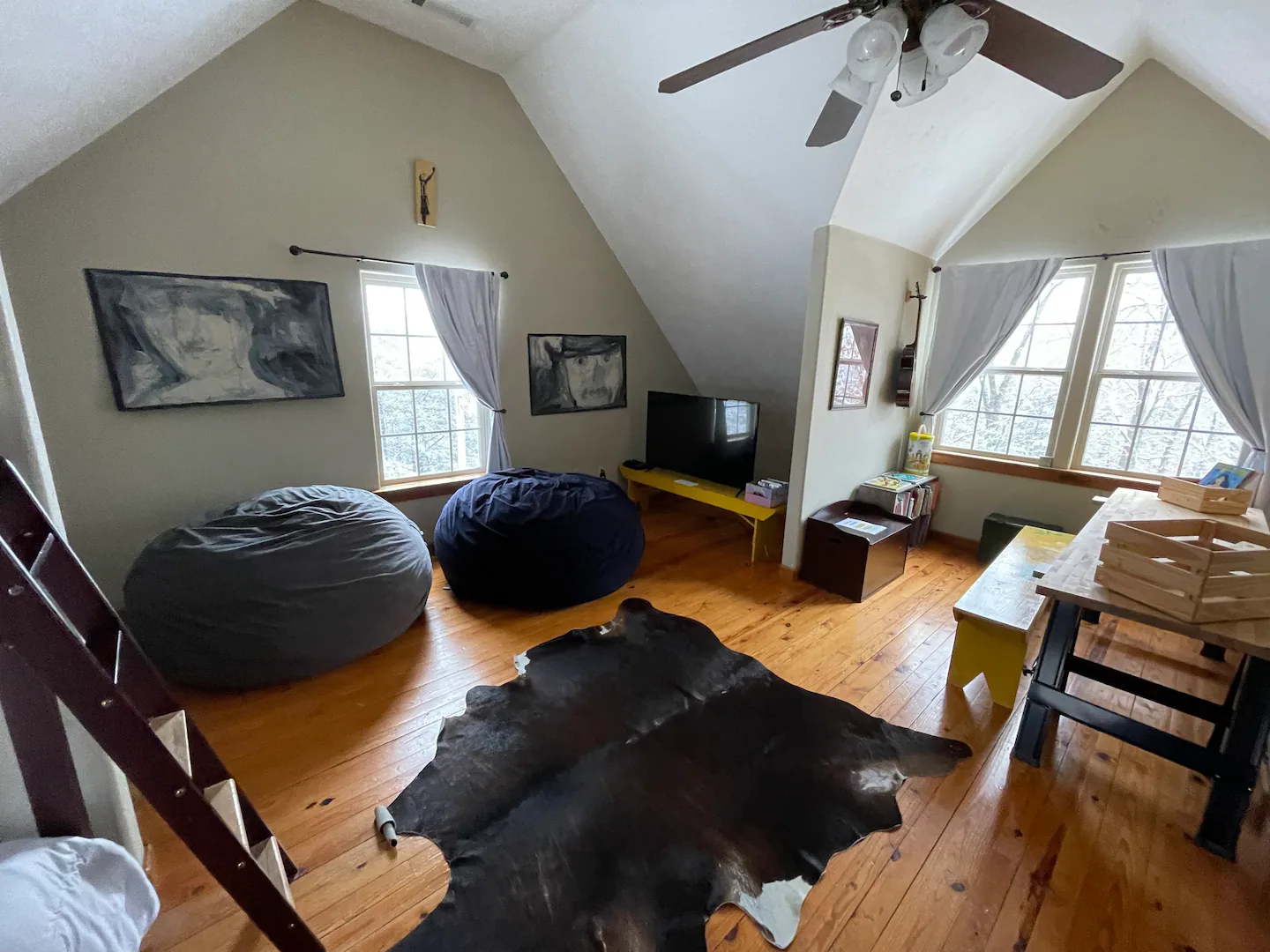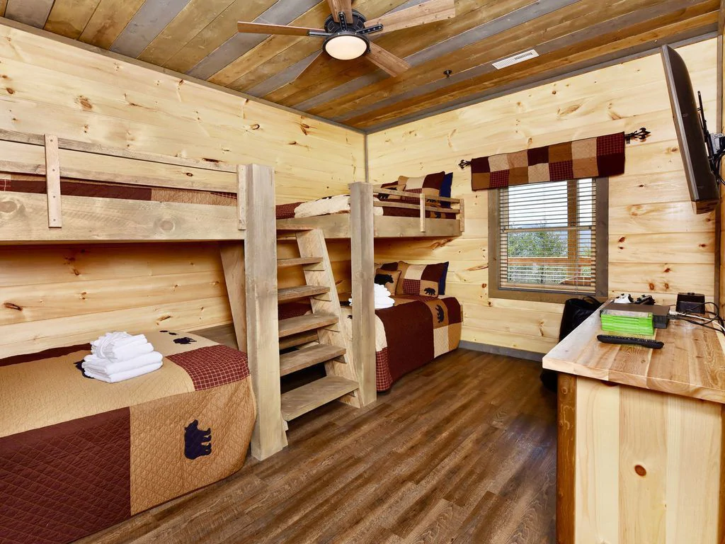 The bunkroom is home to a futon couch, a 65″ flat-screen television, a large workspace for arts and crafts, and a twin bunk bed with a hidden trundle, to accommodate up to seven people.
