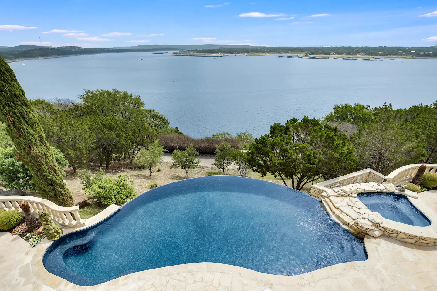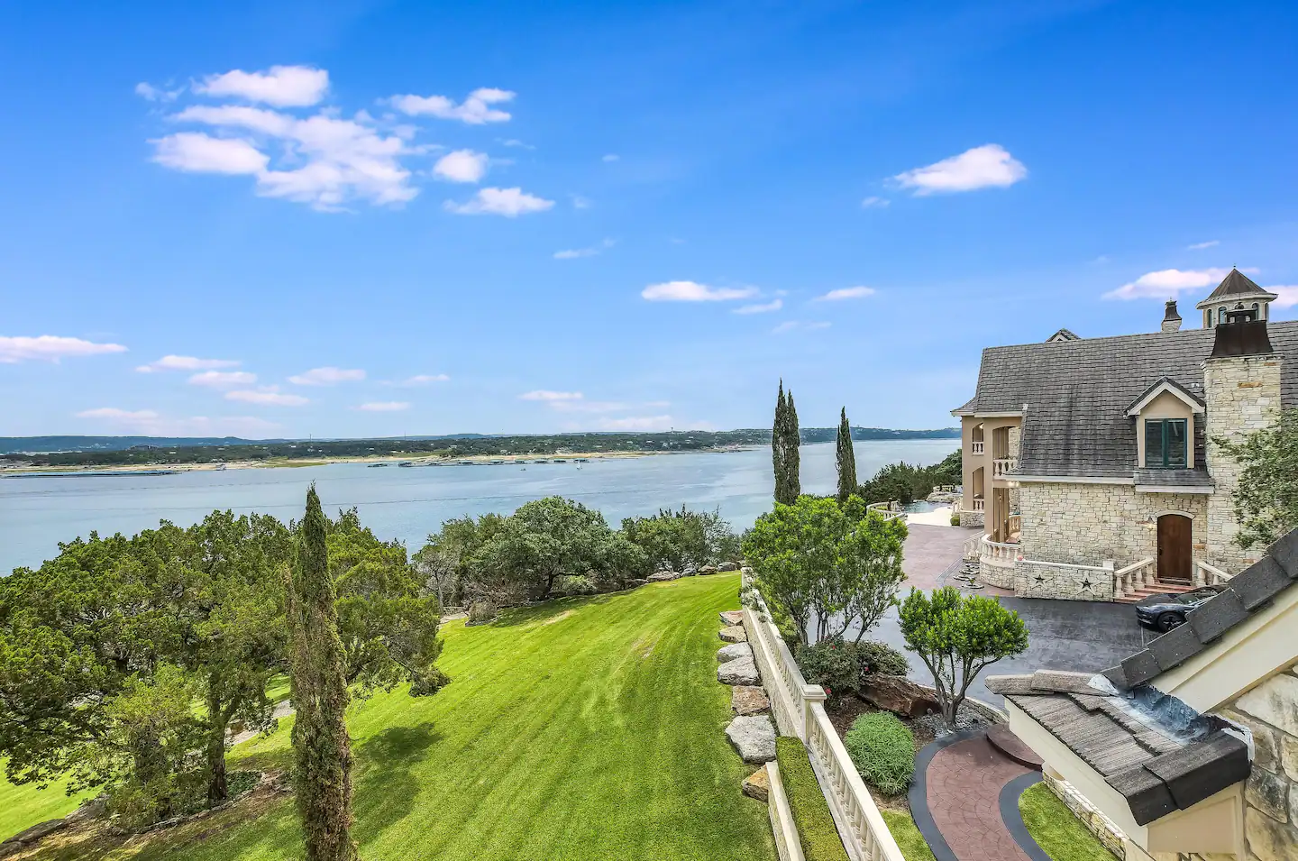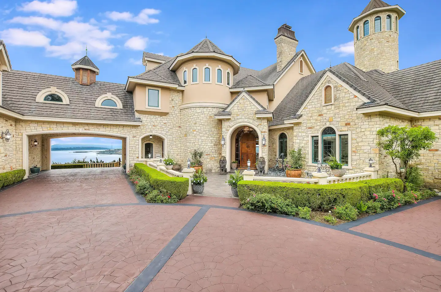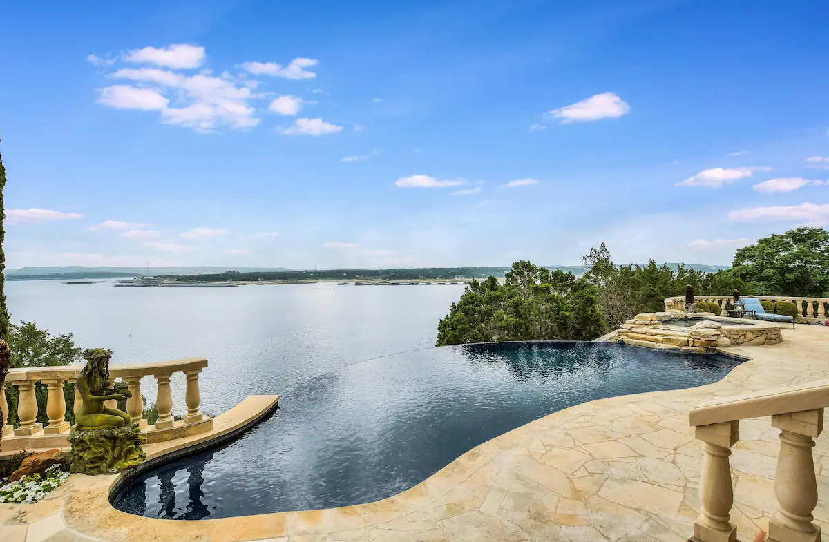 Welcome to a real-life fairy tale! This Old World style Castle Estate has an elegant living room that is open and spacious. The nearby kitchen has a copper-topped island, gourmet appliances, and a breakfast bar. The negative edge pool and patios all face the fabulous 180-degree lake view. Walk across to the 2nd-floor game room with pool table, foosball, shuffleboard, and built-in bar.