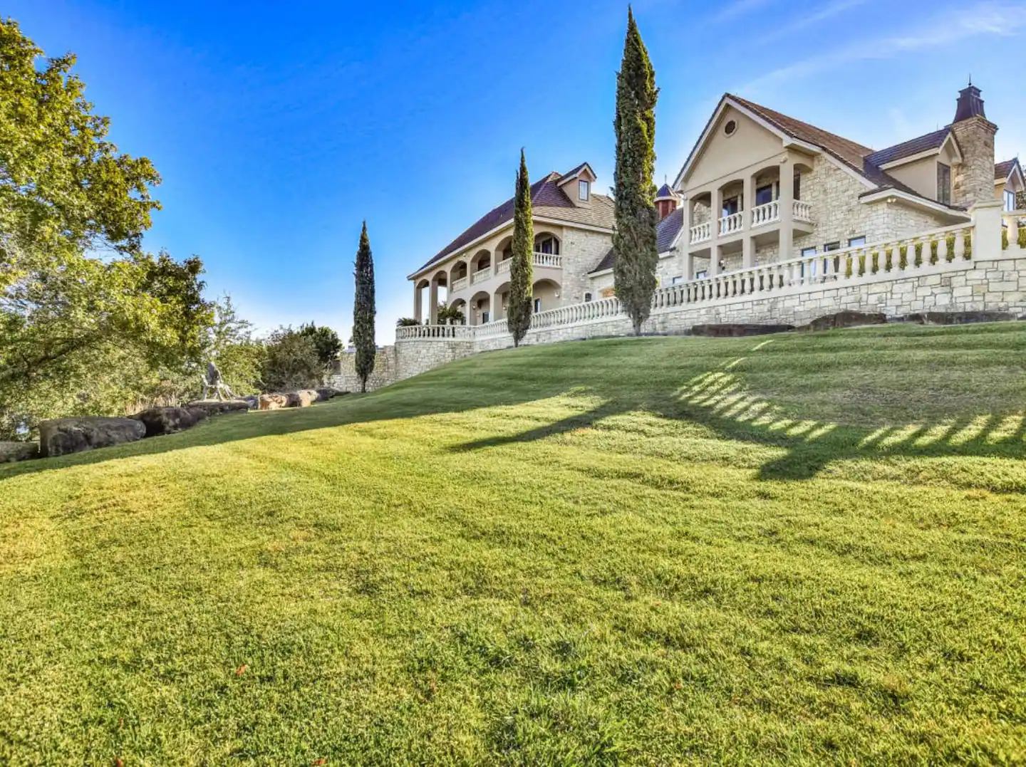 Situated on multiple levels (Including a tower wing)· the Castle has several dozen rooms, including seven luxurious suites, an acoustically perfect grand ballroom with a balcony, a custom kitchen, a formal dining room, and several salons – plus multiple themed rooms: study, game room, and even a Bavarian-style pub with a sunken bar. Finally, multiple lower and upper terraces complete this spectacular edifice.