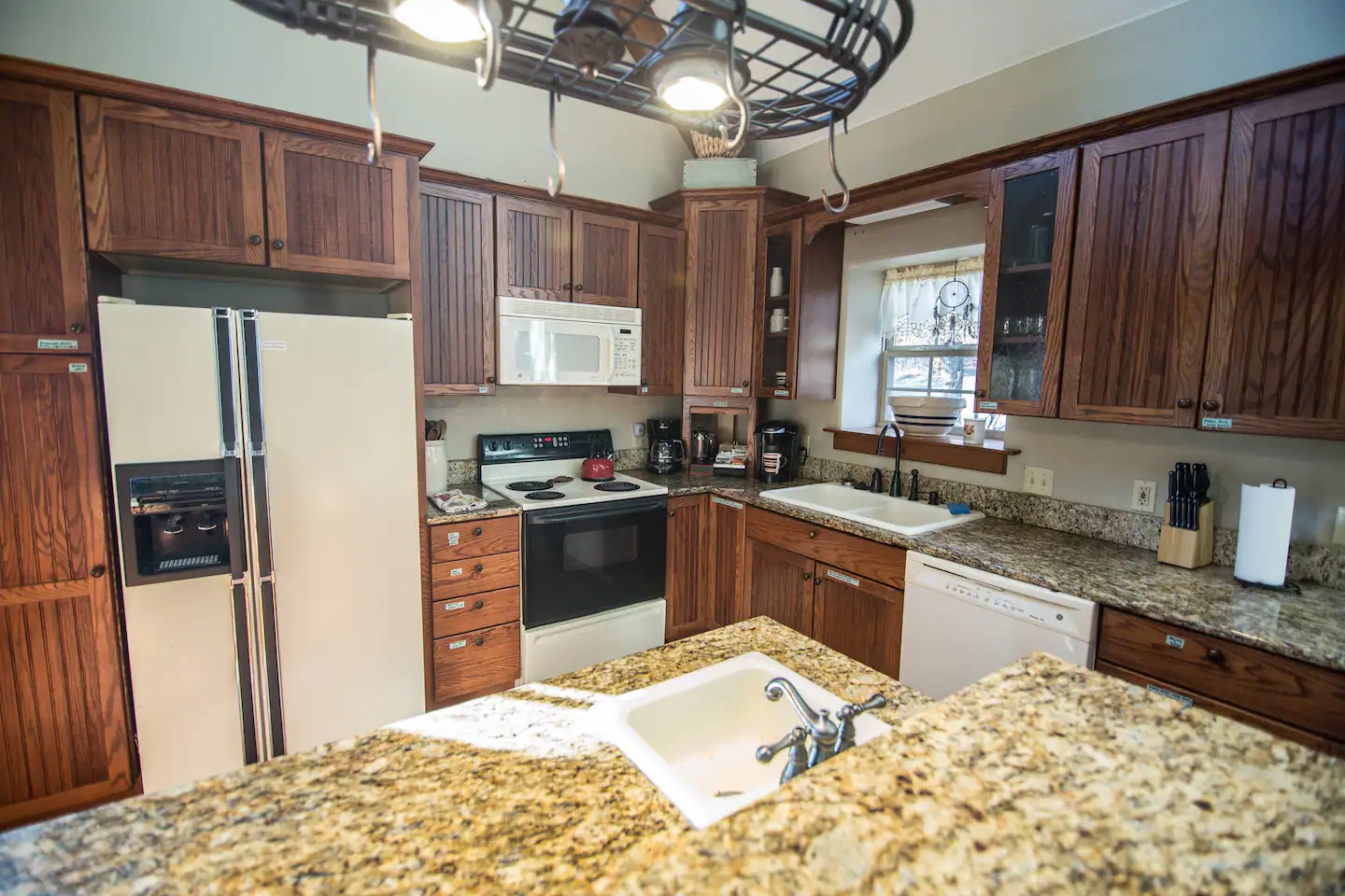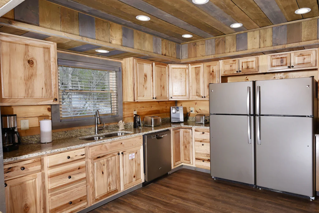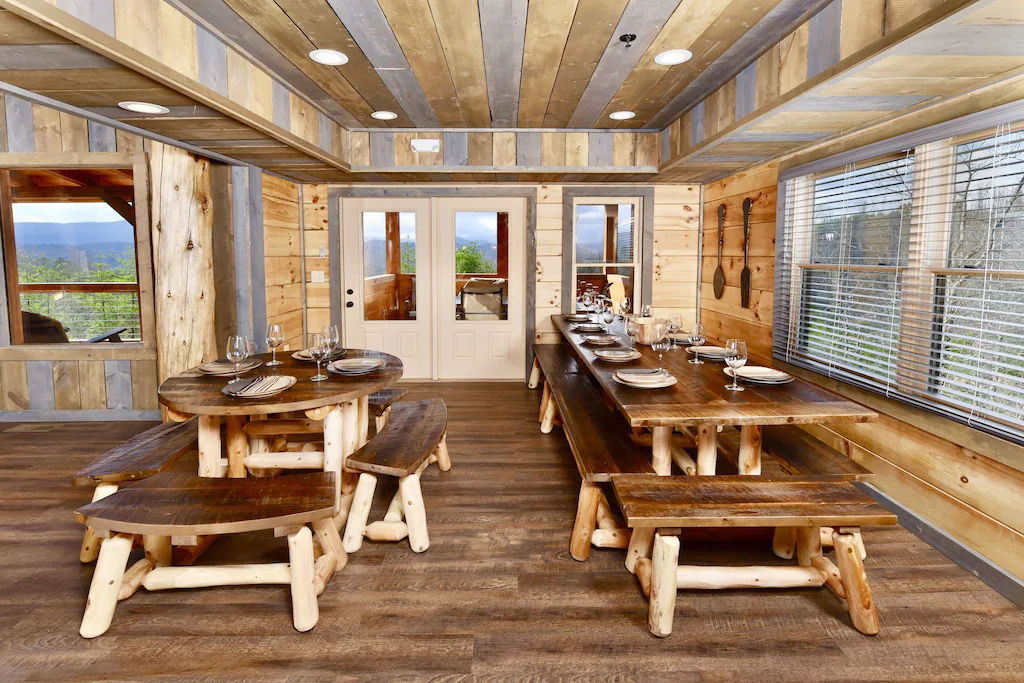 Summit Castle features a beautiful fully-equipped kitchen with natural-wood cabinets and granite countertops. Feeding a large group is a breeze with 2 ovens, 2 built-in microwaves, 2 refrigerators, 2 dishwashers, 2 sinks, pots and pans, cooking utensils, and ample counter space to prep. All guests will be able to dine together on the 2 large log tables, the kitchen peninsula, and the covered outdoor dining table just outside the dining area.