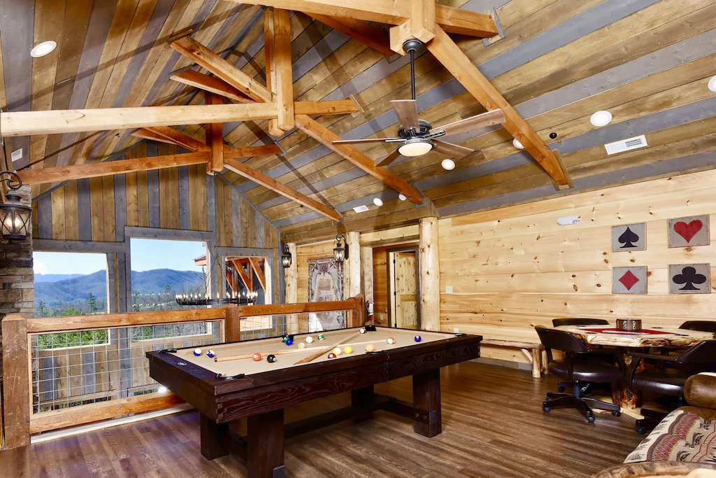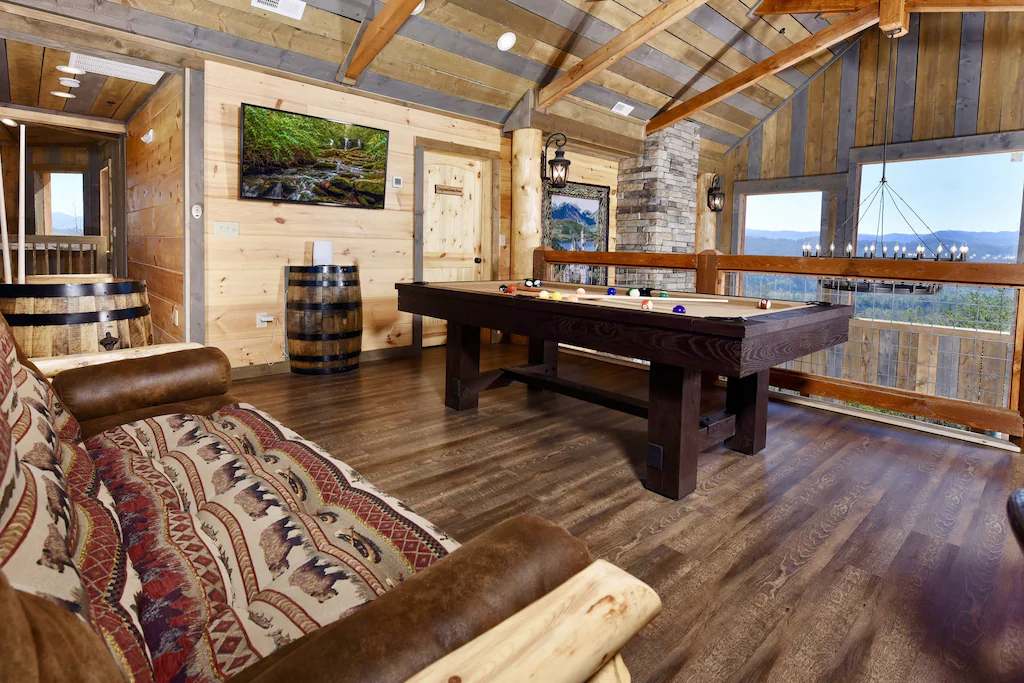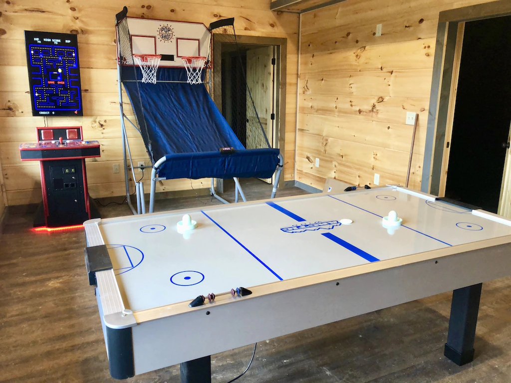 Located off Wears Valley Road, you will find an entertainment paradise! This cabin offers a wide variety of amenities such as a barn-style theater room with comfy reclining theater seats and a massive 82″ HDTV, with premium cable and On Demand; Xbox One; Official Pop-A-Shot Dual Shot Basketball Arcade Game; pool table; air hockey; and multicade arcade system (containing tons of classics like Pac-Man, Galaga, Frogger, Donkey Kong, Space Invaders, Ms. Pac-Man, etc.).