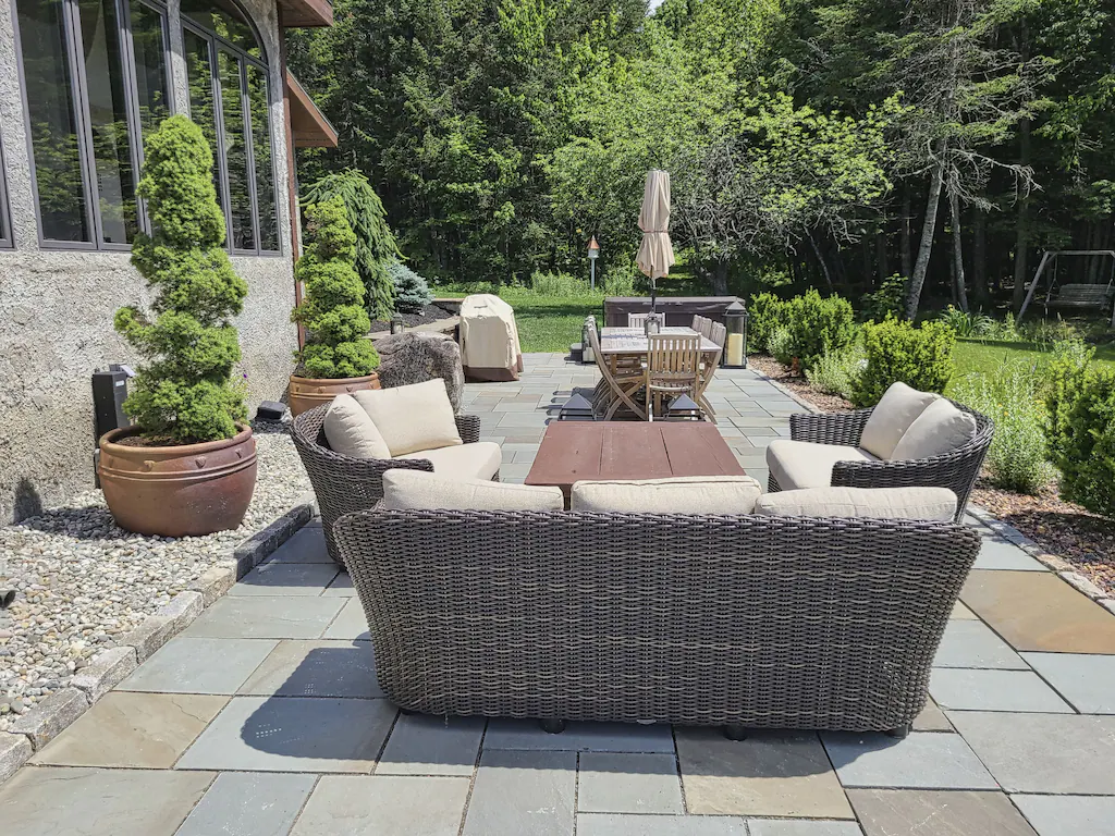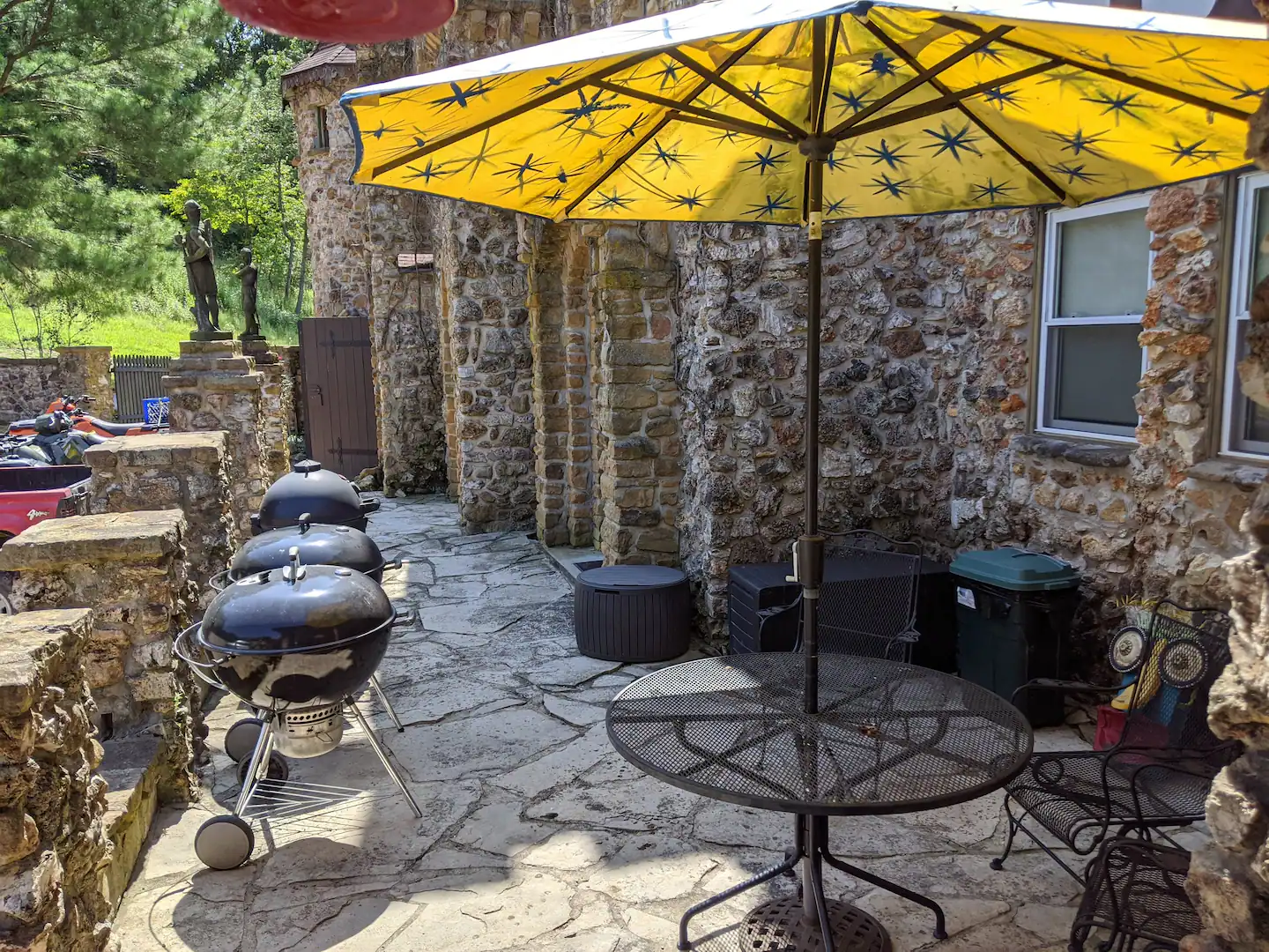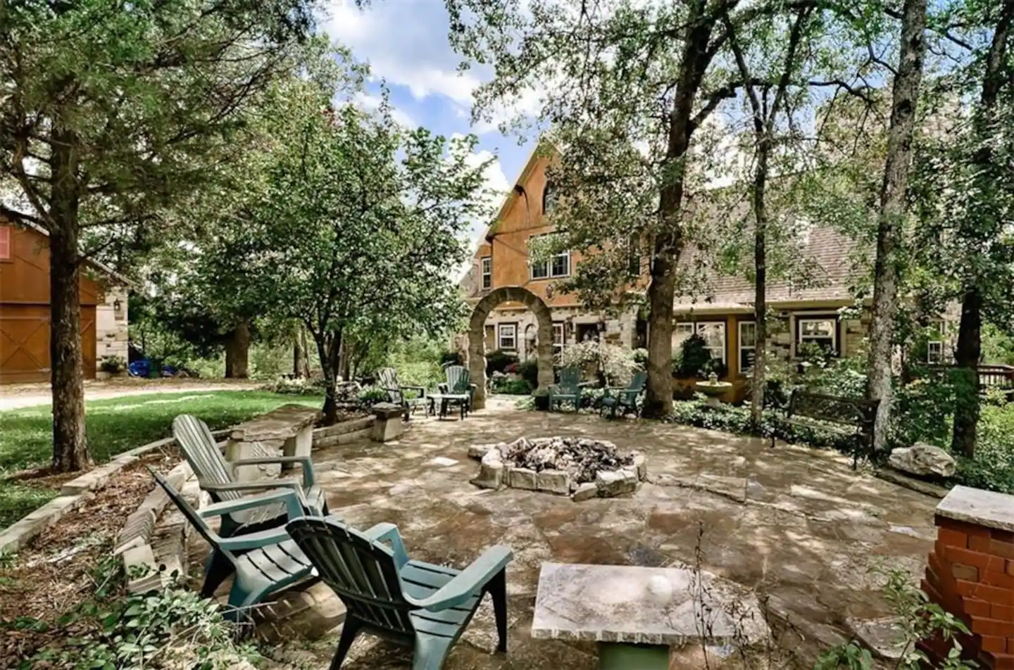 As if the interior of the house isn’t cool enough, guests also have full access to 52 acres of wooded bliss. Feel free to take a hike and explore the property, you may even find old remnants of a 1950 crashed vehicle, fossils, and large stones from around the world. A stone patio with a built-in fire pit and outdoor chairs is also accessible to guests.