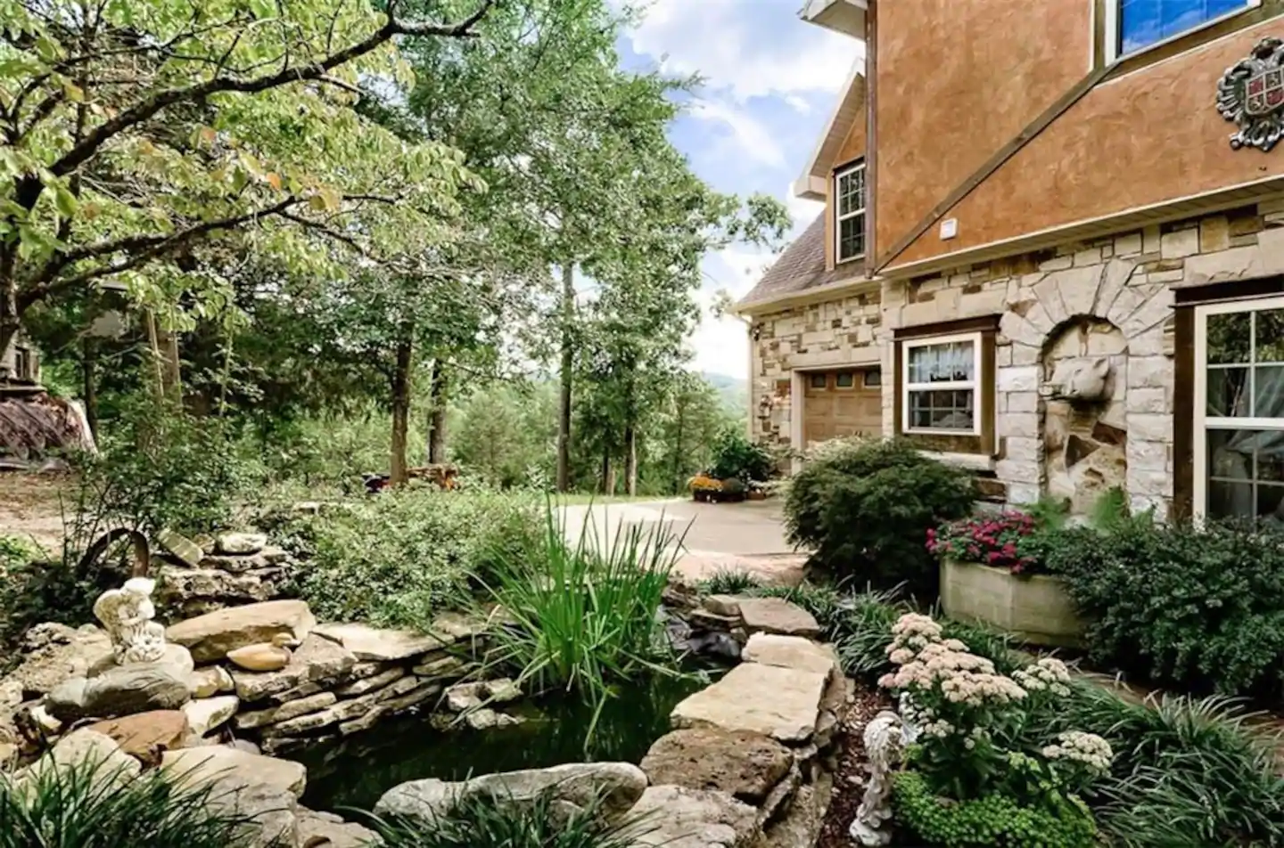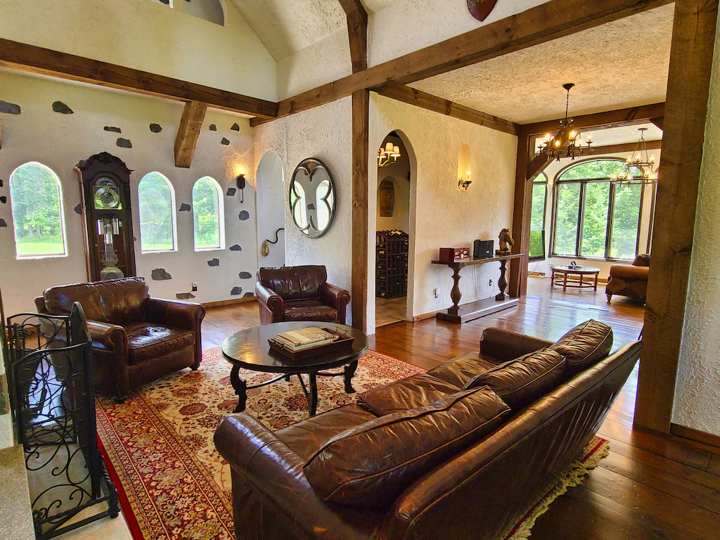 This beautiful, air-conditioned Bavarian-style castle sits on 20 acres with spectacular mountain views, its own ice rink, and super fast fiber optic WiFi. The grounds feature a large pond stocked with rainbow trout and two fountains, picturesque paths through the property’s woods, two bluestone patios complete with stainless steel grill, and furnished dining and lounging areas.