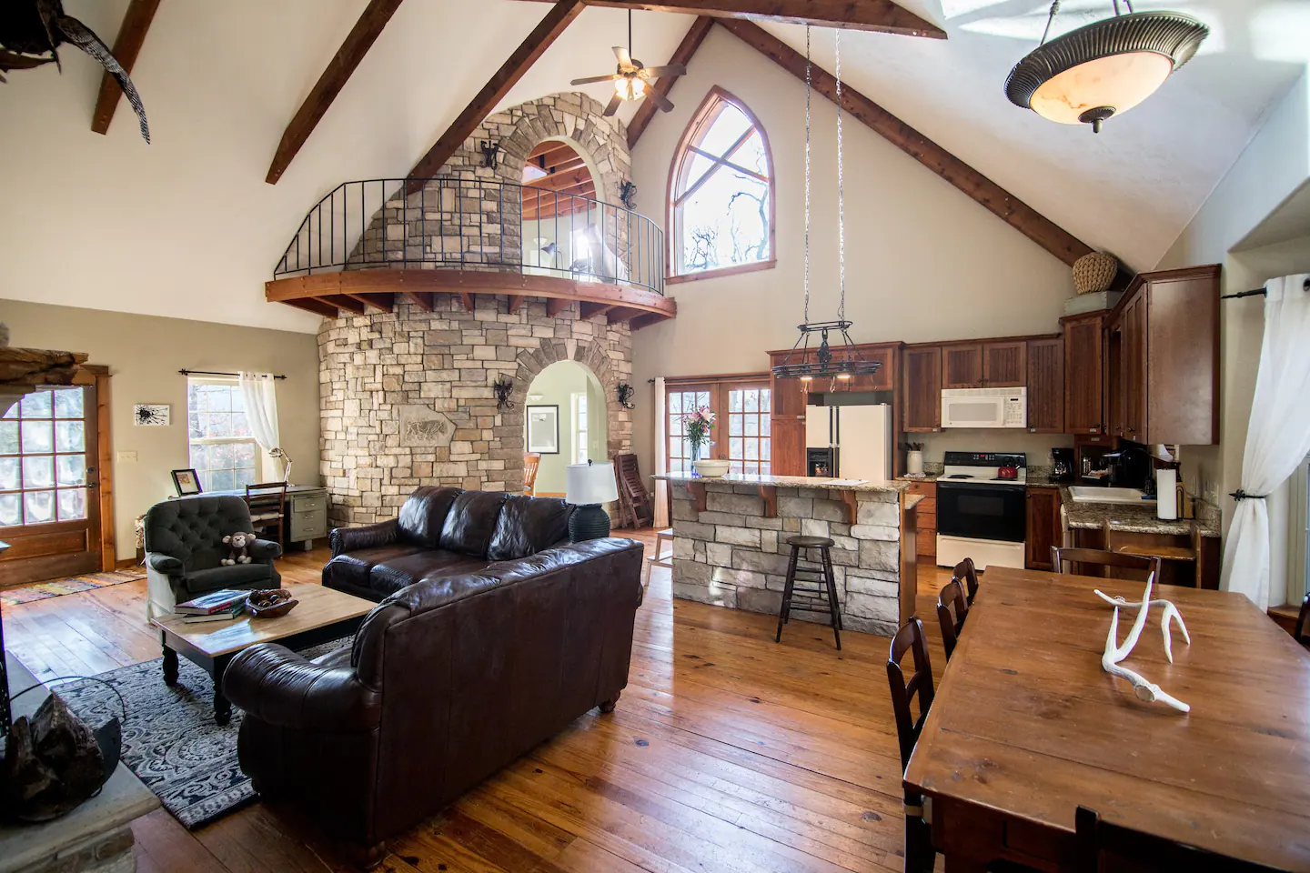 The upstairs master bedroom includes a large jacuzzi tub, stained glass windows, and 15ft vaulted ceilings.