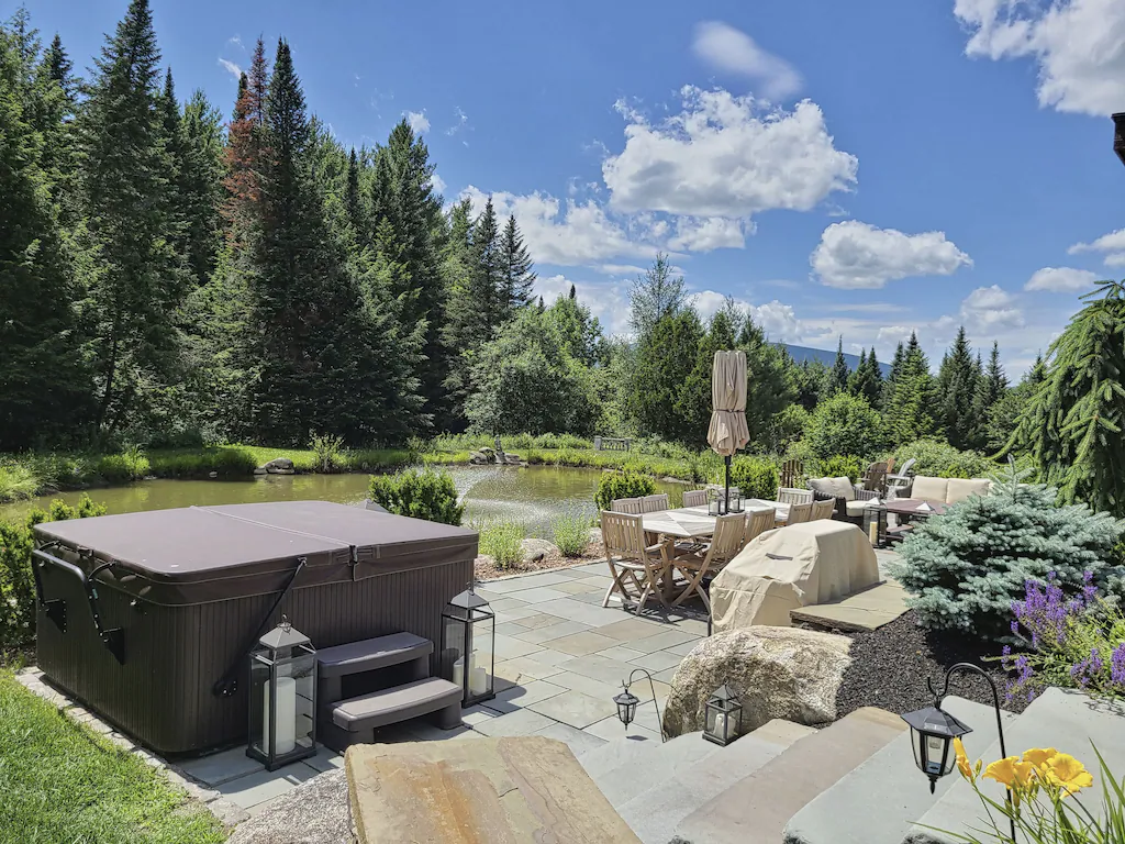 There is a custom-built fire pit surrounded by Adirondack chairs that extends out over the pond. A hot tub (accommodates 6-7) sits on the main patio overlooking the pond — the perfect place to watch the sunset over the Vermont mountains or the many stars at night! Or ice skate on your own private ice skating rink in the wintertime!
