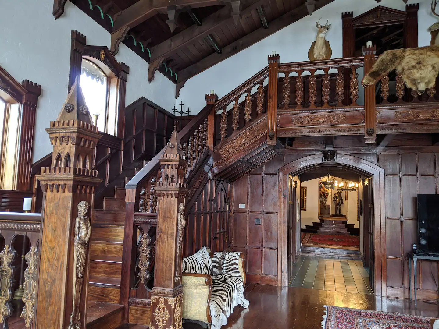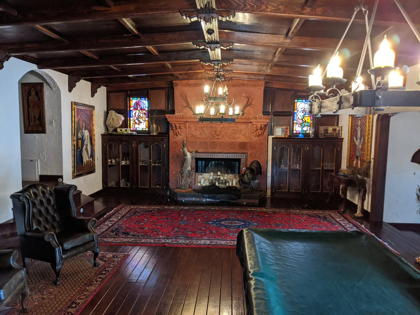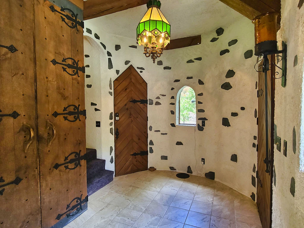 The castle is made of a main house and a separate carriage house. The main house has 5 bedrooms and 4.5 bathrooms and is for rent. The carriage house is used by the owner.