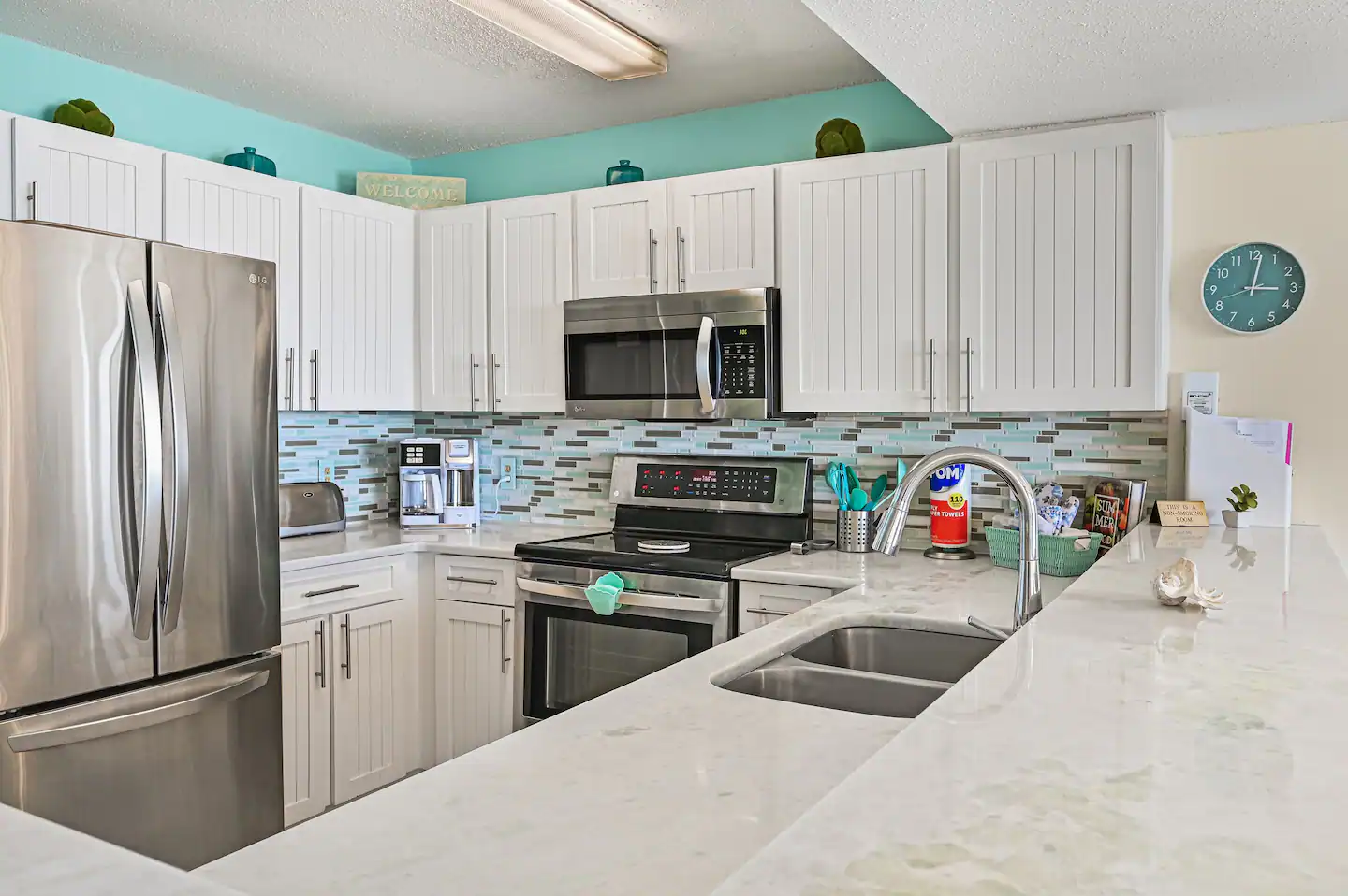 The kitchen is chef-ready with healthy ceramic and stainless steel pots & pans, blender, mixer, hand mixer, toaster, coffee maker, and more. You could easily bake or cook your favorites if you would wish to enjoy the kitchen with a view.