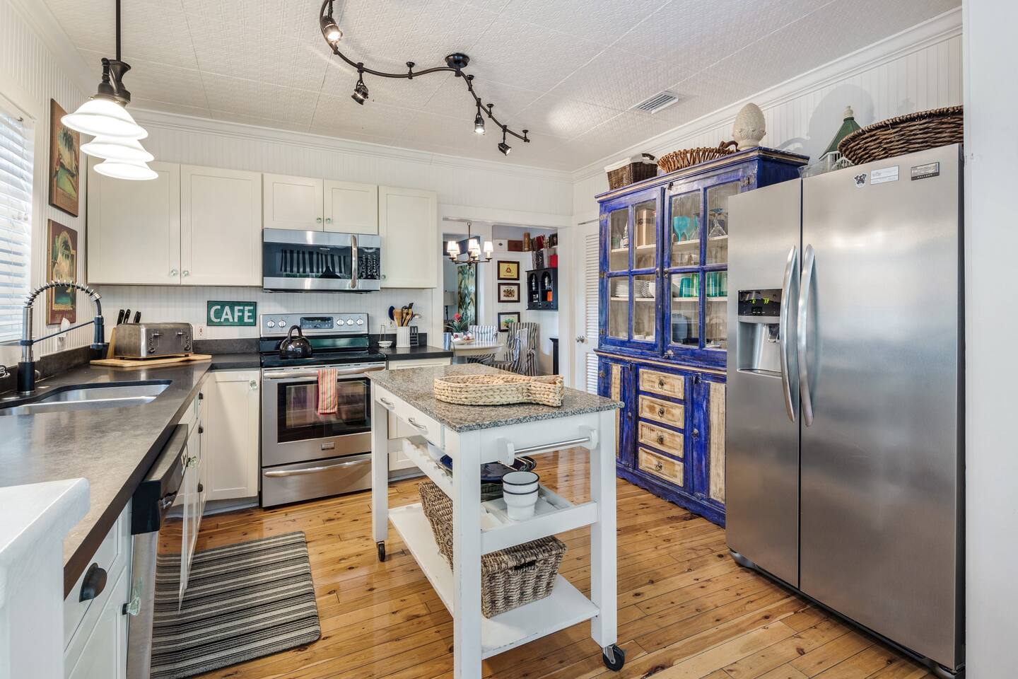 Casa de Cuba is beautifully decorated with soothing colors, sophisticated furnishings, accented with Cuban and beach themed artwork. There’s both a living room and additional sitting area in the front of the house. Pass through the dining room to the cottage style kitchen with black granite counters, open to the sun room with large farmhouse table with French windows and doors overlooking the pool and a indoor/outdoor room to enjoy the tropical lifestyle of Key West.