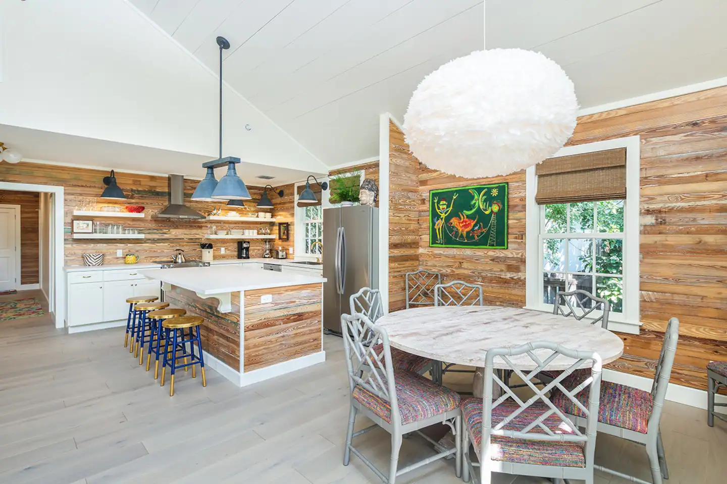 The main area on the first floor includes a grand, vaulted ceiling and a large, open concept living room/dining room and kitchen. Top of the line stainless steel appliances, white quartz counter tops and open shelving will allure your family’s chef to create sumptuous meals, even while on vacation. The kitchen is adorned with a large island with seating for four and is cleverly trimmed in historic Dade County pine. An additional dining area overlooks the back of the home and private pool via a wall of glass doors.