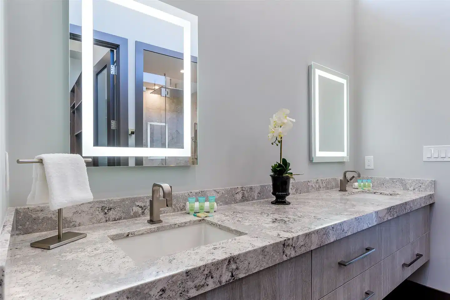 Chill in the lobby or lounge, then dip into the heated pool on the private patio. Craving a caffeine fix or a midnight snack? The kitchen’s got you, with espresso on tap and fridge space to spare.