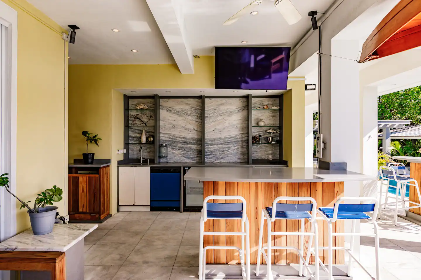 Beyond the amazing views, another highlight of this home is the brand new swimming pool with a built in sun-shelf. Beautifully designed and located to catch as much of the Florida Keys sunshine as possible; you will have a hard time leaving! The spacious pool deck is furnished with multiple poolside loungers and more Adirondack chairs situated on the sandy beach area overlooking the pristine ocean water. Cook up your catch of the day in the covered, outdoor kitchen featuring a built-in gas grill and ample counter space.