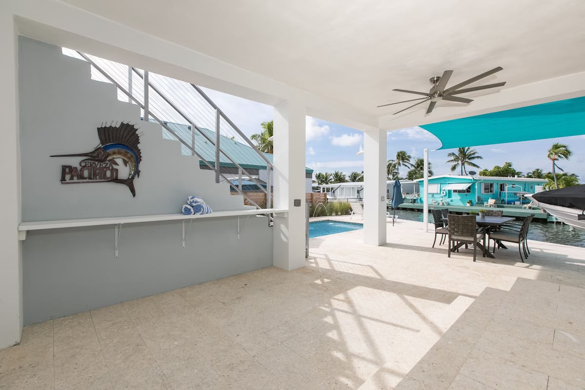 Angler’s Terrace has all your fishing necessities covered. It is perfectly located on ocean side minutes away from the reef, yet close enough to the seven-mile bridge for access to gulf side fishing. There is a fillet table for cleaning, freezer for bait, water, electricity and an outdoor shower. There two grills also provided. The total dock is 60 ft. 28ft can be used for your vessel (if we need a larger space for your boat please let us know). Canal is 35 feet deep and we have ample parking for 3 cars and your trailer on the side of the houseNot a fisherman…. Relax in our lounge chairs by the gunite pool while listening to water from the deckjets of the pool (heating optional), or take a five-minute drive to Sombrero Beach, or a 10-minute drive to Bahia Honda Beach to get some sand in your toes.