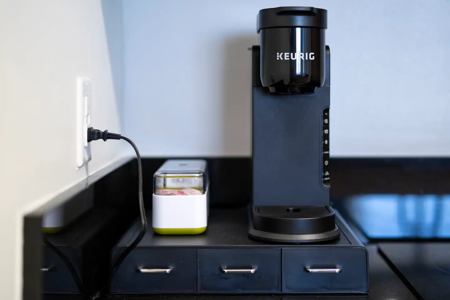 Inside, the vibe is all about modern comfort with a twist. The living room is a chill spot for lounging post-city adventure. The kitchen? It’s ready for your culinary creations, complete with a dedicated coffee station for those must-have caffeine boosts.