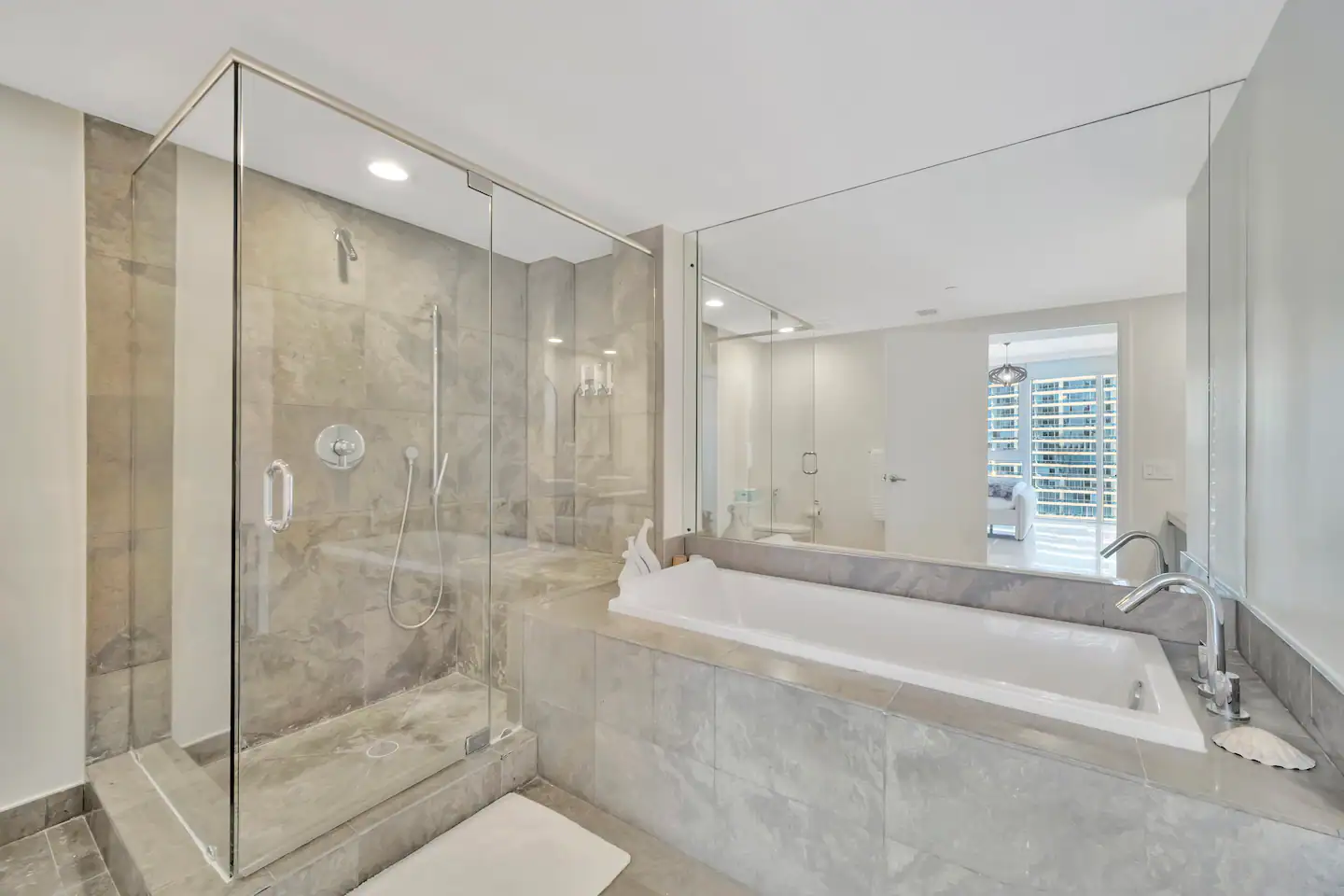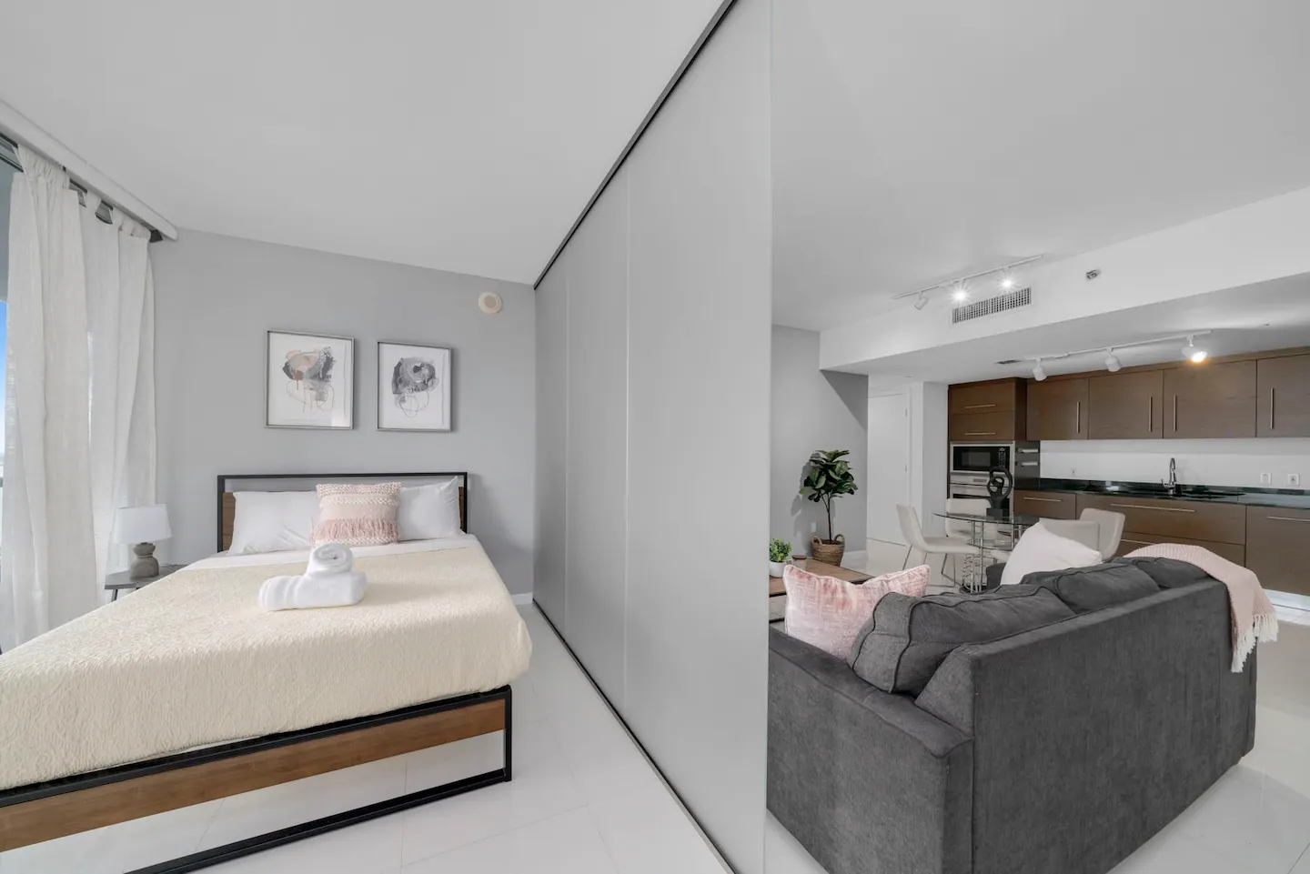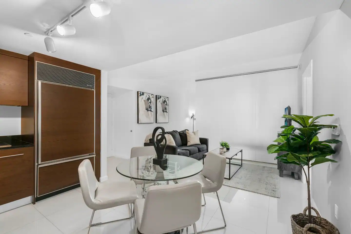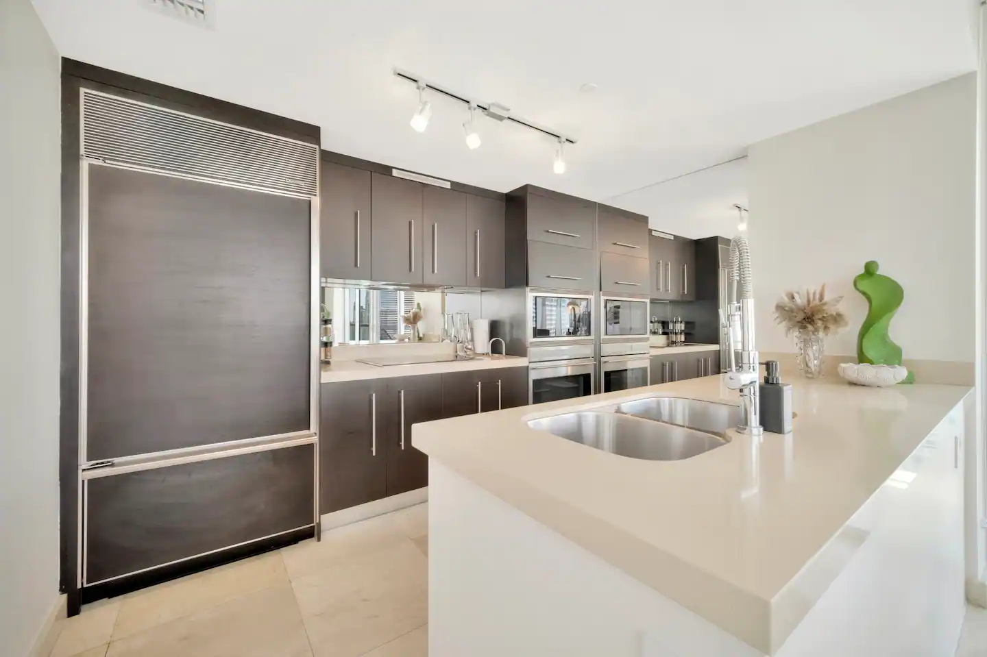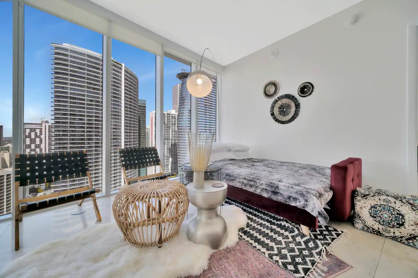 First on our list is the Icon, where luxury meets chill vibes in the heart of Brickell! This Insta-perfect, 1,350-square-foot pad offers stunning ocean and city views that’ll have your followers double-tapping quickly. This place is the real deal. Imagine kicking back in a king-sized bed or having the flexibility of two singles that magically transform into another king. And for the squad or fam, there’s a full-size sofa bed that’s more than just a crash pad – snooze-central. Each room is decked out with 4K smart TVs, so you can Netflix and chill after a day exploring the Magic City.