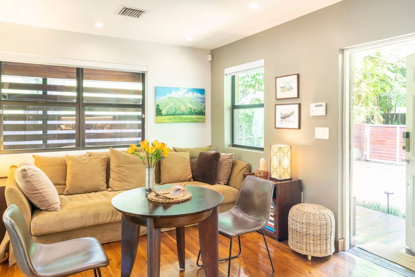 Indulge in the ultimate tropical escape at our enchanting guesthouse. Relax on your private deck amidst lush greenery & Costa Rican wood floors. Immerse yourself in a meticulously designed one-bedroom oasis with a fully furnished interior, incl. a well-equipped kitchen, coffee station, breakfast table, cozy living room, washer/dryer & blackout shades. Conveniently located near vibrant Downtown Coconut Grove, with easy access to Miami’s top attractions. Unwind & indulge in a captivating paradise.