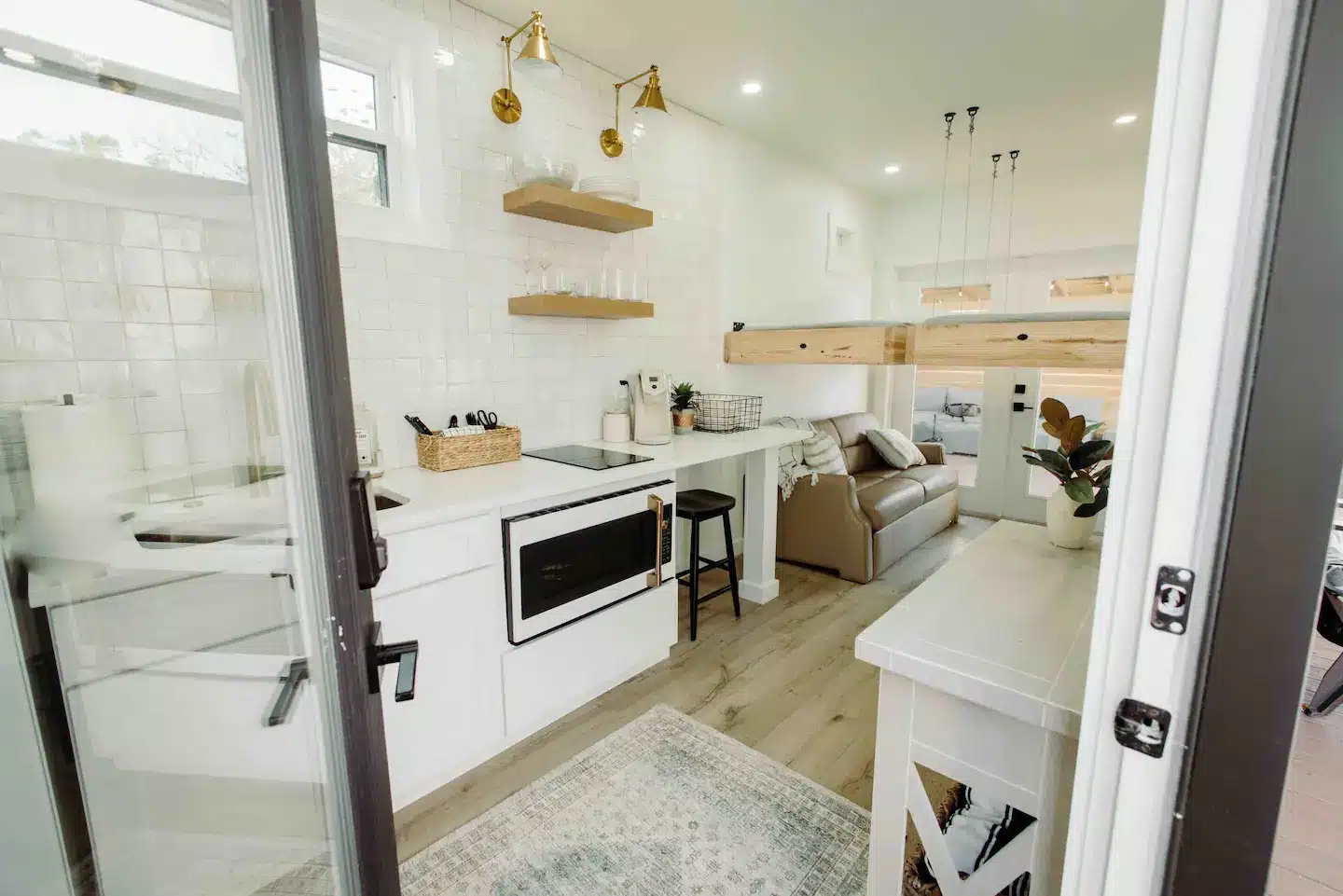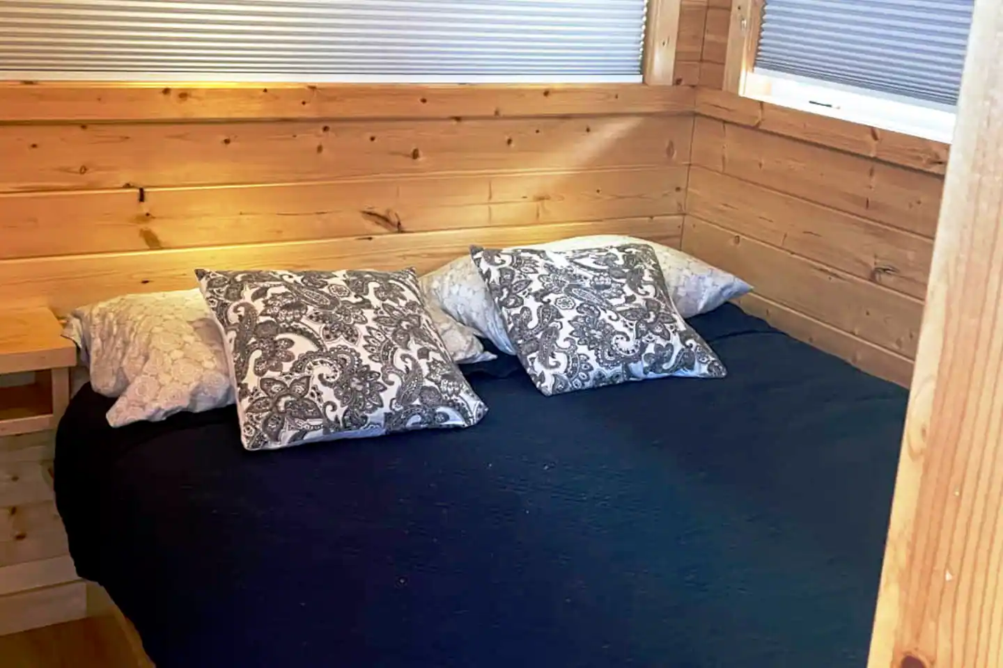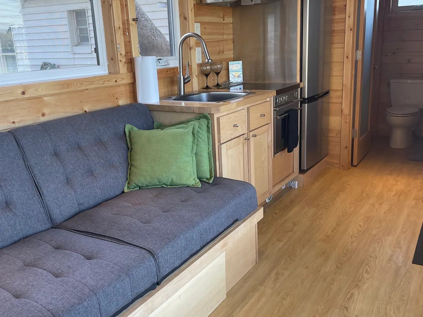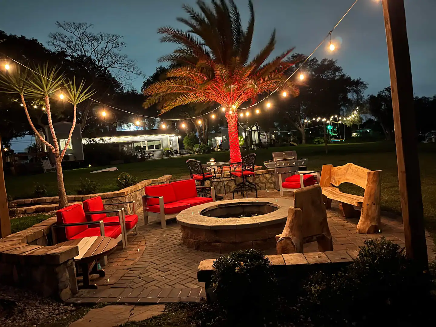 Out back, the setup is pure gold. A space designed for maximum relaxation and good times, with pergola lights setting the scene, a fireplace table for those heart-to-hearts, and a hot tub to unwind in as you star-gaze. Inside, the vibe continues with smart space utilization that doesn’t skimp on comfort. The queen bed promises dreamy nights, while twin Murphy beds in the living area add a dash of fun for the crew or fam.