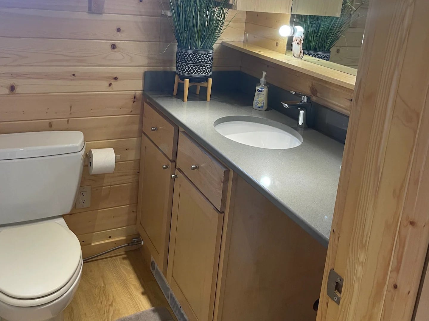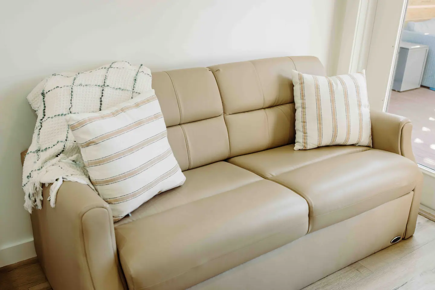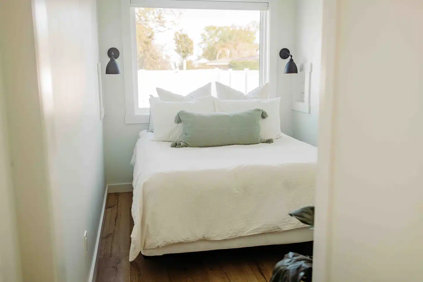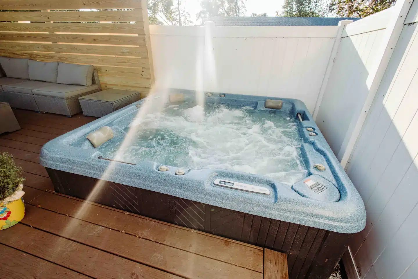 Out back, the setup is pure gold. A space designed for maximum relaxation and good times, with pergola lights setting the scene, a fireplace table for those heart-to-hearts, and a hot tub to unwind in as you star-gaze. Inside, the vibe continues with smart space utilization that doesn’t skimp on comfort. The queen bed promises dreamy nights, while twin Murphy beds in the living area add a dash of fun for the crew or fam.