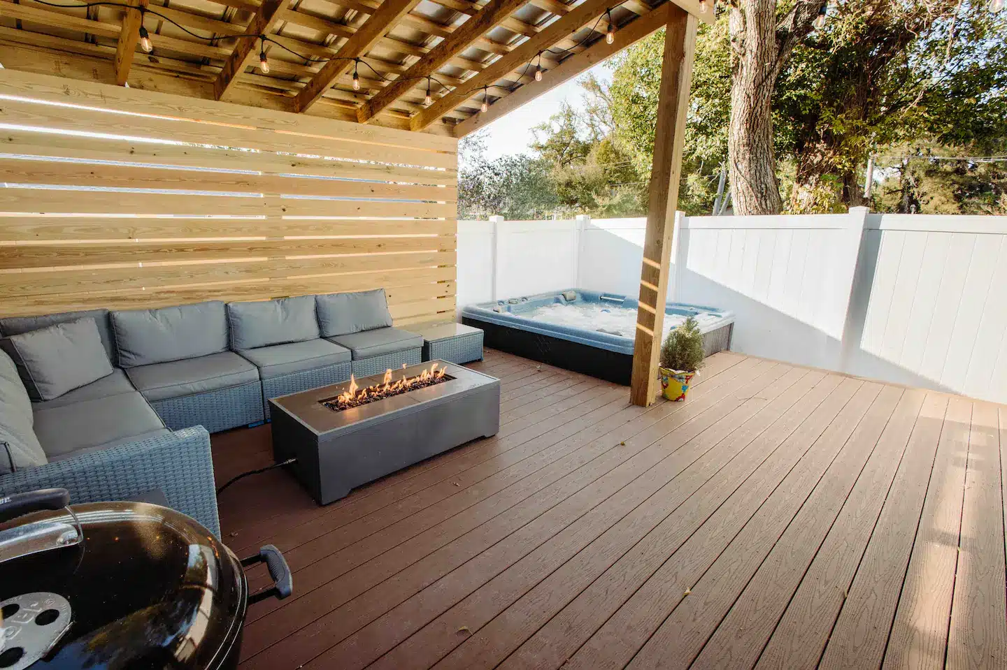 After a busy day in the parks or shopping, come back to a cozy outdoor paradise with lights strung up under a covered pergola. Lounge on the couch and enjoy a gas fireplace table, grill a meal, and soak your tired feet in the hot tub.