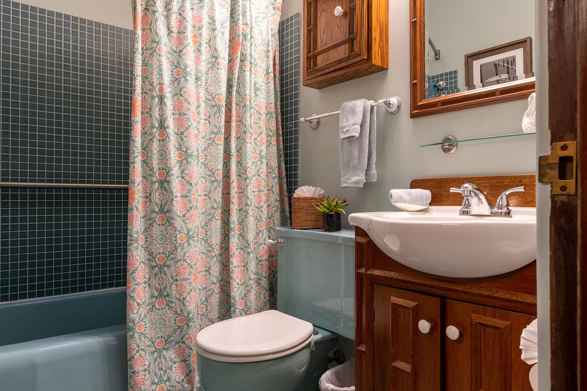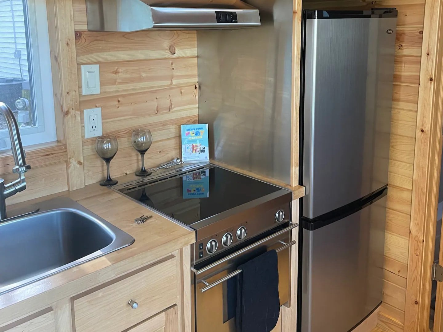 In the kitchenette you’ll find a sizable retro refrigerator, microwave/convection oven, 2-burner stove top, sink and stocked dishes for four people. Enjoy k-cups provided for the Keurig or take a quick drive over to Starbucks. Or our favorite option, try our local coffee shops: “Foxtail” or “Cups and Pups.”