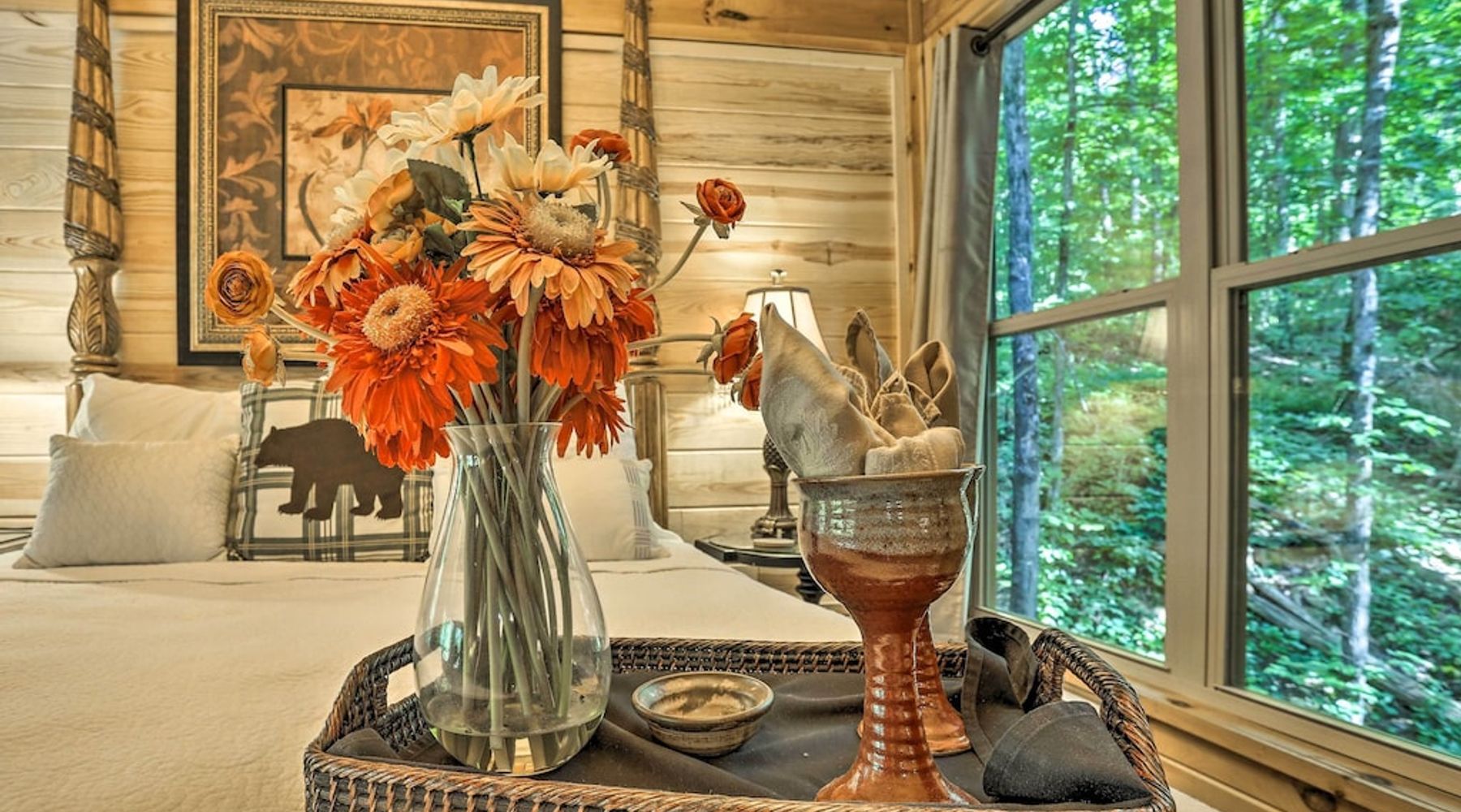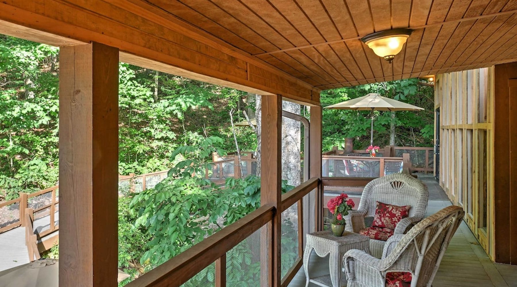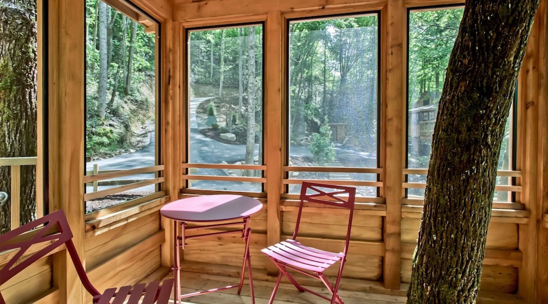 Lean against the trees that come through the deck as you gaze out over the forest below. Gentle birdcalls and the sound of wind through the branches will fill your ears, as the unmistakable clean air of the Great Smoky Mountains cycles through your lungs, replacing the toxins of the city with the purity of fresh air.