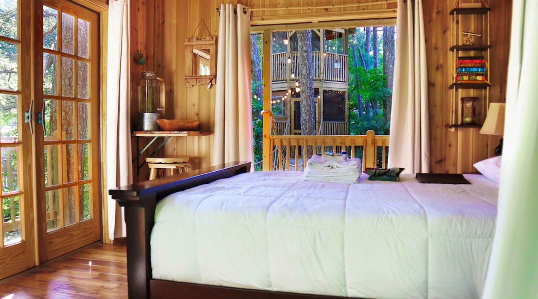 In contrast to the first treehouse on our list, this rental is a back-to-basics option that oozes charm. It’s more of a wooden glamping choice than a palatial mansion in the trees but that’s exactly why I like it.