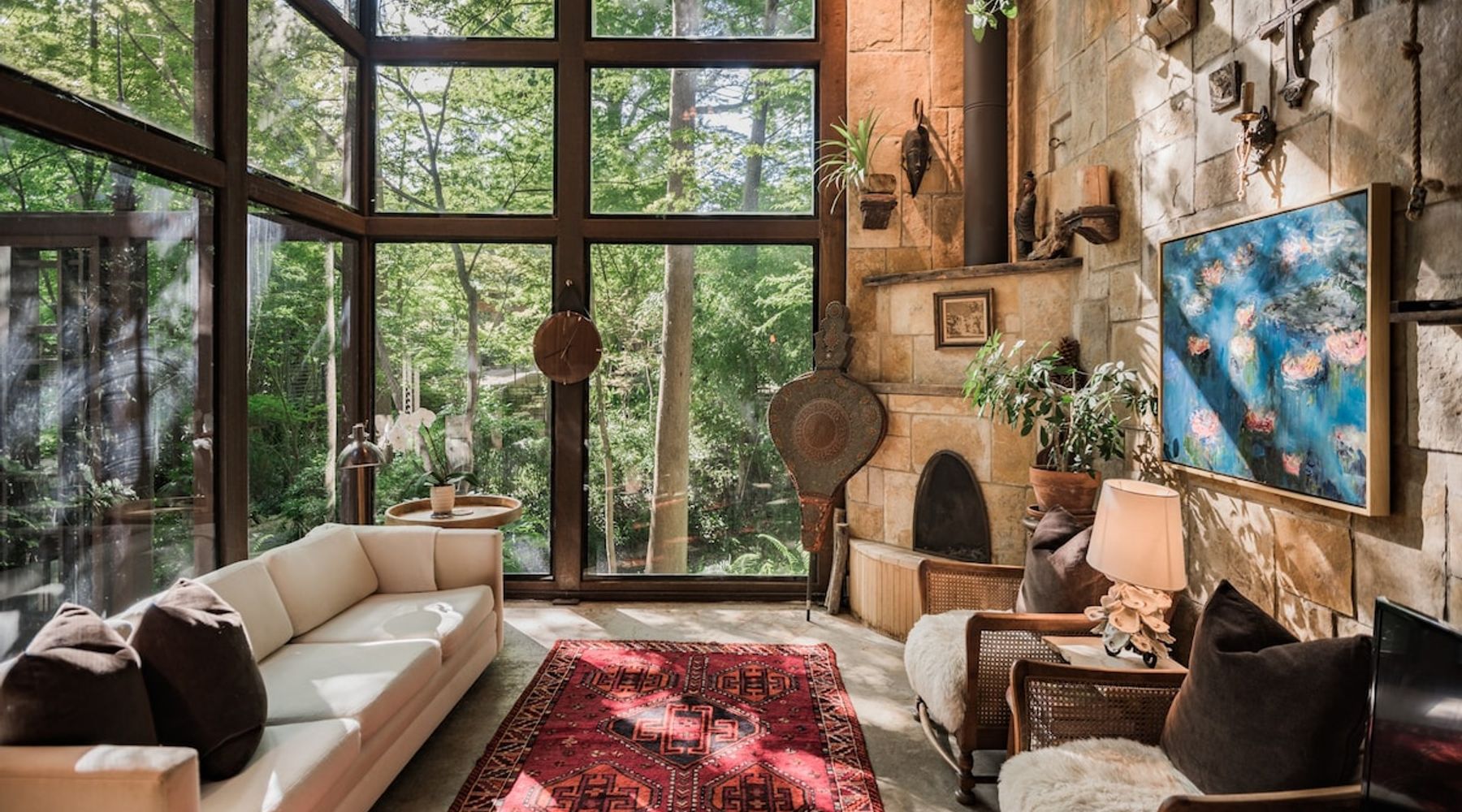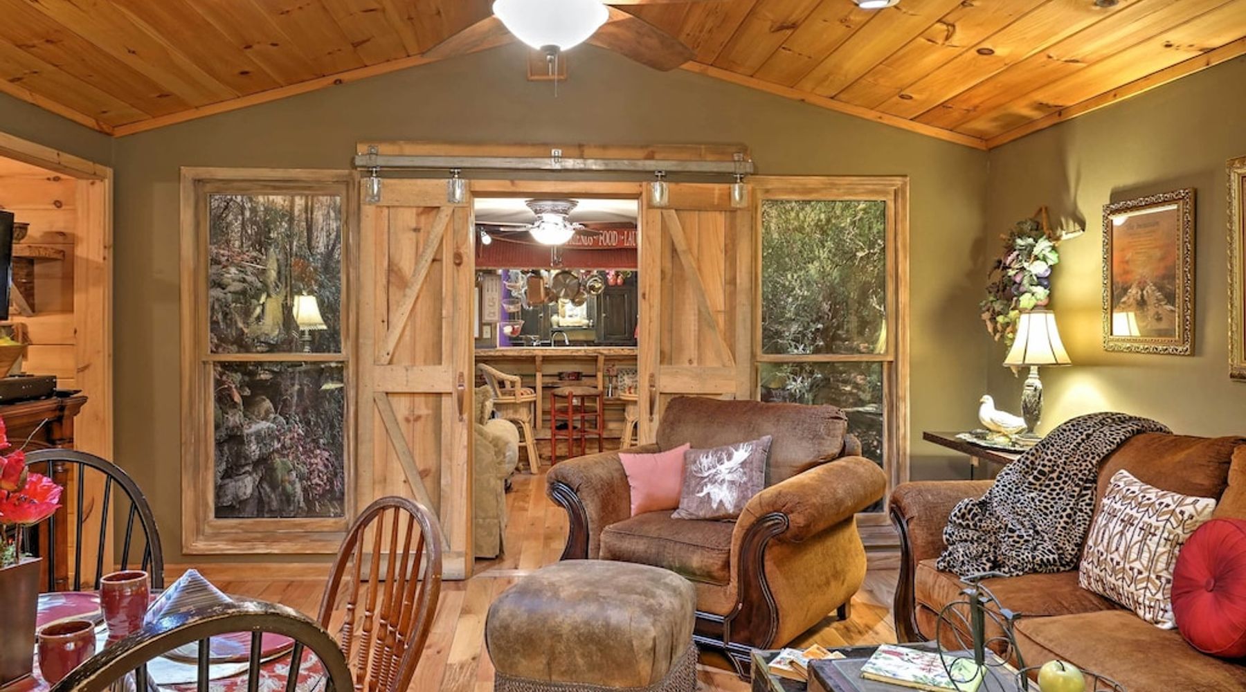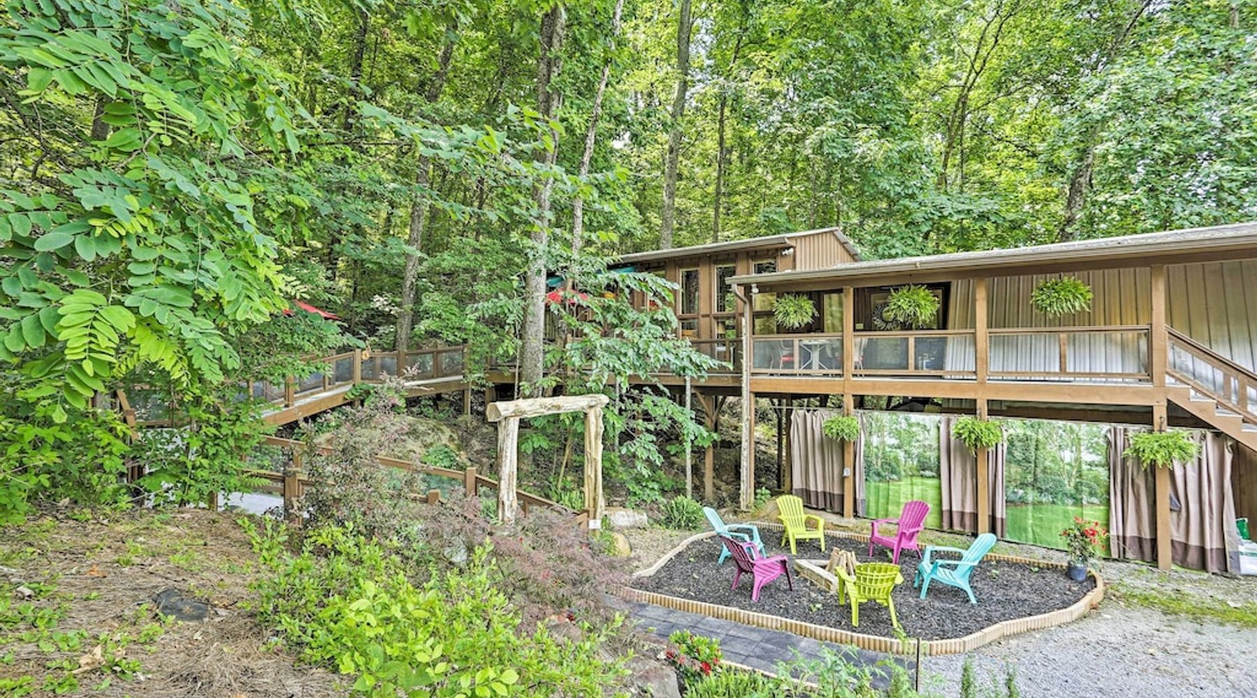 This home among the trees has 77 reviews on Airbnb, with an average rating of 4.79 out of 5 stars.